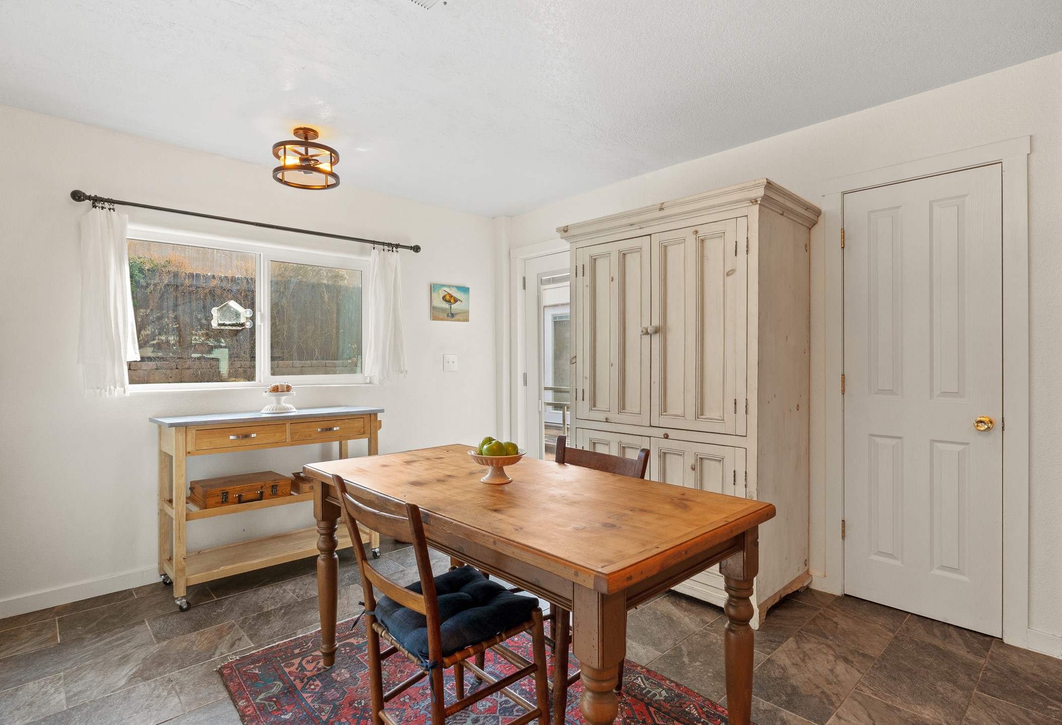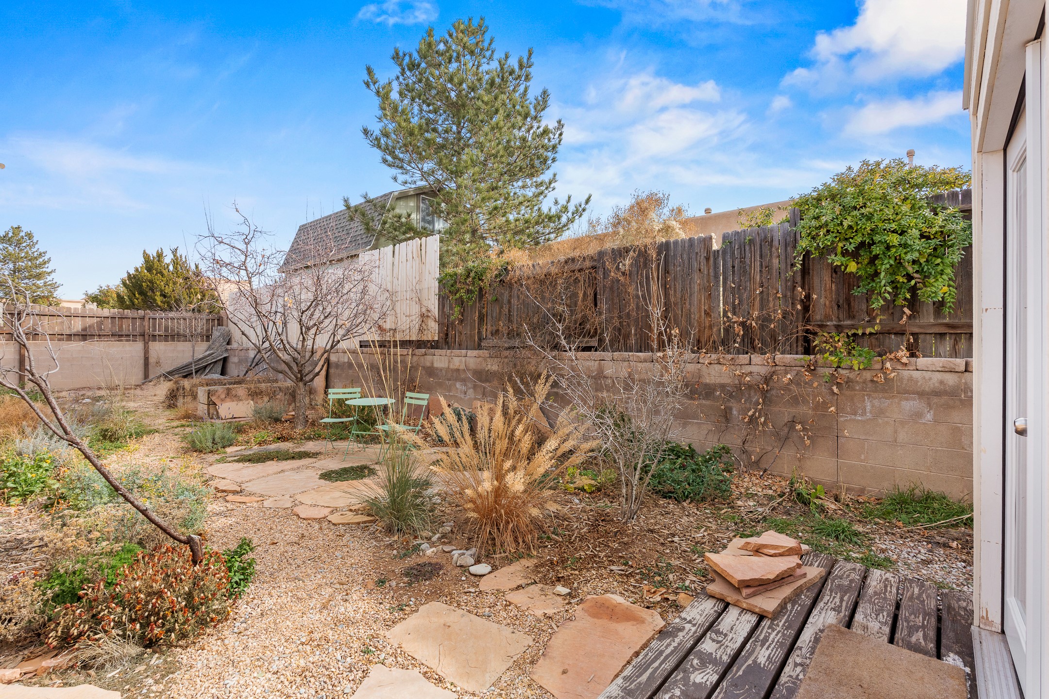This Pueblo-style home is offered at under $400,000 and is located on an oversized corner lot in the Tierra Contenta community. The property features mature trees, native landscaping, and full fencing/walls that provide additional privacy. Inside, the home includes modern light fixtures, contemporary ceiling fans, and newer plank-style flooring. The bright eat-in kitchen includes a spacious farm sink, filtered water system, dishwasher, stove, refrigerator, stone flooring, abundant cabinetry, and room for a generously sized dining table. The insulated double garage includes a 5' double-pane window that brings in natural north light, offering versatility for various types of work or creative use. The home also features double-pane windows throughout and a membrane roof. The backyard wraps around the home and includes a flagstone patio, lavender plants, and raised beds suitable for gardening. A finished shed with a pitched roof, skylights, and French doors provides additional usable space. The shed is insulated, air-conditioned, and designed for year-round functionality. Nearby community amenities include walking and hiking trails, recreational areas, and local facilities such as the Southside Library, Swan Park, and a nearby golf course. Access to these features is convenient from the property. This home offers flexibility for a variety of uses and lifestyles, with thoughtful indoor and outdoor spaces throughout.