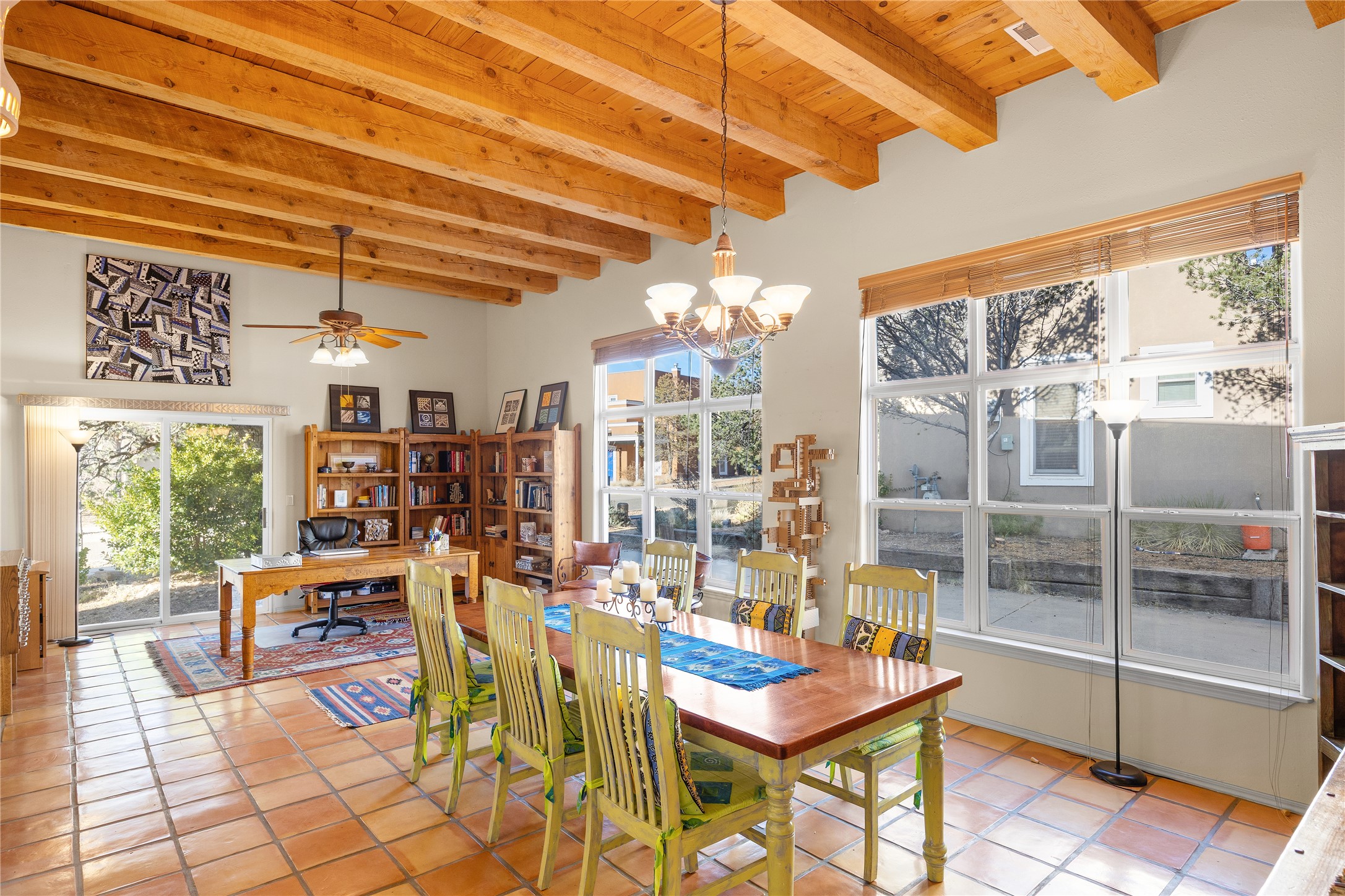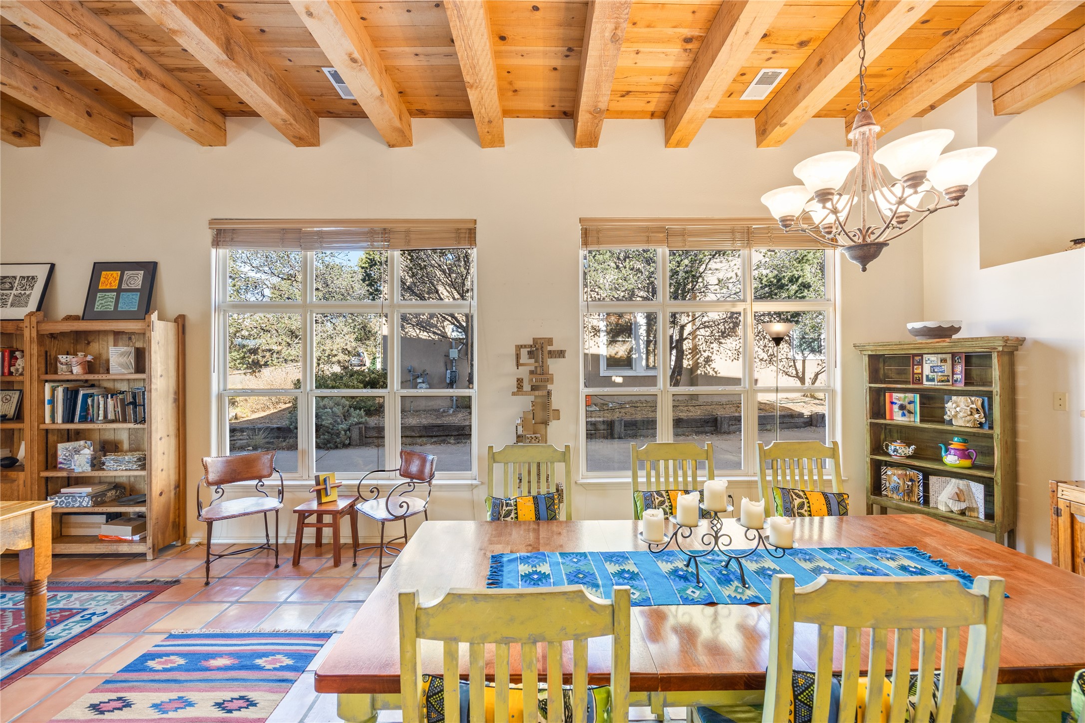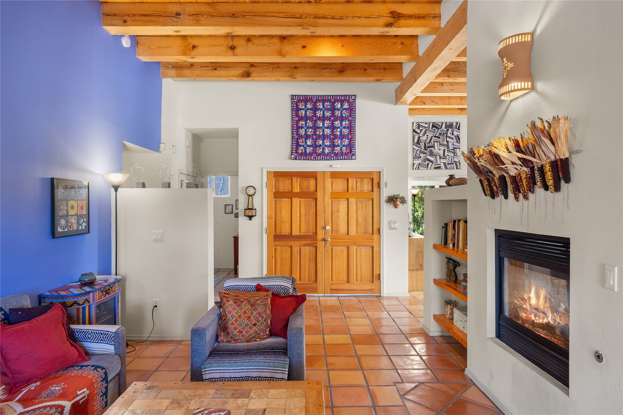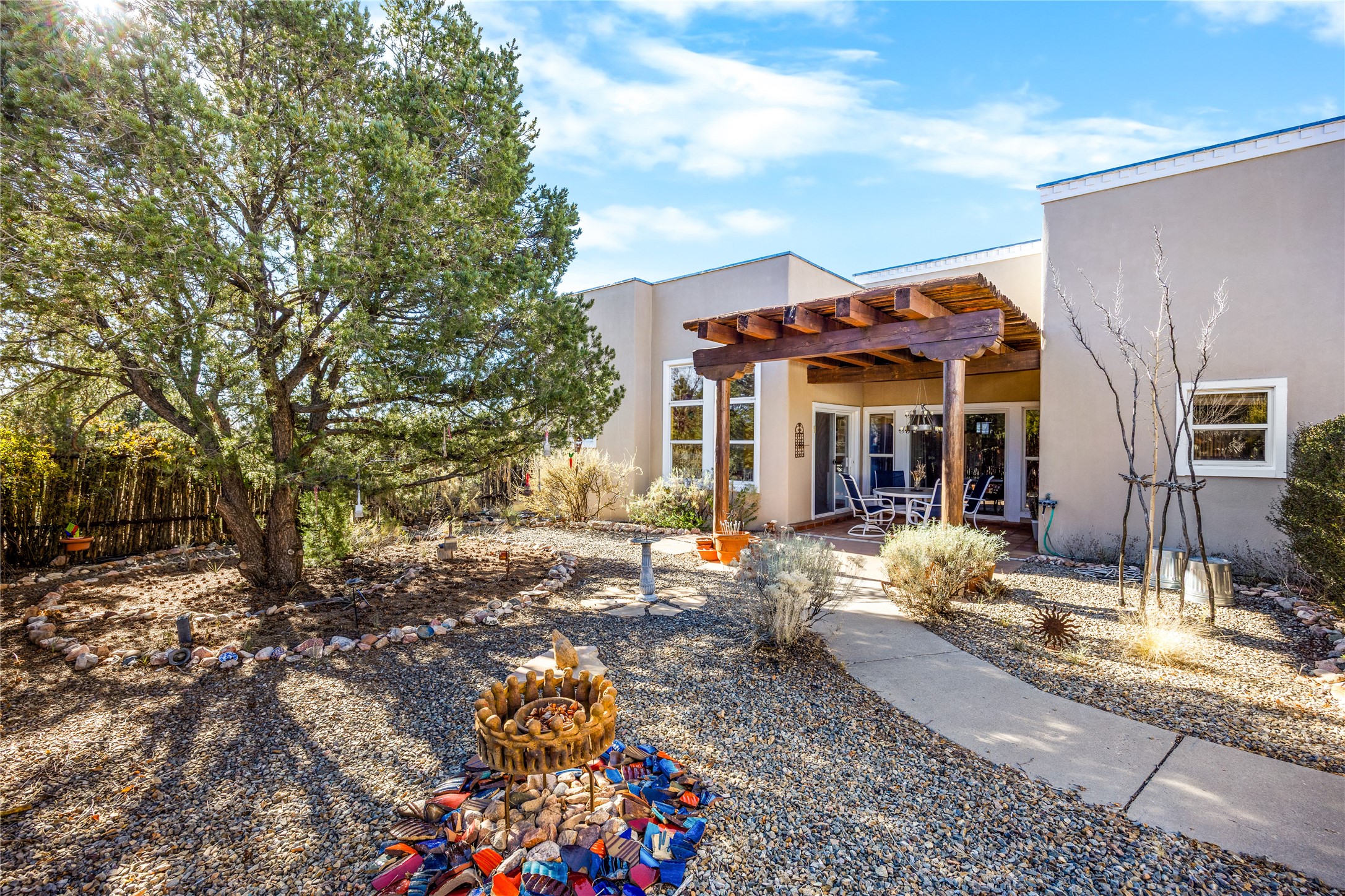 Get ready for this lovely, well cared for single level home in Nava Ade! Sited on a sizeable lot bordered on two sides by green space and adjacent to the walking path, this property features all the interior and exterior comforts that allow for authentic Santa Fe living. Enter through a sweet portal to a spacious Living Room with high ceilings adorned with wood beams. A decorative wall, which sports a two-sided gas fireplace, separates the Living Room and oversized Dining Room/Sitting Room. A wall of tall windows with wooden blinds graces this area. Beautiful Saltillo tile flooring adds to the warmth and Southwestern feeling of these rooms. Exit the Living Room through sliders that lead to a charming portal, ideal for outdoor entertaining. The whimsical rear yard provides a delightful retreat year-round! Custom shelving in all bedroom closets, and owner-made tin accents for the home's vertical blinds are thoughtful and creative touches. In addition to miles of walking paths, enjoy the community clubhouse, pool and gym. This much loved, special home will enchant its next lucky owner.