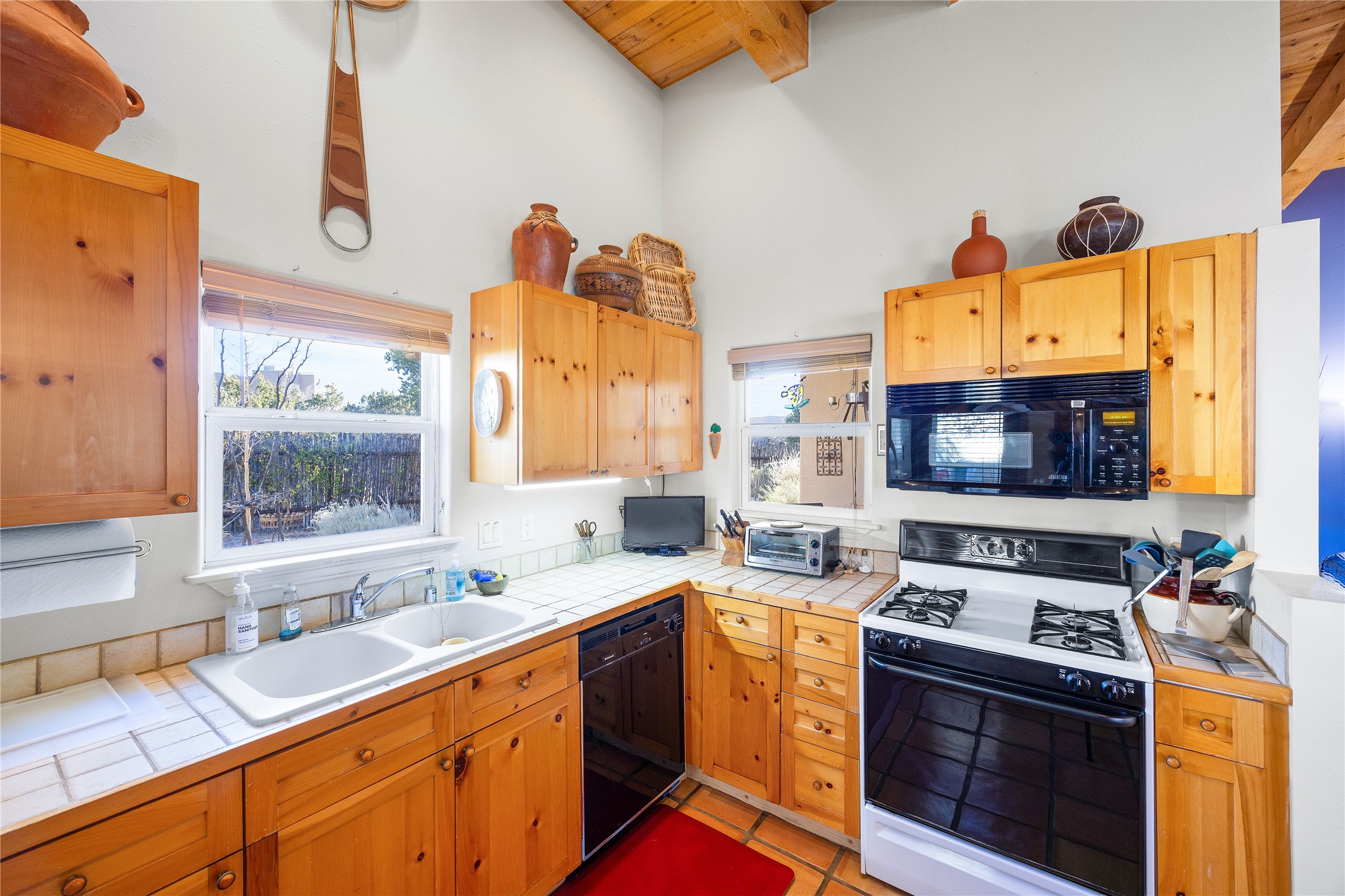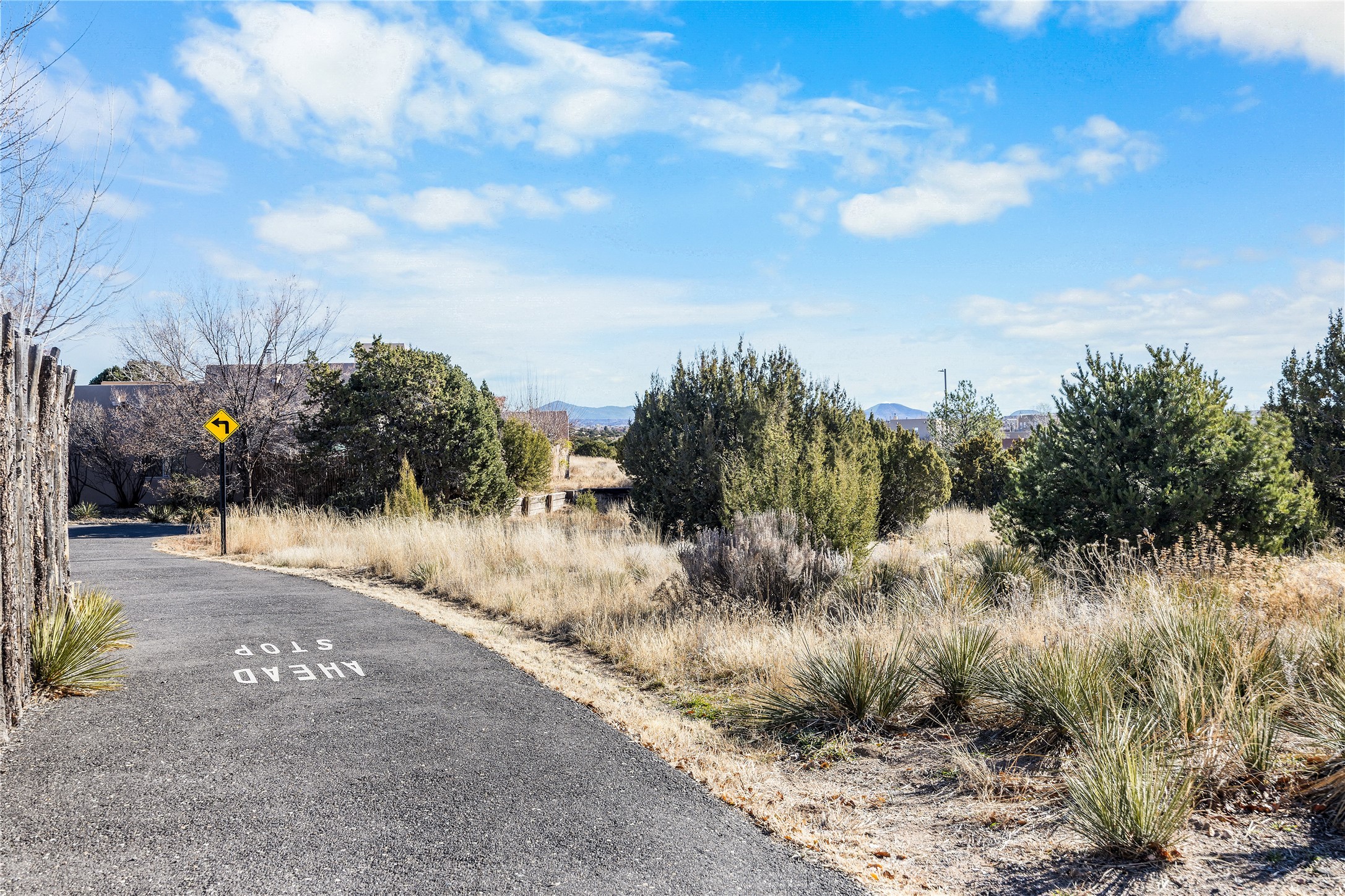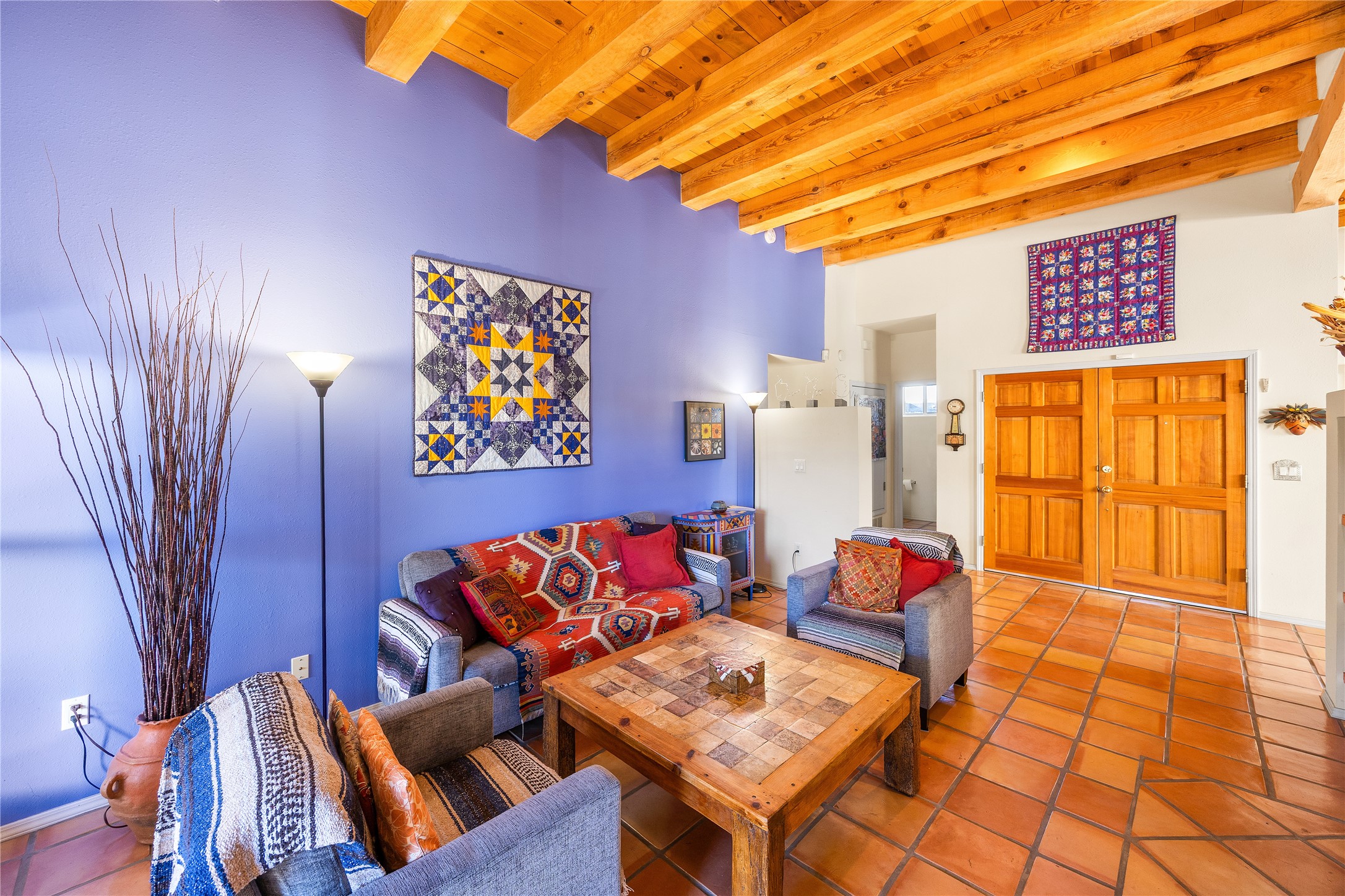 Get ready for this lovely, well cared for single level home in Nava Ade! Sited on a sizeable lot bordered on two sides by green space and adjacent to the walking path, this property features all the interior and exterior comforts that allow for authentic Santa Fe living. Enter through a sweet portal to a spacious Living Room with high ceilings adorned with wood beams. A decorative wall, which sports a two-sided gas fireplace, separates the Living Room and oversized Dining Room/Sitting Room. A wall of tall windows with wooden blinds graces this area. Beautiful Saltillo tile flooring adds to the warmth and Southwestern feeling of these rooms. Exit the Living Room through sliders that lead to a charming portal, ideal for outdoor entertaining. The whimsical rear yard provides a delightful retreat year-round! Custom shelving in all bedroom closets, and owner-made tin accents for the home's vertical blinds are thoughtful and creative touches. In addition to miles of walking paths, enjoy the community clubhouse, pool and gym. This much loved, special home will enchant its next lucky owner.