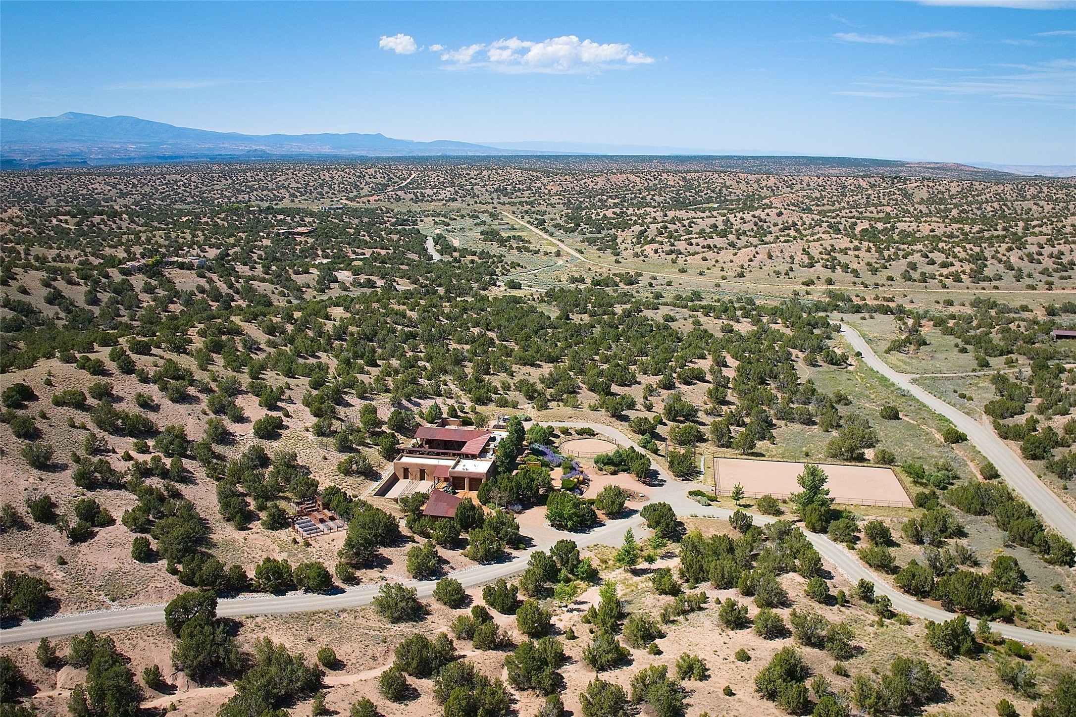 Stunning elevated 360 view building site in the prestigious La Tierra Nueva community, capturing unobstructed vistas of the Sangre de Cristo and Jemez Mountains. Set on 25+ private acres, this exceptional parcel offers an extraordinary opportunity to create a world-class residence in one of Santa Fe's most sought-after equestrian enclaves, complete with ride-out access to BLM land.The property currently features an impeccable, well-designed and appointed 3-bedroom guest complex and luxury stables--with sala, office, and studio-- all in place for comfortable and enjoyable living while the main residence is being built.Located within a gated community just 6 minutes from The Club at Las Campanas (memberships available for purchase upon approval), the property offers convenience without compromising privacy or serenity.Enjoy the rich cultural offerings that define Santa Fe living, including the Santa Fe Opera, Santa Fe Symphony, annual chamber music festival, world-renowned art galleries, museums, and exceptional dining.A rare combination of breathtaking views, high-quality existing improvements, and the perfect setting to build your dream estate.