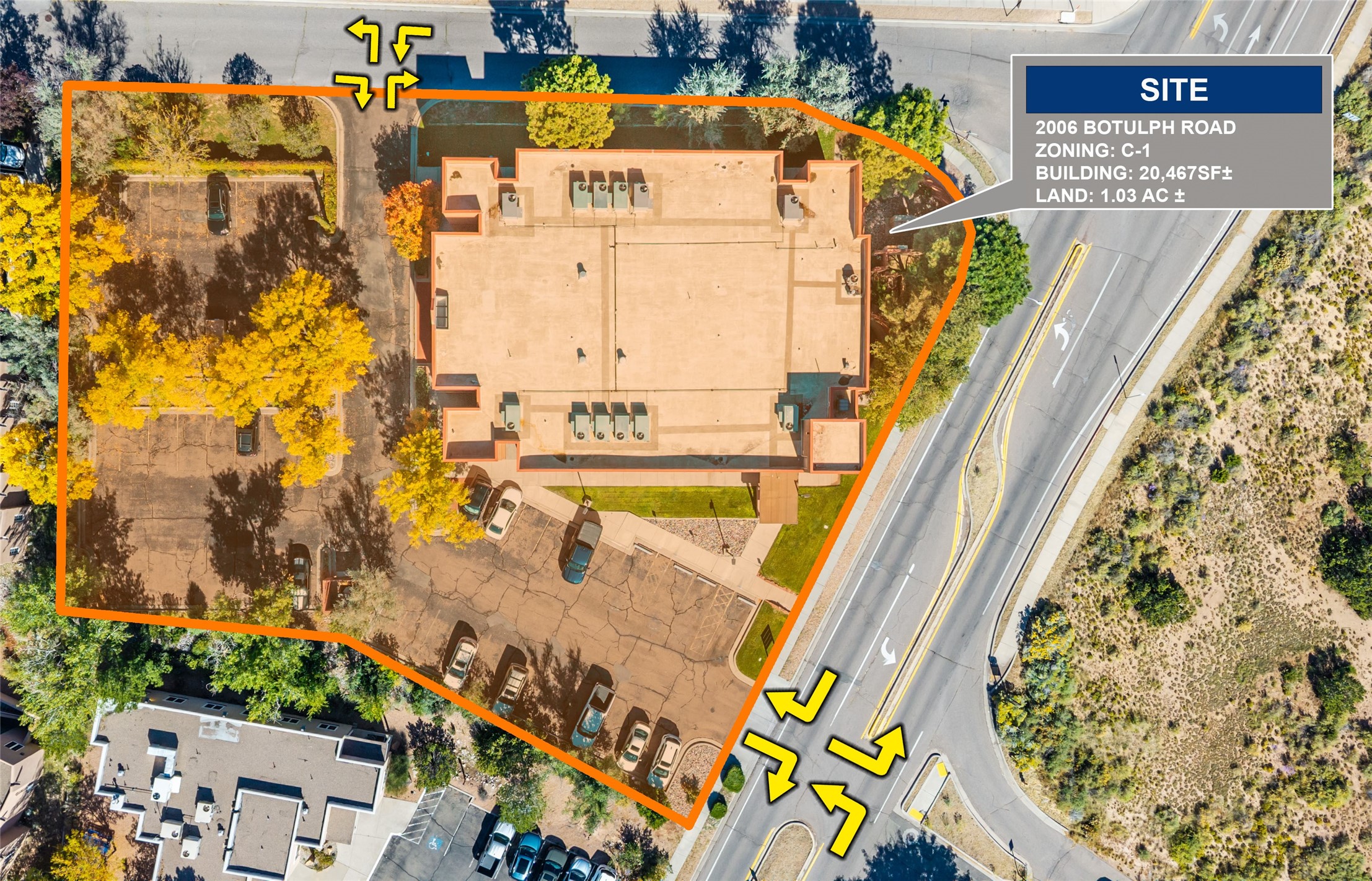The Catron Building at 2006 Botulph Road is a well-located, two-story professional office property in the heart of Santa Fe's medical and business corridor. Offering 20,467 square feet on 0.90 acres, the building provides flexible suite configurations, excellent natural light, ADA-accessible restrooms, and elevator service. The property is ideal for medical, dental, behavioral health, administrative office, or professional services users. Currently, the building offers a balanced mix of leased suites and 11,323 RSF of vacancy, allowing versatile pathways for owner-users, investors, or businesses seeking a full-building HQ near Christus St. Vincent Hospital, St. Michael's Drive, and I-25. A fresh asphalt overlay, restriped 54-space parking lot, and mature landscaping make this an attractive and functional home for a wide range of professional uses. Zoning is C-1, permitting a variety of commercial and office applications. LOCATION: Situated just off St. Michael's Drive, this property offers seamless access to Santa Fe's medical hub, downtown, Hwy 285, and I-25. The immediate area includes medical clinics, law firms, financial services, and professional offices. The location serves both local residents and the region's robust healthcare community.