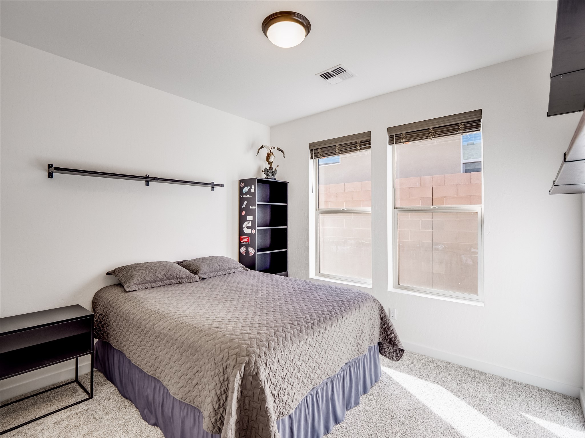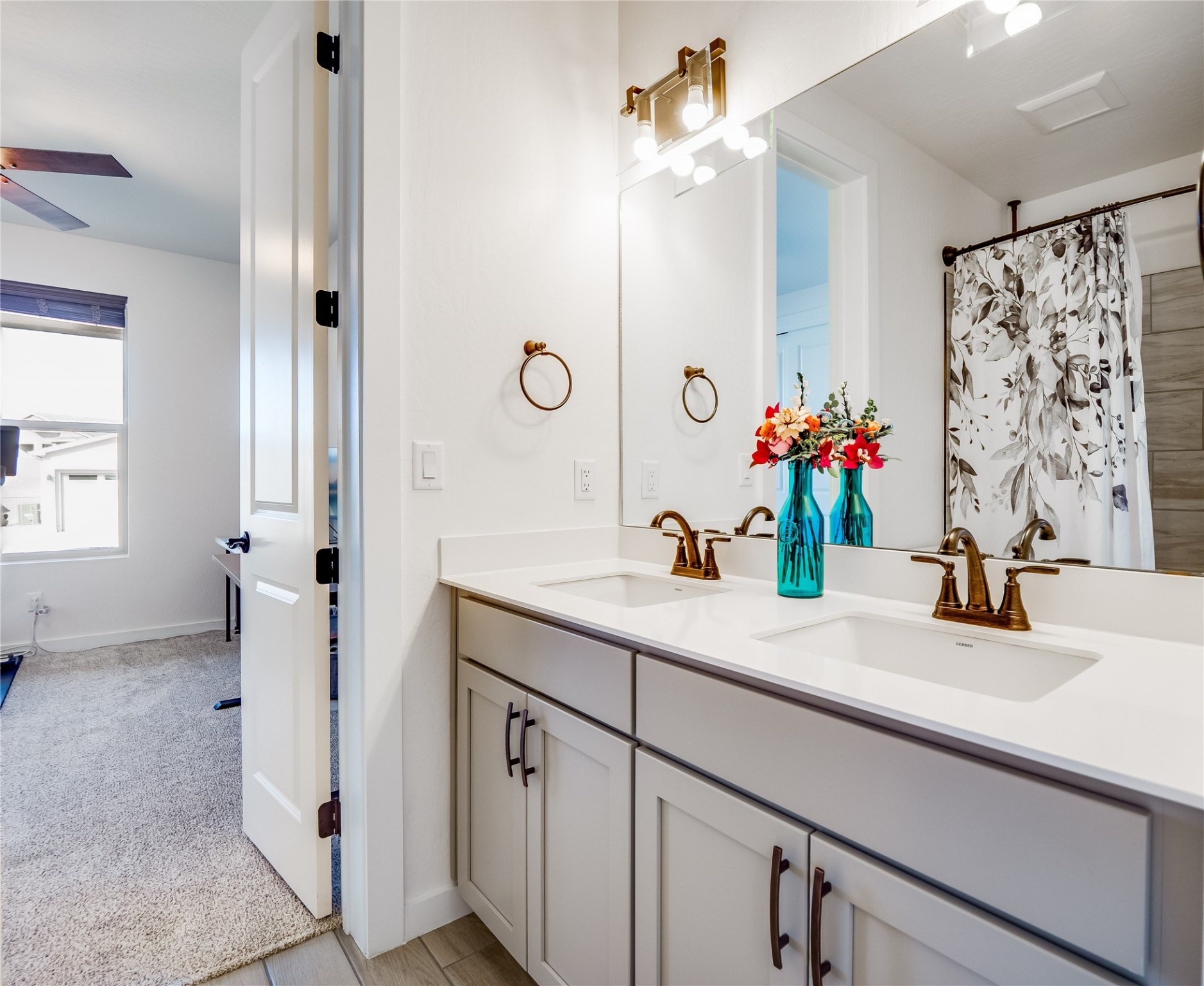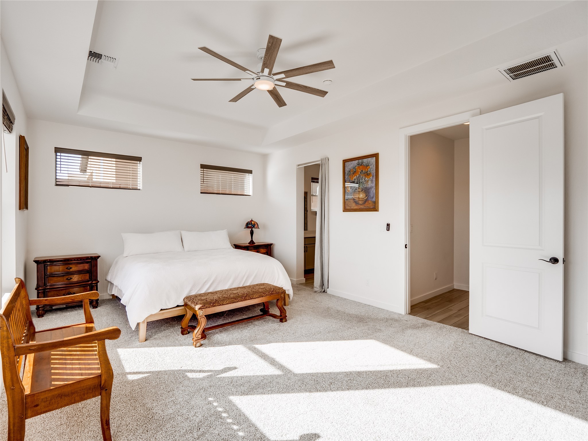 Gorgeous single level modern home blends clean design, natural light, and effortless livability in the desirable White Rock community. A low maintenance front yard invites you to a covered porch, creating welcoming curb appeal without the burden of upkeep. Step inside to a long, skylit foyer with durable tile flooring that flows through the main living areas. Natural light leads you into a bright, great room layout. The spacious living room easily accommodates a large sectional, perfect for movie nights and everyday comfort. Centered is a gas fireplace with decorative tile surround, framed by built-in cabinets for style and storage. The adjacent kitchen offers modern sophistication with warm, cohesive finishes. A large center island provides seating and workspace, highlighted by gold pendant lighting. Taupe cabinets with bronze hardware pair beautifully with a white tile backsplash, quartz counters, and stainless steel appliances. A sizable pantry enhances organization and convenience. The dining area features sliding doors that open to a covered patio and a fully fenced backyard designed for low-maintenance enjoyment. Complete with turf, trees, and mountain views, the space offers room for creativity, ideal for, planters, or personal design. Near the entry, two guest bedrooms with carpet share a Jack-and-Jill full bathroom for a smart, efficient layout. A secondary hallway hosts an additional guest bedroom and bathroom with single sink vanity and tiled walk-in shower with glass enclosure. This hall also includes a laundry room with sink and direct access to the two-car garage for added practicality. Tucked toward the back, the primary suite serves as a peaceful retreat with carpet flooring, expansive windows, and mountain views. The spa like ensuite features tile flooring, double-sink vanity, and a walk-in tiled shower with built-in bench. A custom-organized walk-in closet maximizes storage. Move-in ready and waiting for you to schedule your tour today!