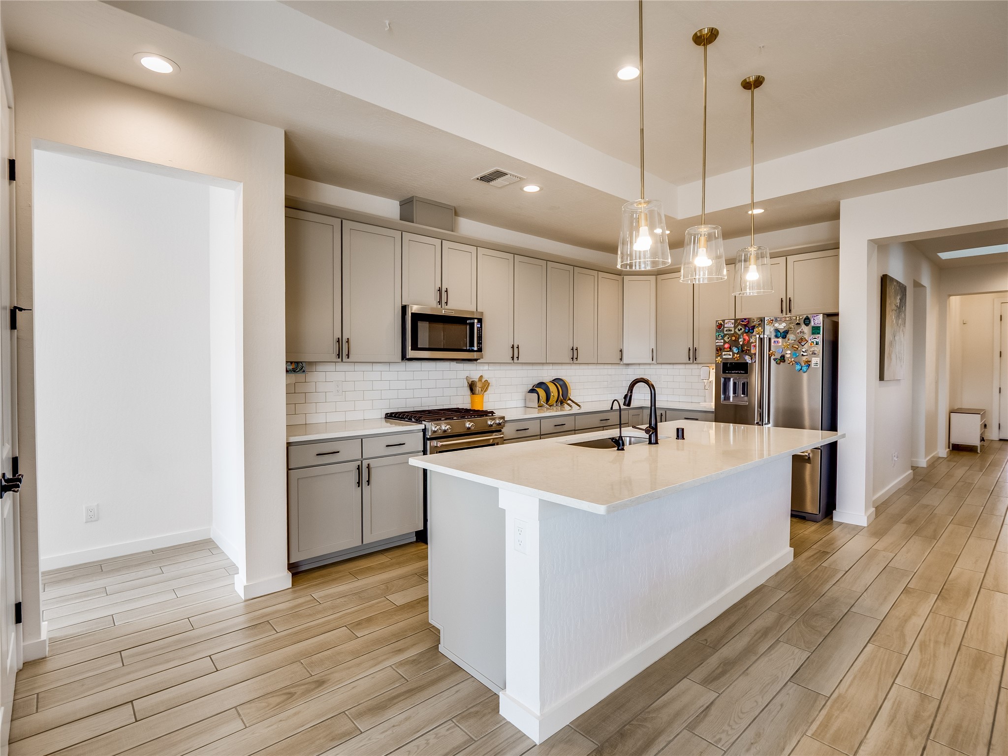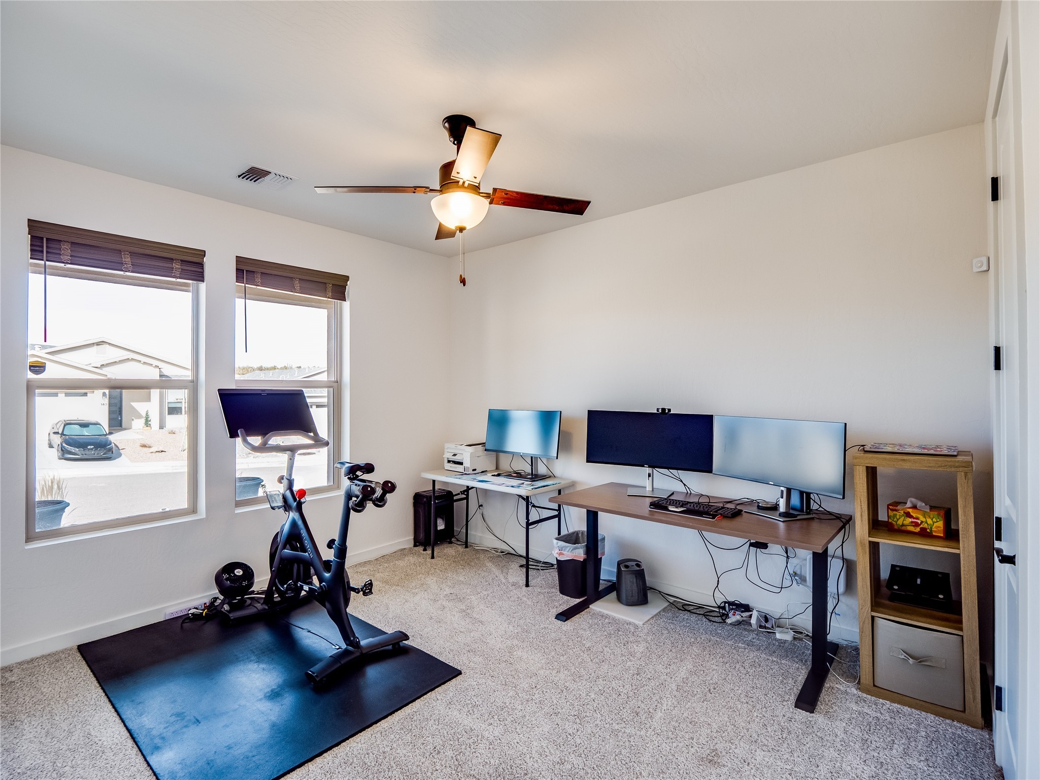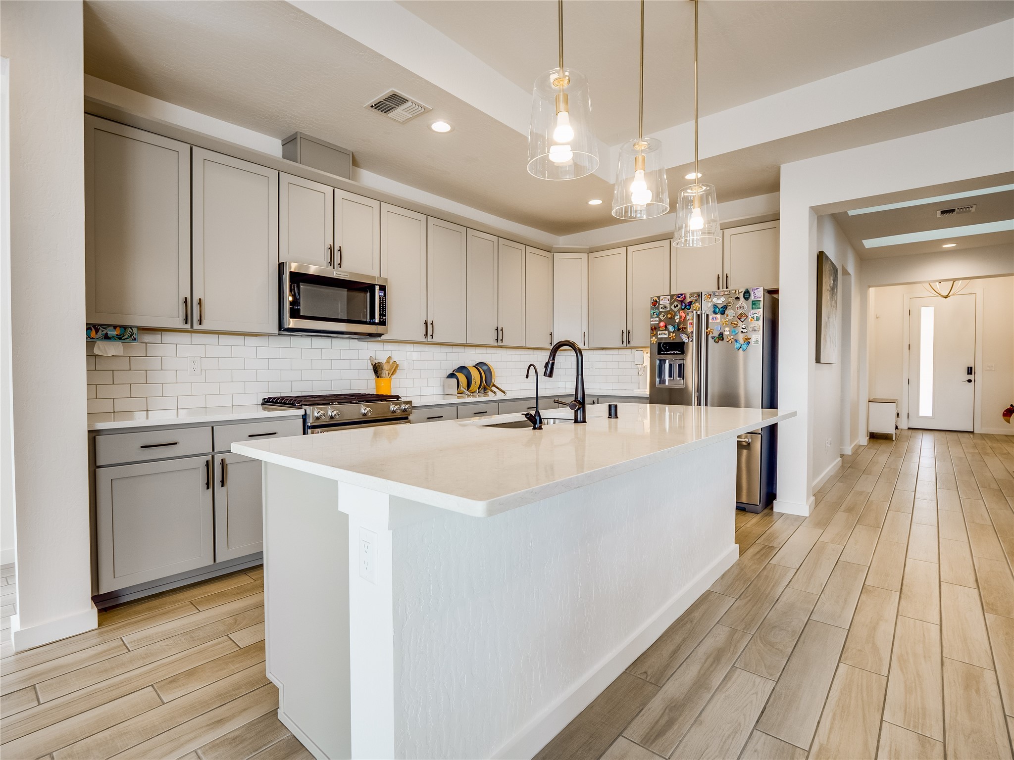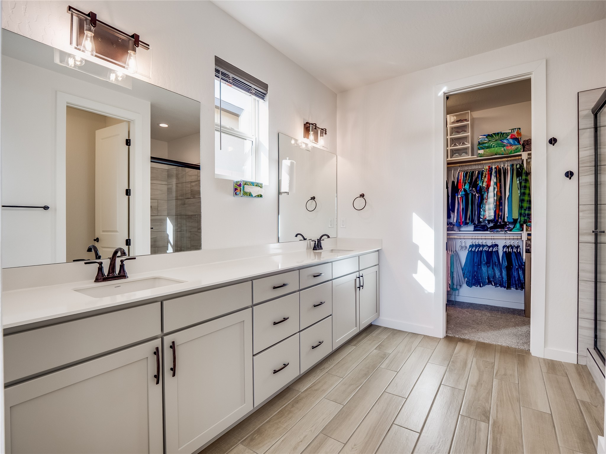 Gorgeous single level modern home blends clean design, natural light, and effortless livability in the desirable White Rock community. A low maintenance front yard invites you to a covered porch, creating welcoming curb appeal without the burden of upkeep. Step inside to a long, skylit foyer with durable tile flooring that flows through the main living areas. Natural light leads you into a bright, great room layout. The spacious living room easily accommodates a large sectional, perfect for movie nights and everyday comfort. Centered is a gas fireplace with decorative tile surround, framed by built-in cabinets for style and storage. The adjacent kitchen offers modern sophistication with warm, cohesive finishes. A large center island provides seating and workspace, highlighted by gold pendant lighting. Taupe cabinets with bronze hardware pair beautifully with a white tile backsplash, quartz counters, and stainless steel appliances. A sizable pantry enhances organization and convenience. The dining area features sliding doors that open to a covered patio and a fully fenced backyard designed for low-maintenance enjoyment. Complete with turf, trees, and mountain views, the space offers room for creativity, ideal for, planters, or personal design. Near the entry, two guest bedrooms with carpet share a Jack-and-Jill full bathroom for a smart, efficient layout. A secondary hallway hosts an additional guest bedroom and bathroom with single sink vanity and tiled walk-in shower with glass enclosure. This hall also includes a laundry room with sink and direct access to the two-car garage for added practicality. Tucked toward the back, the primary suite serves as a peaceful retreat with carpet flooring, expansive windows, and mountain views. The spa like ensuite features tile flooring, double-sink vanity, and a walk-in tiled shower with built-in bench. A custom-organized walk-in closet maximizes storage. Move-in ready and waiting for you to schedule your tour today!