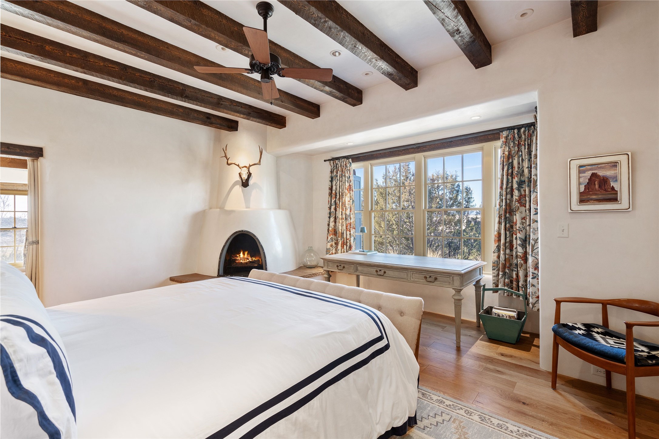 DESIGNED BY THE AWARD-WINNING ARCHITECTURAL FIRM OF CURTIS & WINDHAM ARCHITECTS, THIS SUPERB LAS CAMPANAS RESIDENCE ENJOYS THE TIMELESS HALLMARKS OF A TRADITIONAL FIRST-CLASS CUSTOM BUILD WITH EXQUISITELY LANDSCAPED GARDENS AND A WINDING PATH TO THE GUEST CASITA. Approach the home through tall natural grasses and glimpse the unique design element of wooden shutters on the windows, giving the home a European feel. Warm, rich woods throughout - most notably hand-crafted coffered ceilings, beautiful custom doors, and wooden floors as well as hand crafted tiles added by the current owners make for a sumptuous yet relaxed living space. The living room is expansive with tall windows, flanked by a handsome wall of built-in showcases, also added by the present owners, making several seating areas possible. The chef's kitchen offers a large island, top-of-the-line appliances and amenities plus a true walk-in pantry. While the property has sensational entertaining areas inside and out - the focus of this home is intimacy. High efficiency rastra type construction lends a solid, sturdy, quiet feel to the home and the enclosed rear garden is reminiscent of Provence - enjoy the sound of water from the fountain as you dine alfresco among a grove of Hawthorne trees. Rooftop deck. Excellent privacy on a large lot that spans two golf courses. Very special. Unique, one-of-a-kind property.