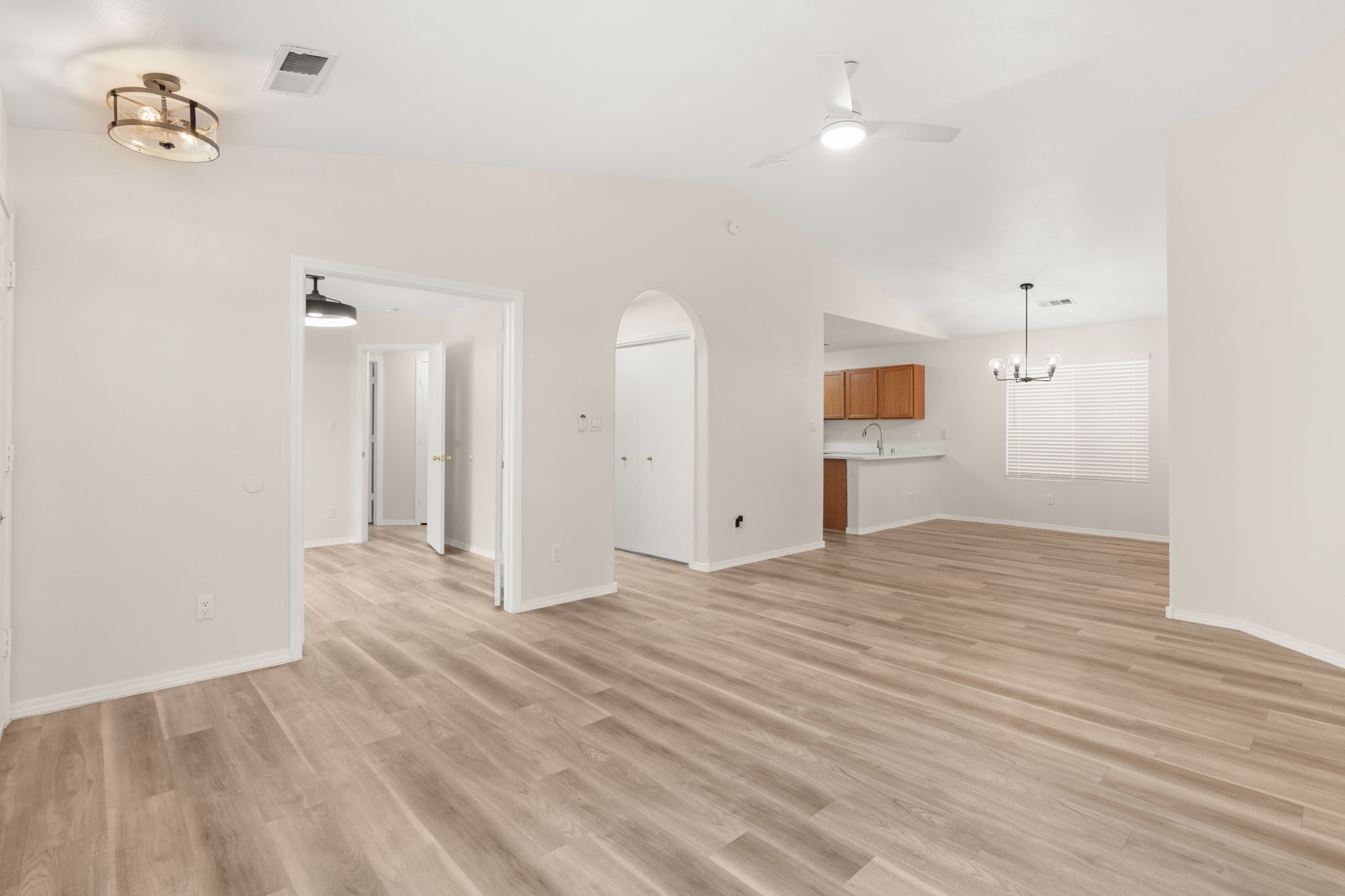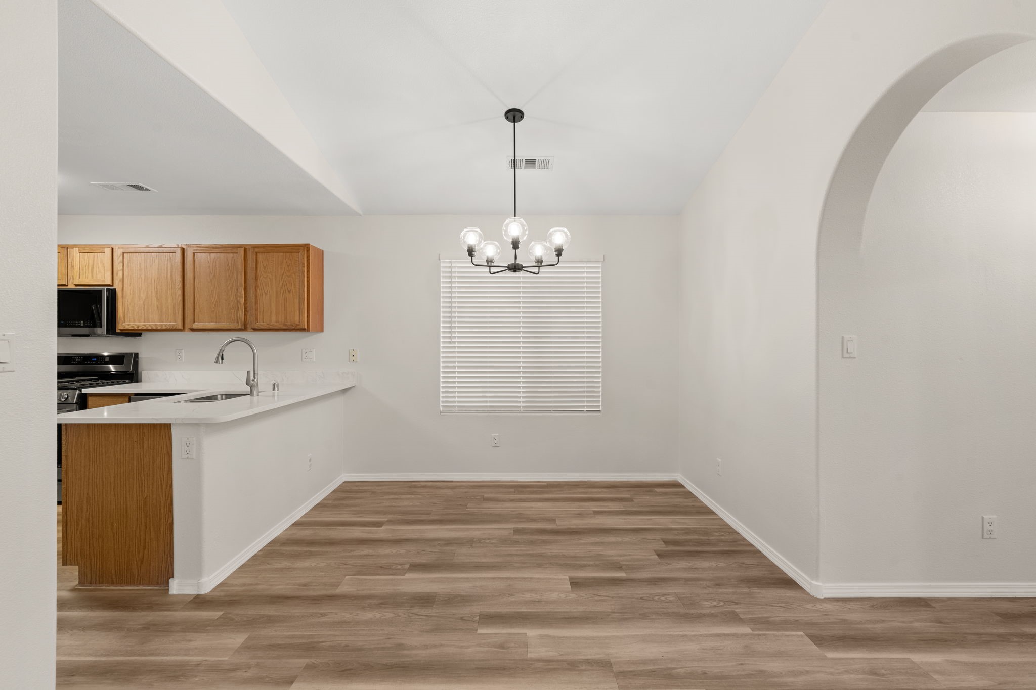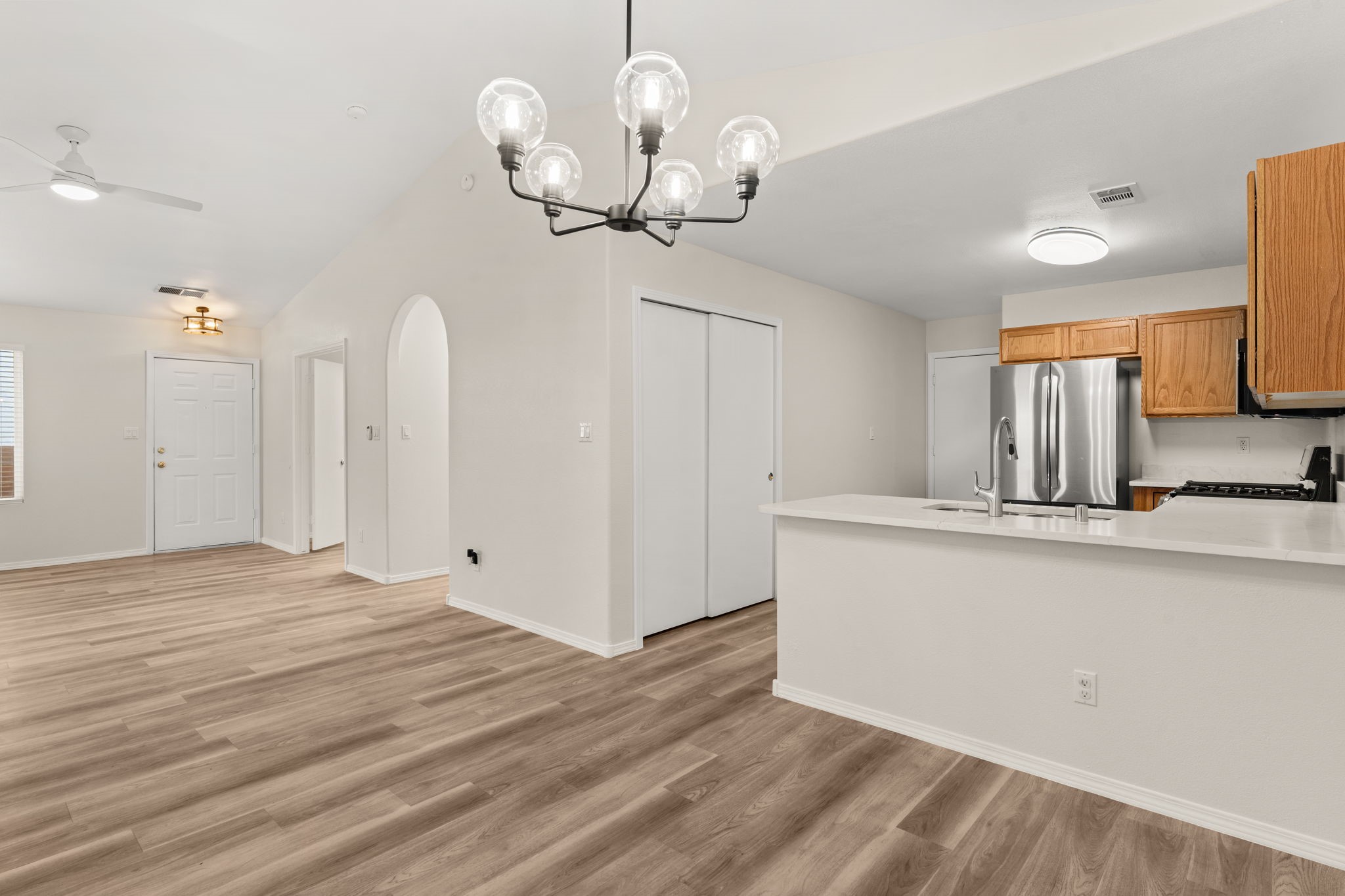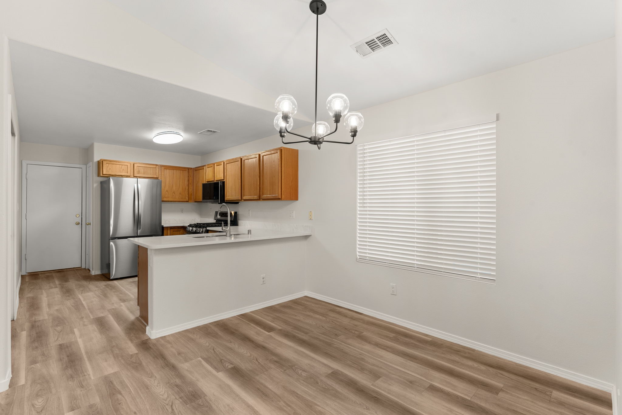 Refreshed Kitchen, take another look. Welcome to this beautifully updated home, situated in a small gated subdivision offering both comfort and privacy. Step inside to find all new LVT flooring and blinds throughout, complemented by fresh paint and modern updated lighting that create a bright and inviting atmosphere. Kitchen boasts all new stainless appliances and quartz counters. The vaulted ceilings enhance the spacious feel of the great room, while refrigerated air keeps the home cool and comfortable year-round. Enjoy the tranquility of the outdoors with a backyard that backs to open space and a walking path, offering extra privacy and the perfect setting for evening strolls or morning coffee. Move-in ready. Roof, HVAC and water heater all less than 6 years old.