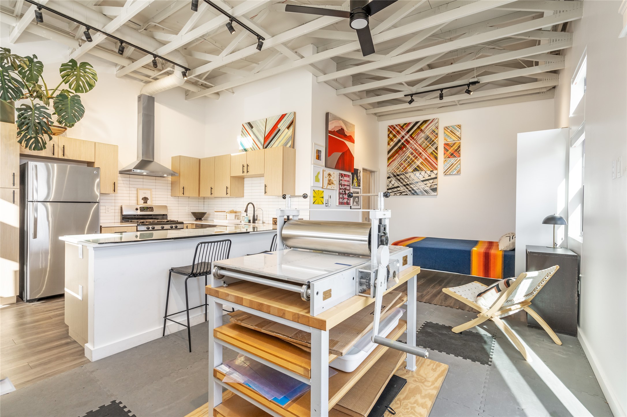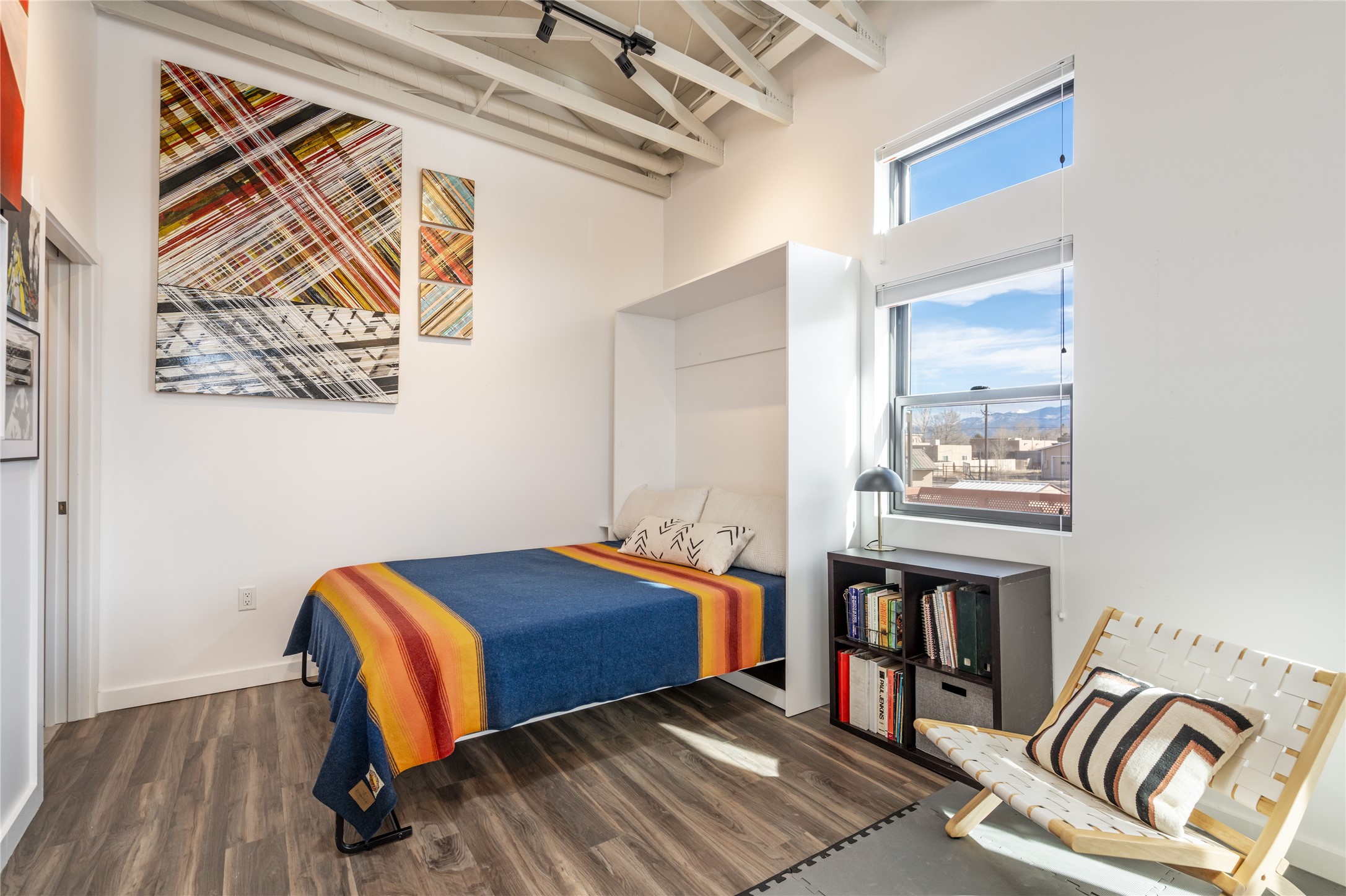 Corner unit with a wraparound balcony and mountain views in central Santa Fe, built in 2022 and lightly used, offering modern loft living and an ideal work-from-home setup. Approximately 1,126 square feet across two levels with an even split between floors, the east- and south-facing orientation fills the space with natural light throughout the day. Upstairs features an open studio-style living area, a luxury bathroom, and access to a private balcony to take in the mountain views. The kitchen is well-appointed with quartz countertops, subway tile backsplash, full-size appliances, and ample space for cooking. Downstairs showcases concrete floors, an ADA-compliant bathroom, large glass roll-up garage door, and useful storage closets, creating flexible space for work, studio, or showroom use. Both floors are equipped with mini-splits, blinds, ceiling fans, track lighting, and smooth drywall. Energy-efficient features include an on-demand water heater and two dedicated grid-tied solar panels. Washer and dryer hookups are in place (existing washer and dryer do not convey), and the Murphy bed does not convey. Hardwired for high-speed cable. HOA dues are $225 per month and include dumpster service, parking, landscaping, exterior building maintenance, and insurance, with an estimated $700 HOA sign-up fee.