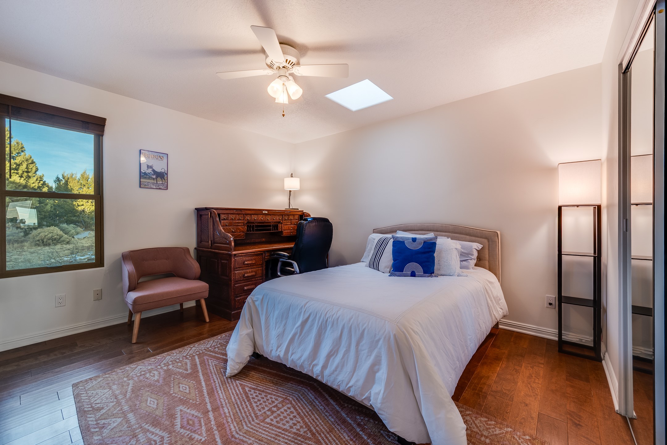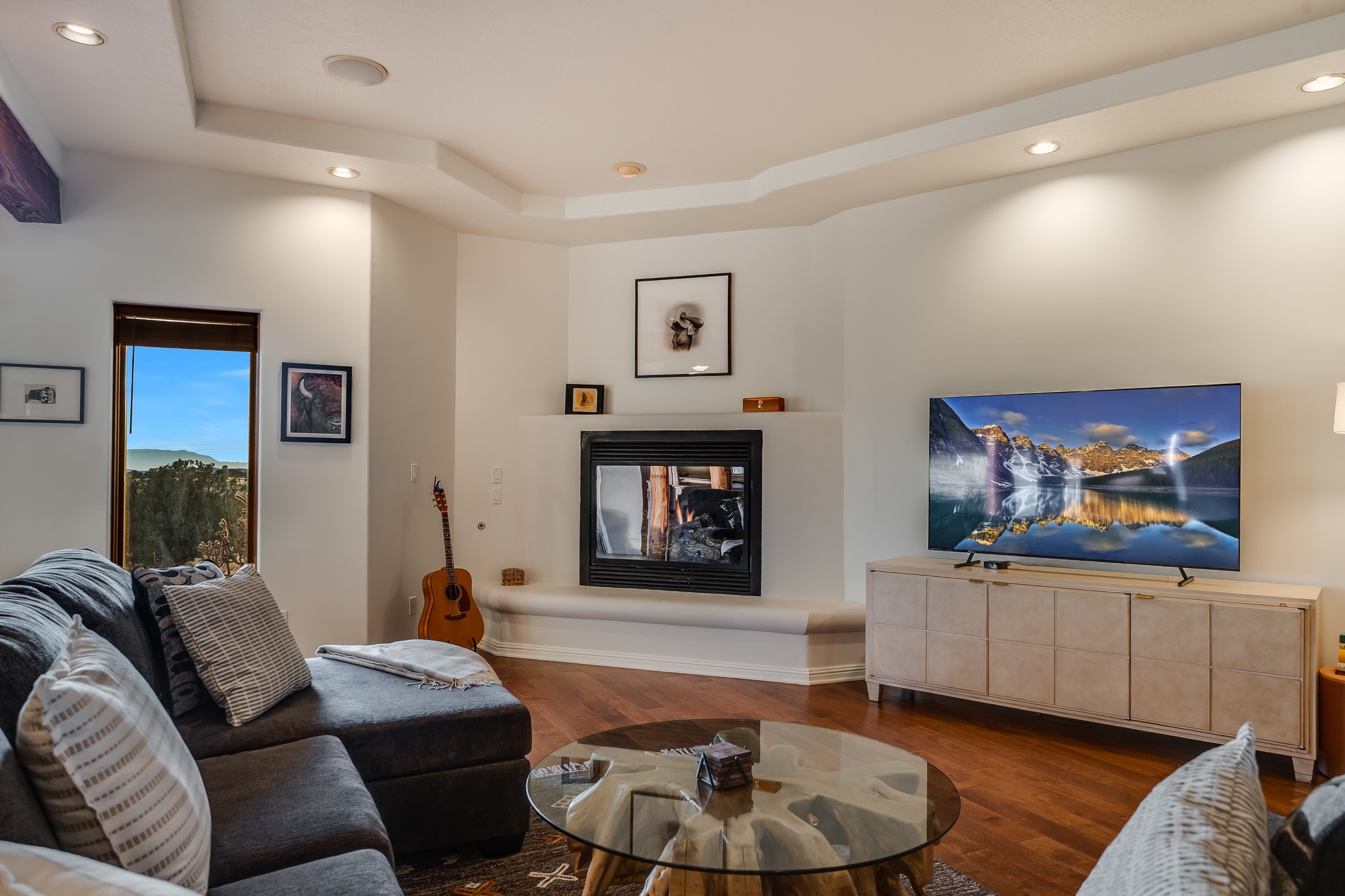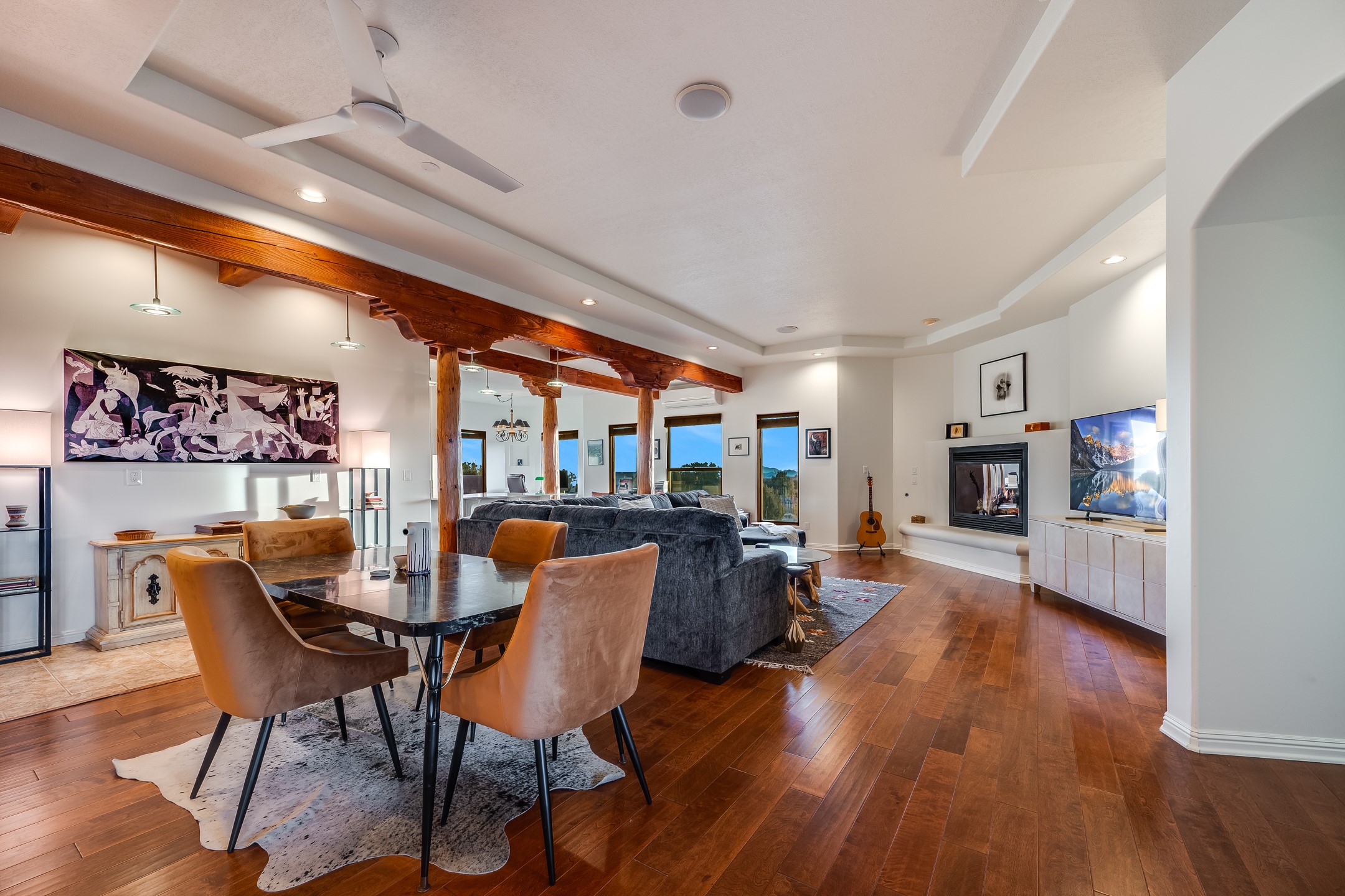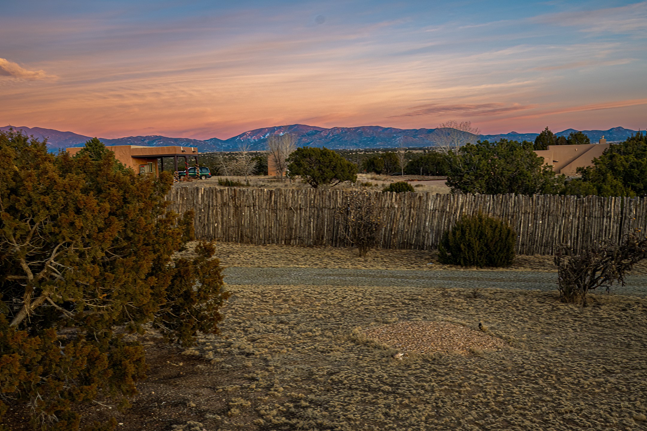 This spacious light view filled home offers a great value! Through the gated entry and into an extraordinarily captivating entrance this home feels like it is miles from everyone and yet it's within the neighborhood. Just a few minutes drive to Las Campanas and another few minutes to 599. This location is ideal for Living in style in the Northwest aea of Santa Fe.Each bedroom has views, natural light, access to the outside portals and ensuite baths. The natural minimalist landscaping is easy to maintain attractive from outside areaa, there is hard wiring lighting to the trees and irrigation.in addition why not have a party, there's plenty of within the grounds parking as well as a detached carport replete with Vegas and a propanel roof perfect for your recreational vehicles. There is also an attached two-car garage that is finished inside.Two fireplaces, Excellent storage and all the amenities one would expect can be yours. This is move-in ready.