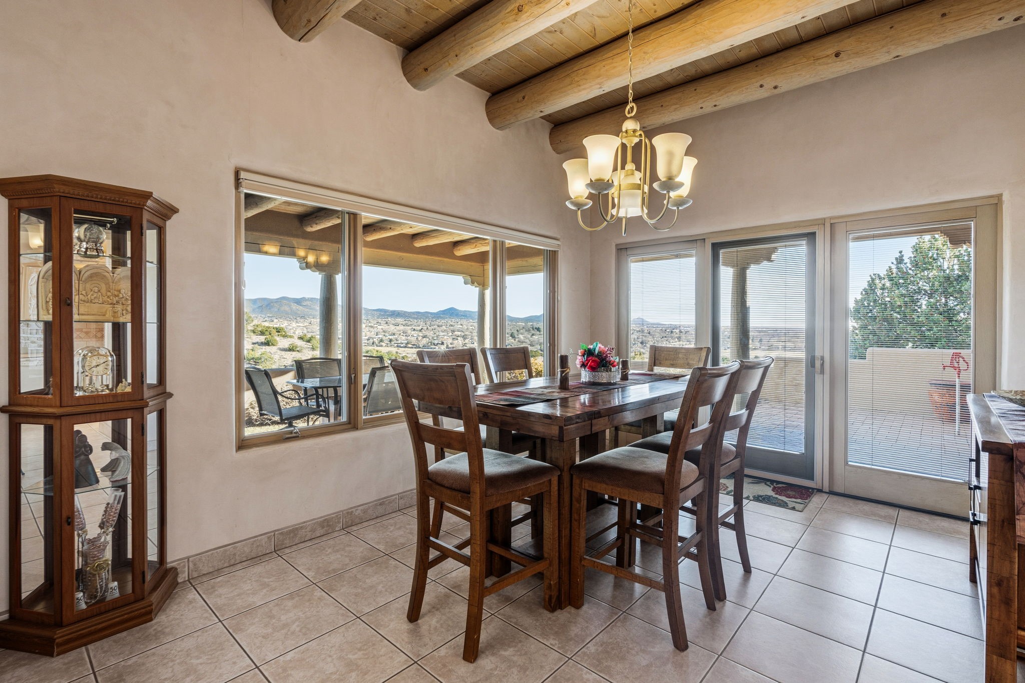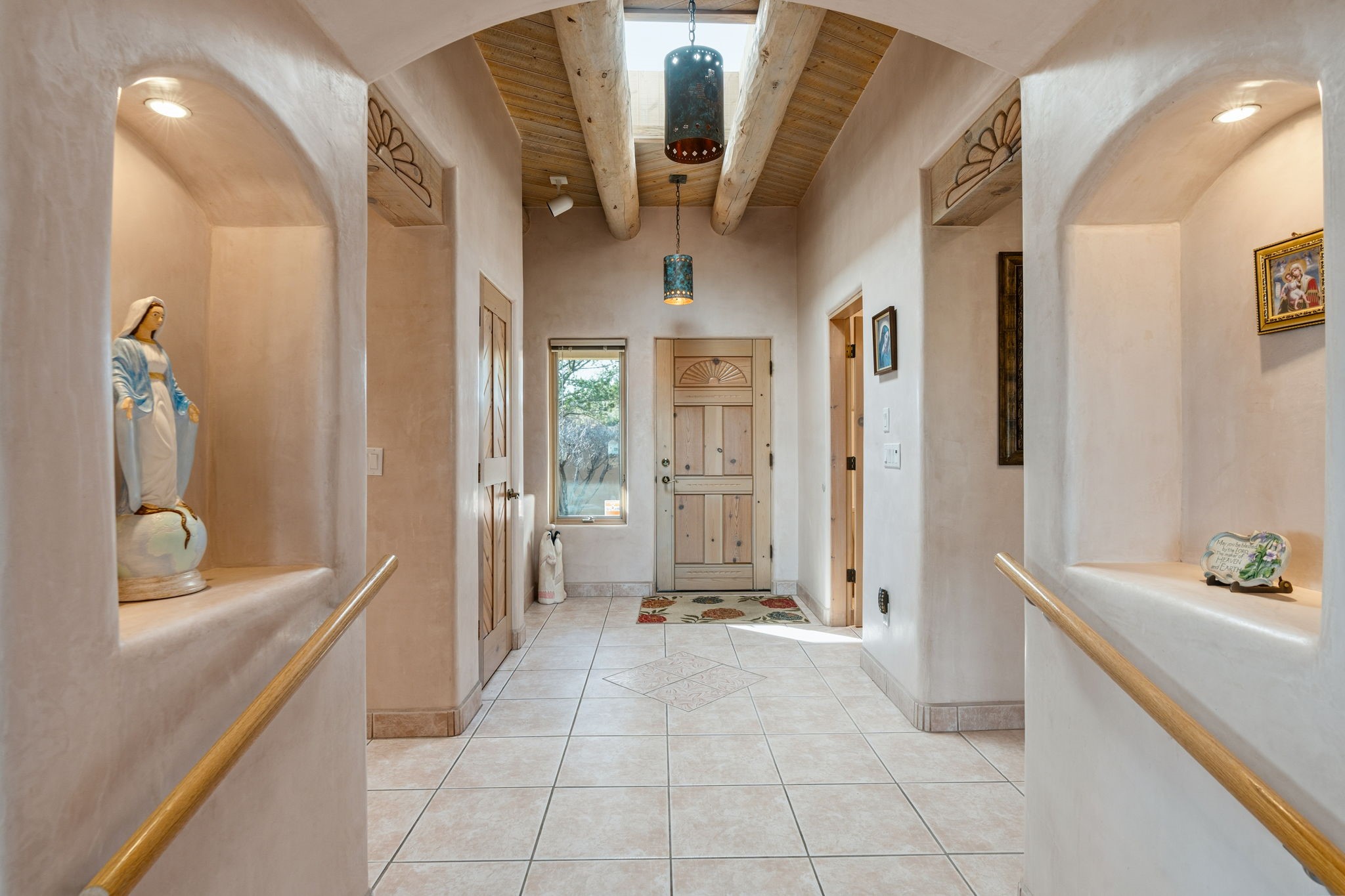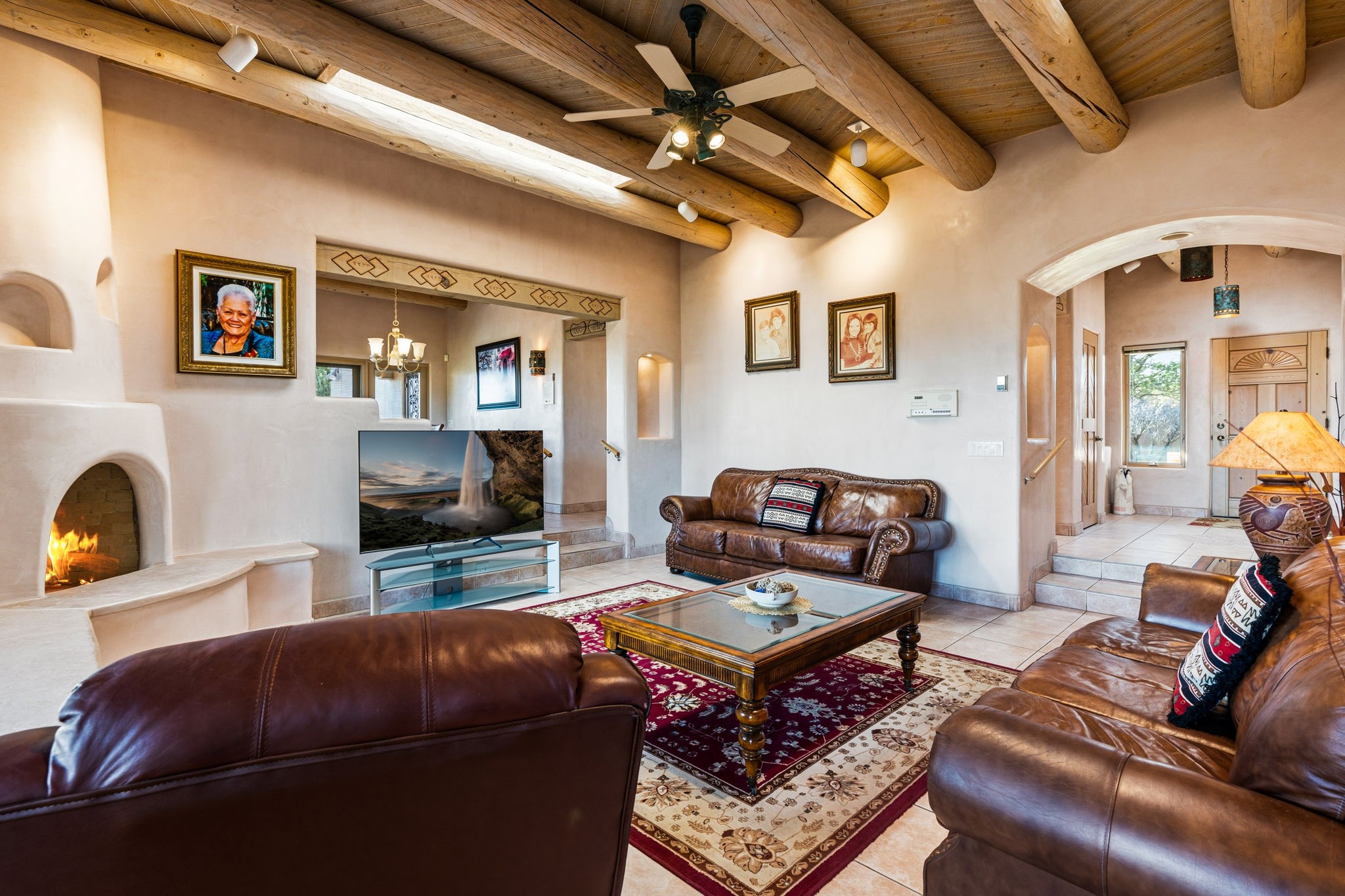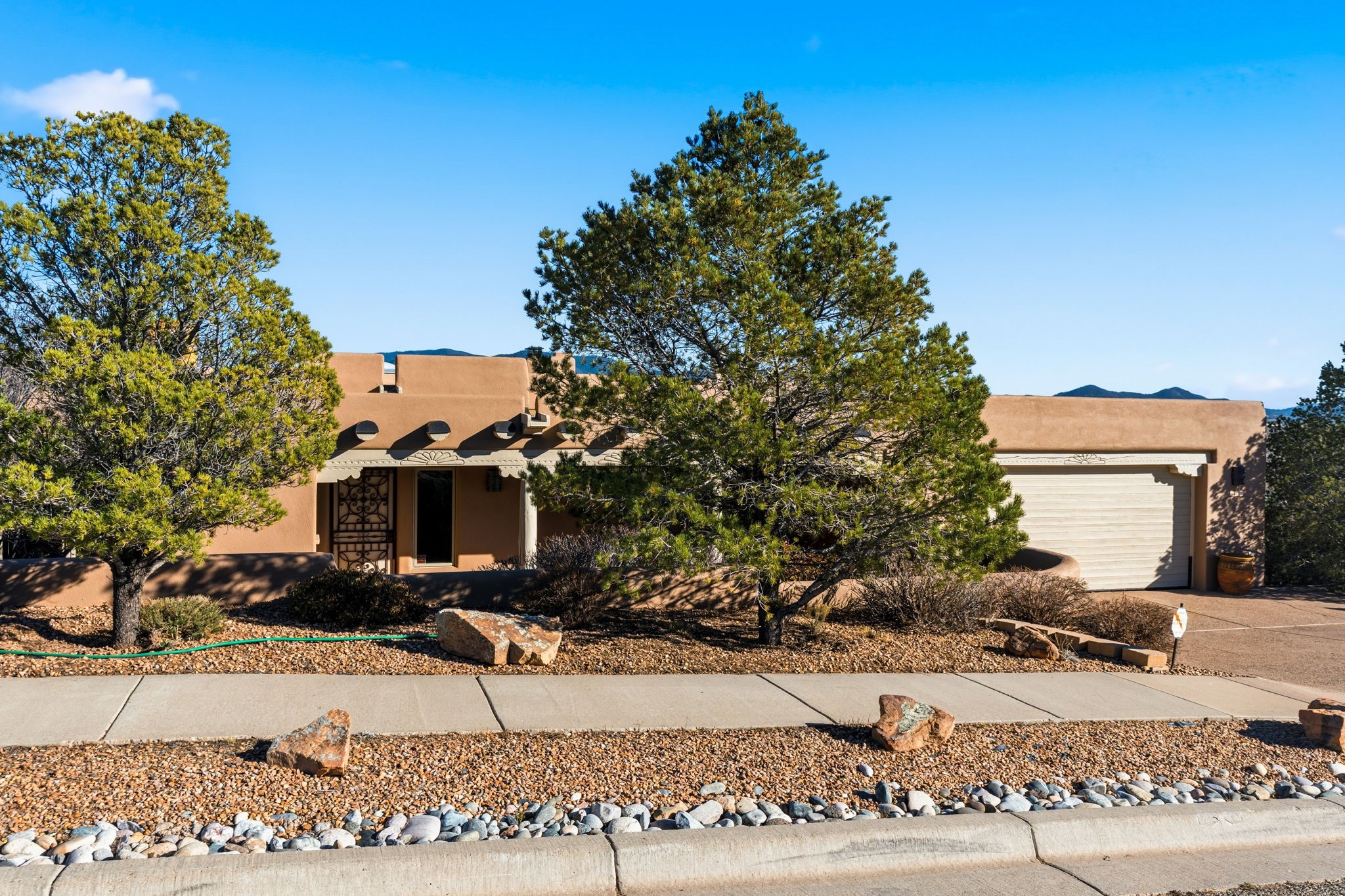 Perched atop a 1.51 acre ridgetop lot overlooking the sparkling lights of Santa Fe and views of the majestic Sangre de Cristo mountain range, this stunning Pueblo style residence captures the best of northern New Mexico living. Thoughtfully crafted with exquisite attention to detail and enhanced by recent upgrades, this 3-bedroom 2.5 bath home offers both timeless elegance and modern comfort. Step inside to discover diamond finish plastered interior walls, blue spruce tongue and groove ceilings with vigas, hand carved pine beams, and warm Italian tile floors that flow throughout the light filled interior. The spacious living room is graced by soaring 12-foot-high ceilings and a traditional kiva fireplace that opens to a formal dining room showcasing spectacular views. The chef's kitchen features custom maple cabinetry, built in appliances including a cooktop, oven and microwave, recessed lighting and Italian tile countertops is perfect for entertaining or quiet evenings at home. The primary suite offers serene privacy with dual sinks, a linen closet and a luxurious whirlpool tub while each closet in the house boasts custom built shelving. Distinctive architectural touches such as wood carved beams, lighted niches, copper wall sconces and pendants, solid brass bathroom fixtures, and knotty pine doors add rich texture and authenticity throughout. Enjoy the ambiance of two kiva fireplaces including one in the main living area and one on the covered outdoor patio. Outside, beautifully designed front and rear walled courtyards frame a fully landscaped yard accented with colorful shrubs, mature trees and lush grass nourished by a full sprinkler and drip irrigation system. Expansive covered brick porches provide the perfect space to relax and soak in sunset vistas. Additional highlights include new exterior stucco, aluminum wood clad Pella windows and exterior doors, a central radio and intercom system, custom wrought iron security screen doors, a new front gate, a finished and insulated 2 car garage with a cedar door, and numerous skylights that invite natural light into every space. Excellent midtown location in the highly sought after Sierra del Sol subdivision - an area of custom homes with paved roads and easy access to all of Santa Fe's amenities. From its refined craftsmanship to its breathtaking views, 817 Camino Vistas Encantada embodies the quintessential Santa Fe lifestyle - warm, inviting and undeniably enchanting.
