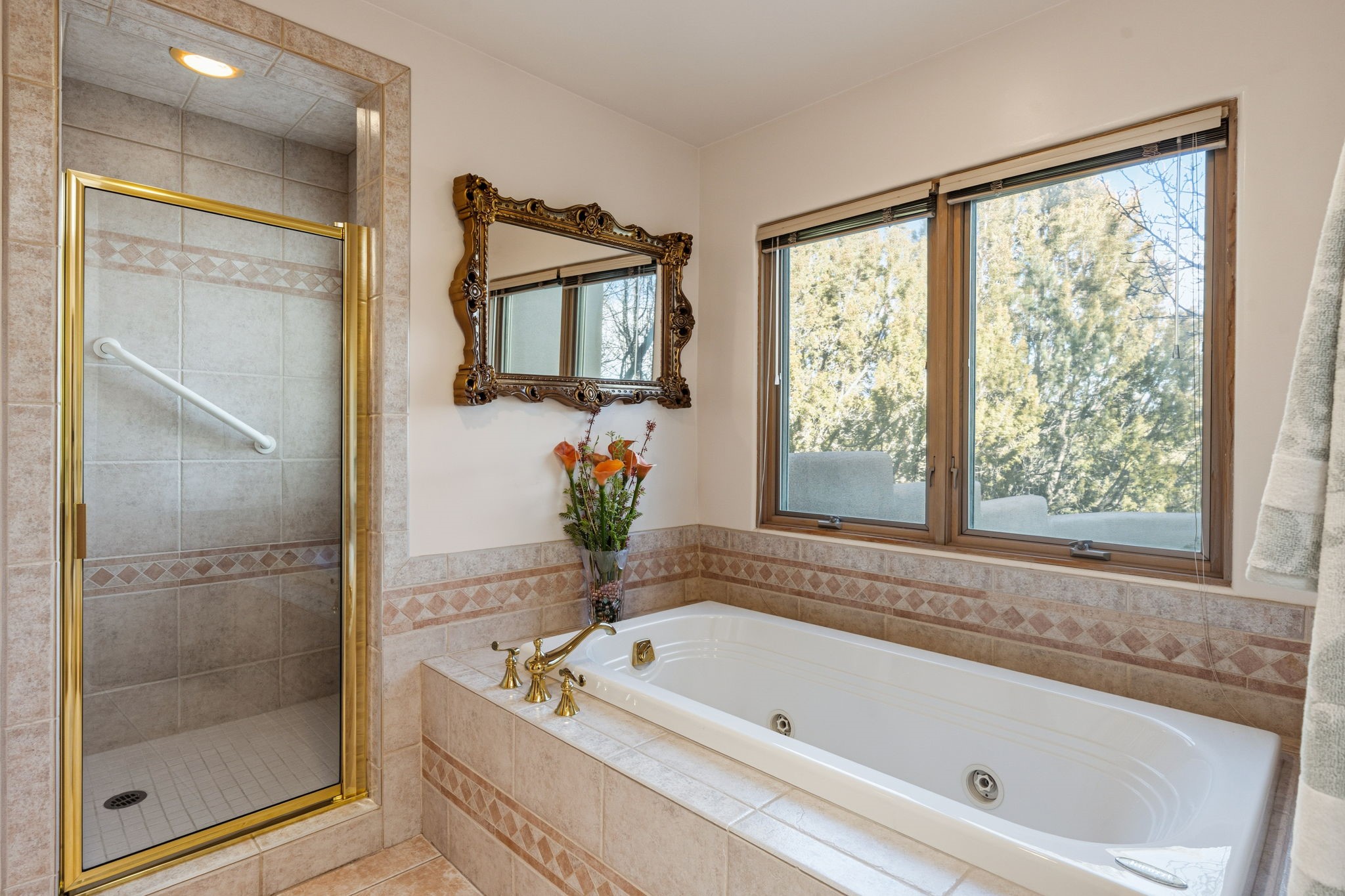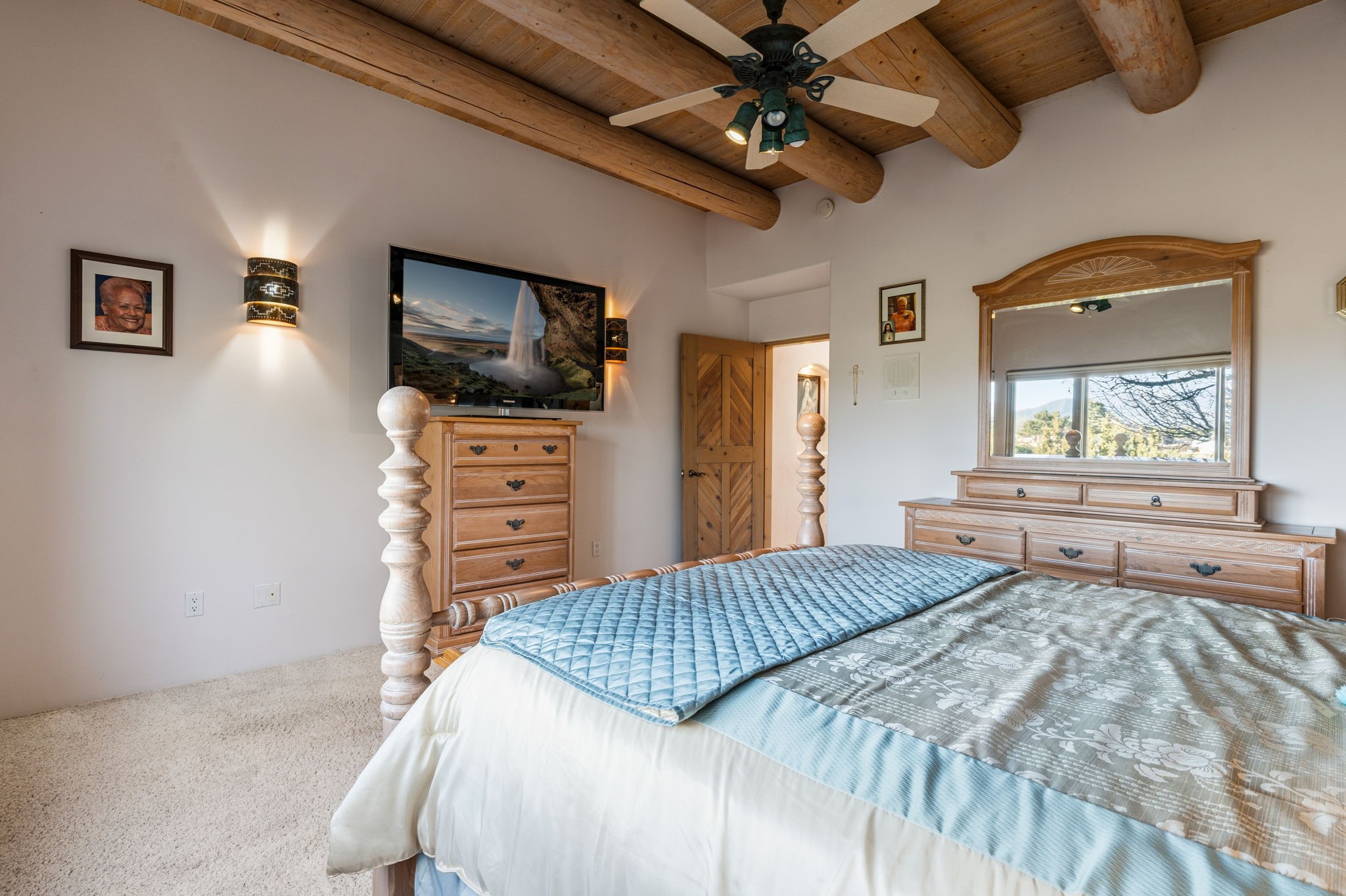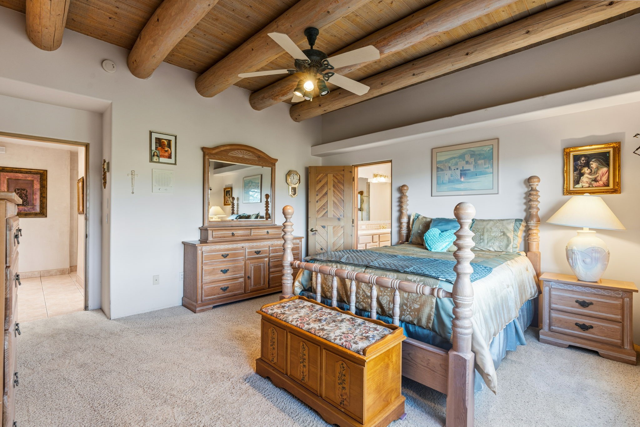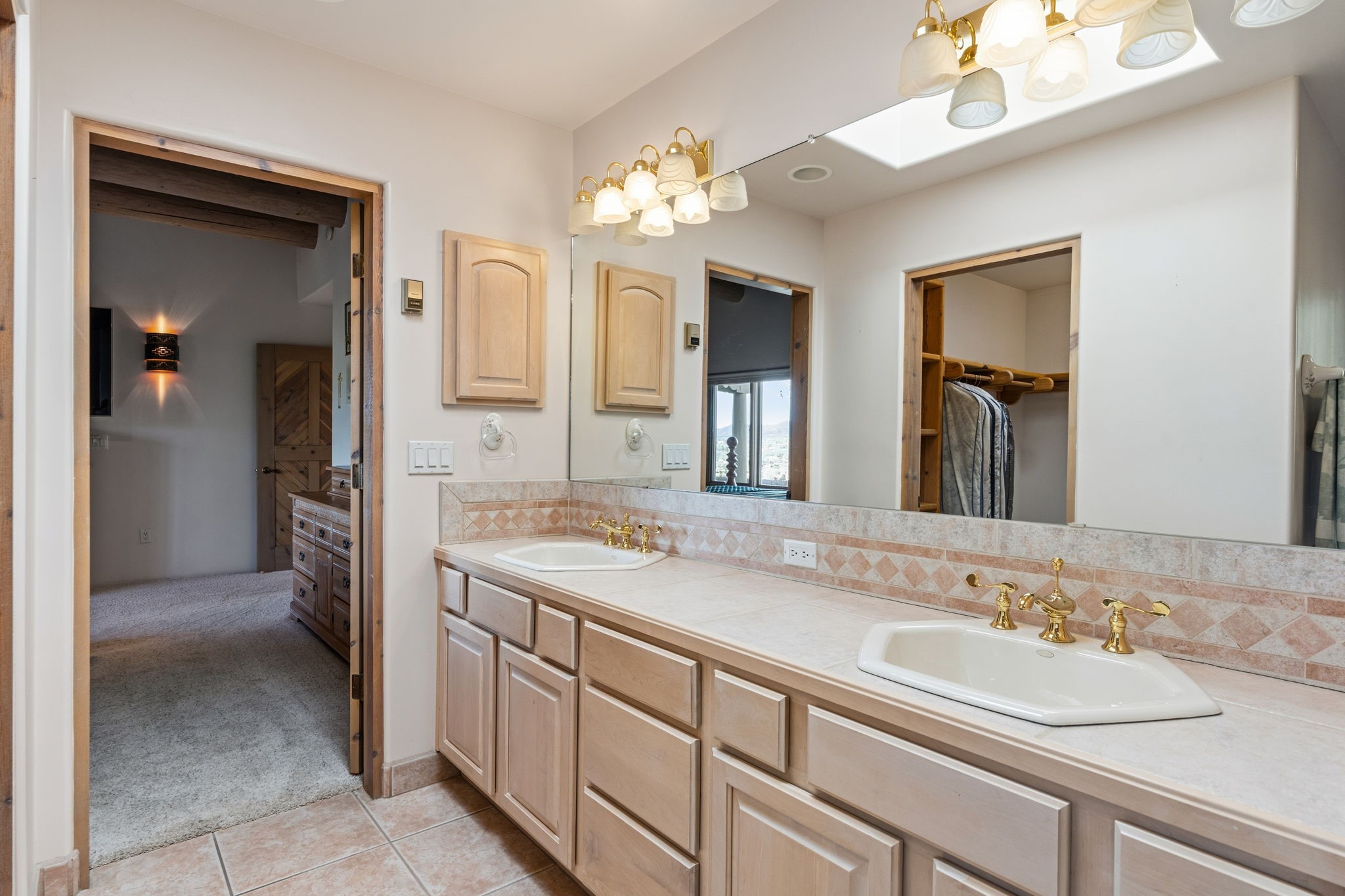 Perched atop a 1.51 acre ridgetop lot overlooking the sparkling lights of Santa Fe and views of the majestic Sangre de Cristo mountain range, this stunning Pueblo style residence captures the best of northern New Mexico living. Thoughtfully crafted with exquisite attention to detail and enhanced by recent upgrades, this 3-bedroom 2.5 bath home offers both timeless elegance and modern comfort. Step inside to discover diamond finish plastered interior walls, blue spruce tongue and groove ceilings with vigas, hand carved pine beams, and warm Italian tile floors that flow throughout the light filled interior. The spacious living room is graced by soaring 12-foot-high ceilings and a traditional kiva fireplace that opens to a formal dining room showcasing spectacular views. The chef's kitchen features custom maple cabinetry, built in appliances including a cooktop, oven and microwave, recessed lighting and Italian tile countertops is perfect for entertaining or quiet evenings at home. The primary suite offers serene privacy with dual sinks, a linen closet and a luxurious whirlpool tub while each closet in the house boasts custom built shelving. Distinctive architectural touches such as wood carved beams, lighted niches, copper wall sconces and pendants, solid brass bathroom fixtures, and knotty pine doors add rich texture and authenticity throughout. Enjoy the ambiance of two kiva fireplaces including one in the main living area and one on the covered outdoor patio. Outside, beautifully designed front and rear walled courtyards frame a fully landscaped yard accented with colorful shrubs, mature trees and lush grass nourished by a full sprinkler and drip irrigation system. Expansive covered brick porches provide the perfect space to relax and soak in sunset vistas. Additional highlights include new exterior stucco, aluminum wood clad Pella windows and exterior doors, a central radio and intercom system, custom wrought iron security screen doors, a new front gate, a finished and insulated 2 car garage with a cedar door, and numerous skylights that invite natural light into every space. Excellent midtown location in the highly sought after Sierra del Sol subdivision - an area of custom homes with paved roads and easy access to all of Santa Fe's amenities. From its refined craftsmanship to its breathtaking views, 817 Camino Vistas Encantada embodies the quintessential Santa Fe lifestyle - warm, inviting and undeniably enchanting.