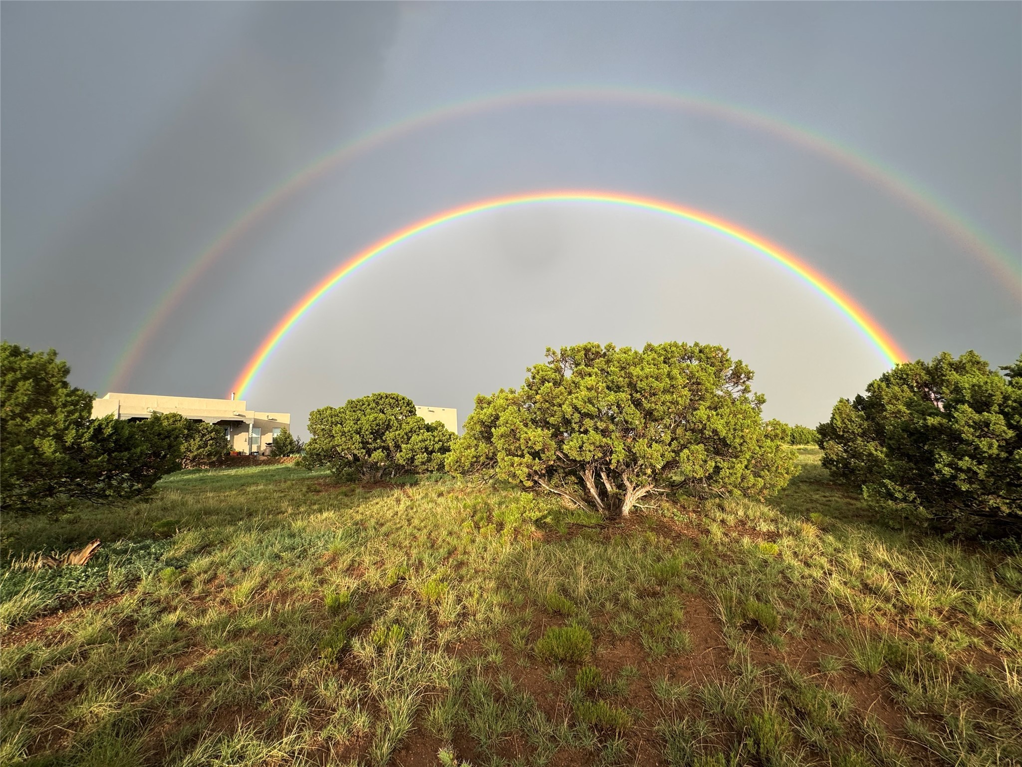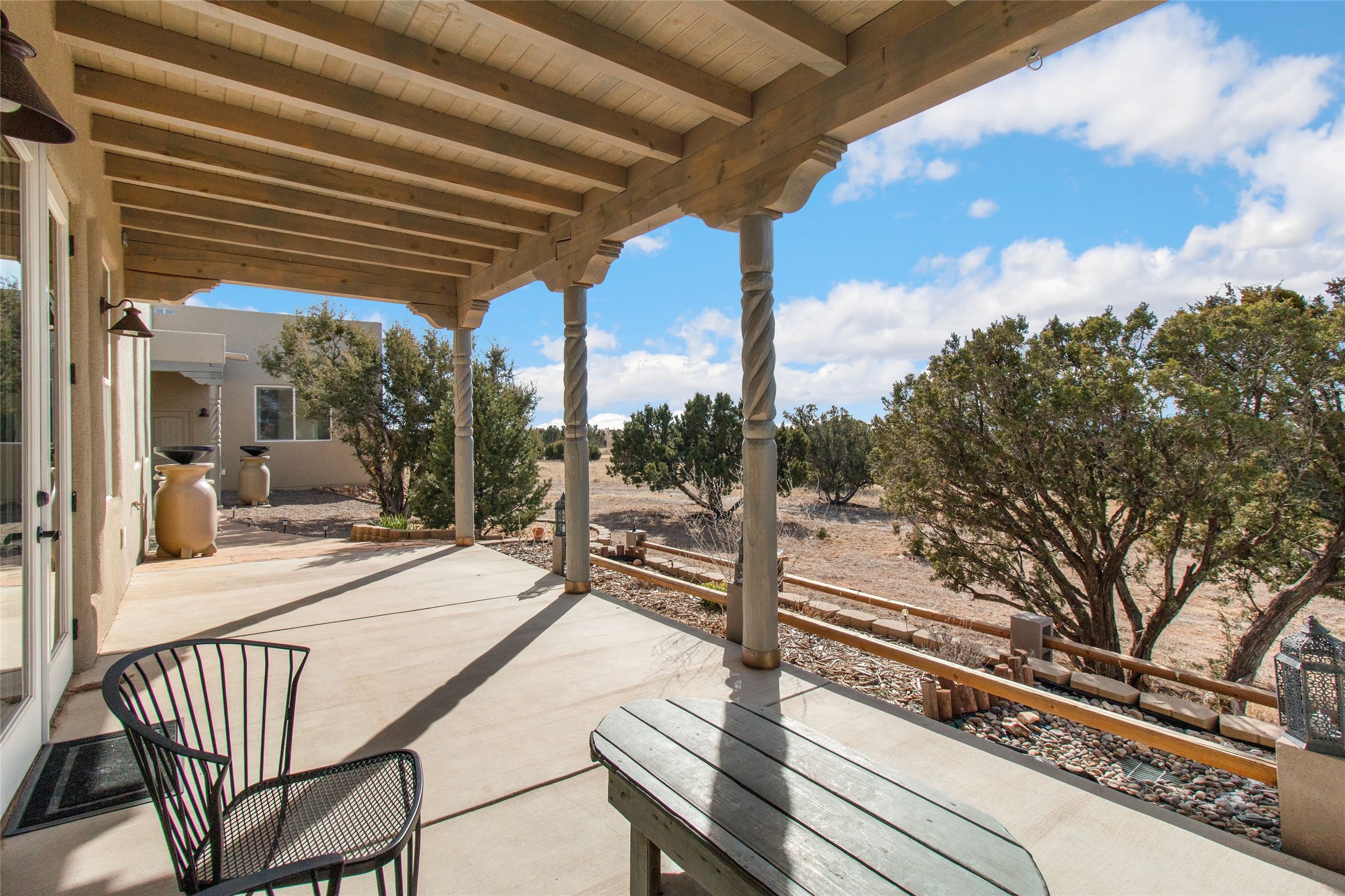 Pride of ownership is apparent the minute you walk into this 2019 contemporary build in Eldorado. Upon entry into the front court yard, you are greeted by apple, peach and cherry trees. The main house offers 3 bedrooms, 2 baths and open living concept with a split bedroom configuration for owner and guest privacy. Stunning views from the living room and back portal await you on this 1.4 acres. This home was built for energy efficiency as a priority with a HERS rating of 70. A solar panel system attached to the grid was added to the home in 2024 for ultra low electric bills. A Hearthstone Green Mountain convection wood stove takes the chill off those really cold winter evenings. An annually serviced tankless water heater ensures you never run out of hot water. Central cooling and heating. A detached one bedroom casita with a 3/4 quarters bathroom is perfect for guests or an in-law suite, plus an adjacent RV garage. For all the amenities available to homeowners in Eldorado, check out www.eldoradosf.org