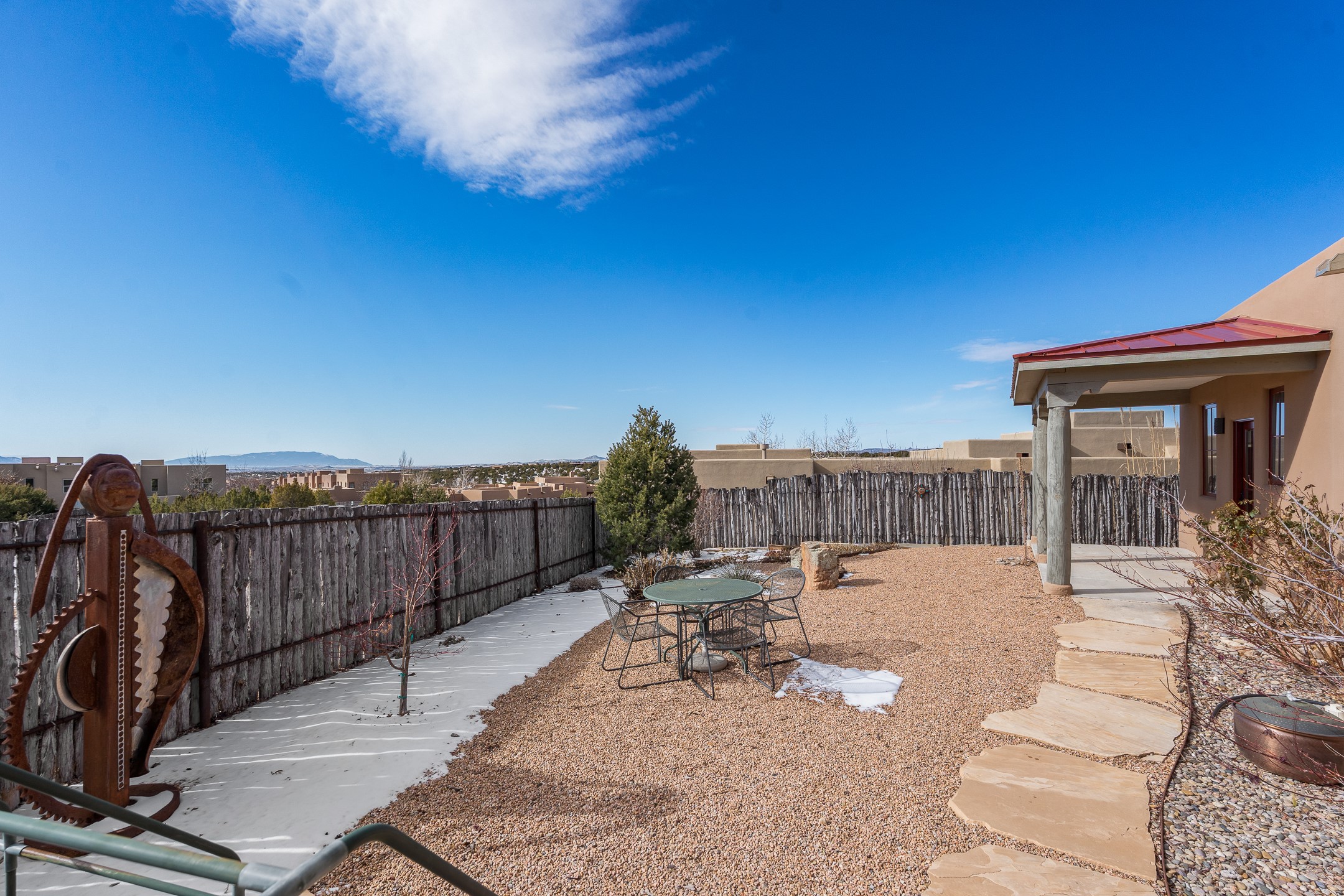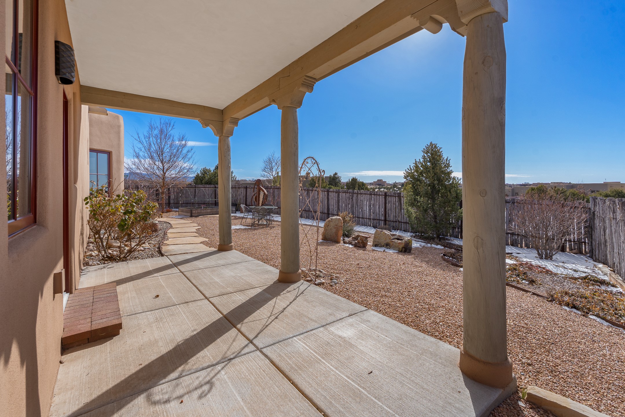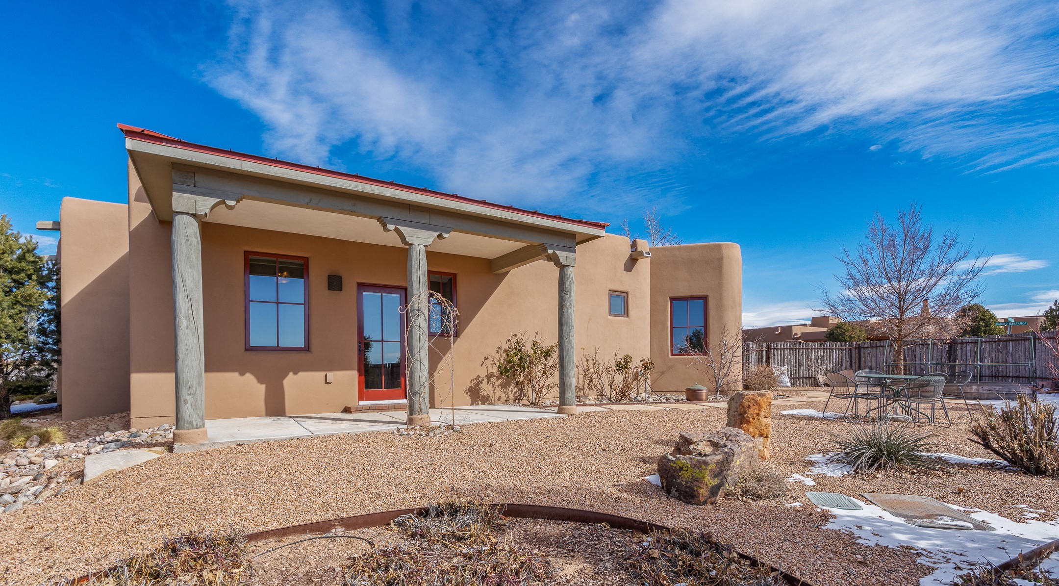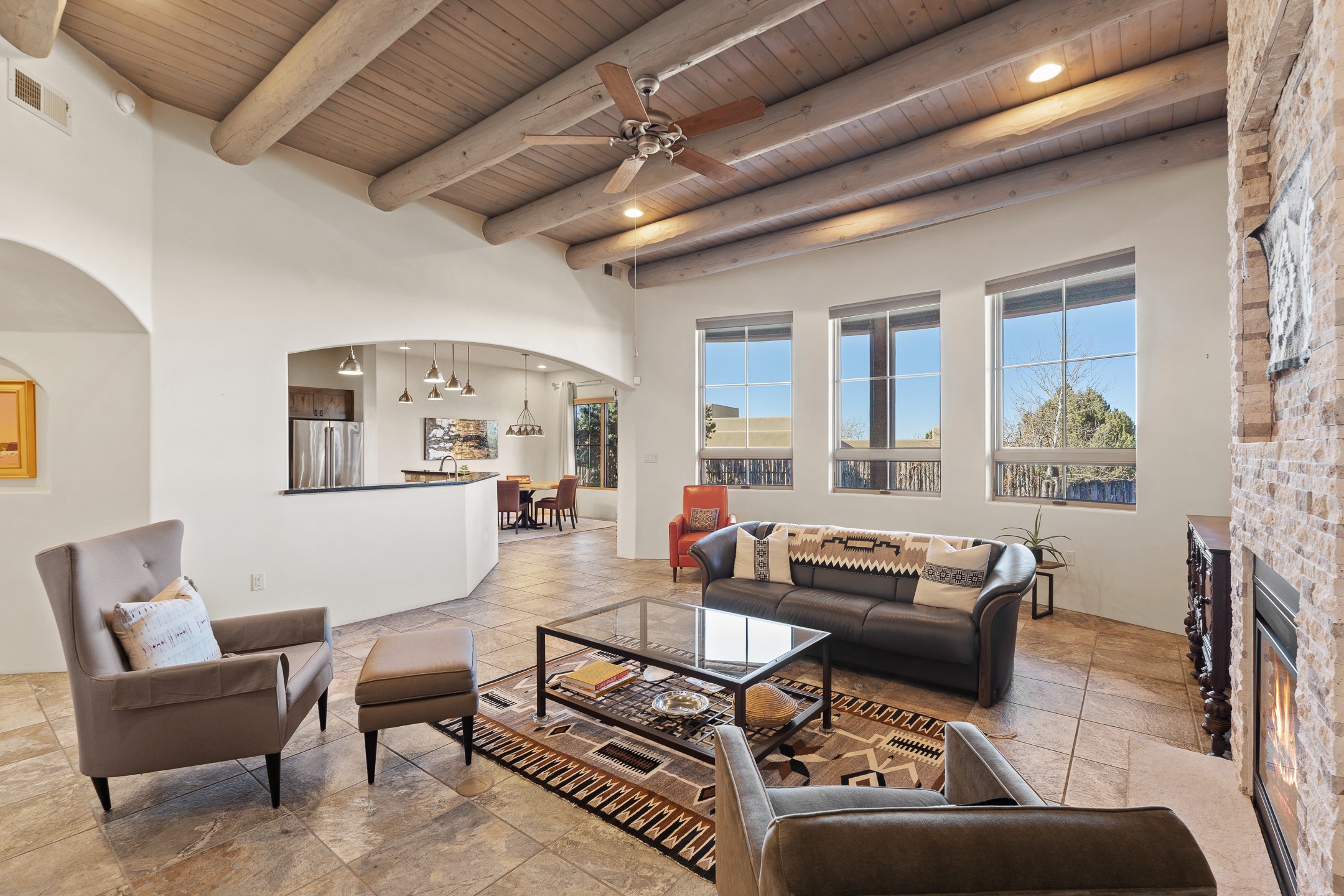 Sophisticated soft-contemporary living awaits in this beautifully designed single-level home, ideally situated on a desirable corner lot in the vibrant community of Aldea de Santa Fe. Built in 2014, this thoughtfully planned residence offers approximately 2,743 square feet of elegant living space, including three bedrooms, three baths, and a two-car garage.The well-designed floor plan provides excellent separation of spaces. A generous guest bedroom features an en-suite bath, while a versatile office or third bedroom includes a private exterior entrance--perfect for guests, creative pursuits, or a home office. Stone flooring throughout creates a clean, modern aesthetic, complemented by forced air heating and air conditioning for year-round comfort.The open-concept living, dining, and kitchen areas offer a seamless yet well-defined flow. The living room is highlighted by exposed beams, a gas fireplace, and tall windows that flood the space with natural light. The spacious kitchen is appointed with knotty alder cabinetry, extensive solid-surface countertops for food preparation, a stainless-steel range with exterior venting, a center island, and a built-in desk area--ideal for everyday living and entertaining.The primary suite serves as a serene retreat, featuring two spacious walk-in closets and a spa-inspired bath. Light-filled living and dining areas open effortlessly to the rear patio, where mature landscaping, and a charming peek-a-boo view of the Jemez Mountains create a tranquil outdoor setting for relaxation or gatherings.Aldea de Santa Fe is known for its village-style charm and active lifestyle, offering residents miles of walking trails, expansive shared open space, a community center, and tennis, basketball, and bocce courts. Annual art tours, community garage sales, and a variety of social clubs foster a welcoming and connected neighborhood atmosphere.This home presents a rare opportunity to enjoy refined comfort, thoughtful design, and a true sense of community--Santa Fe living at its best.