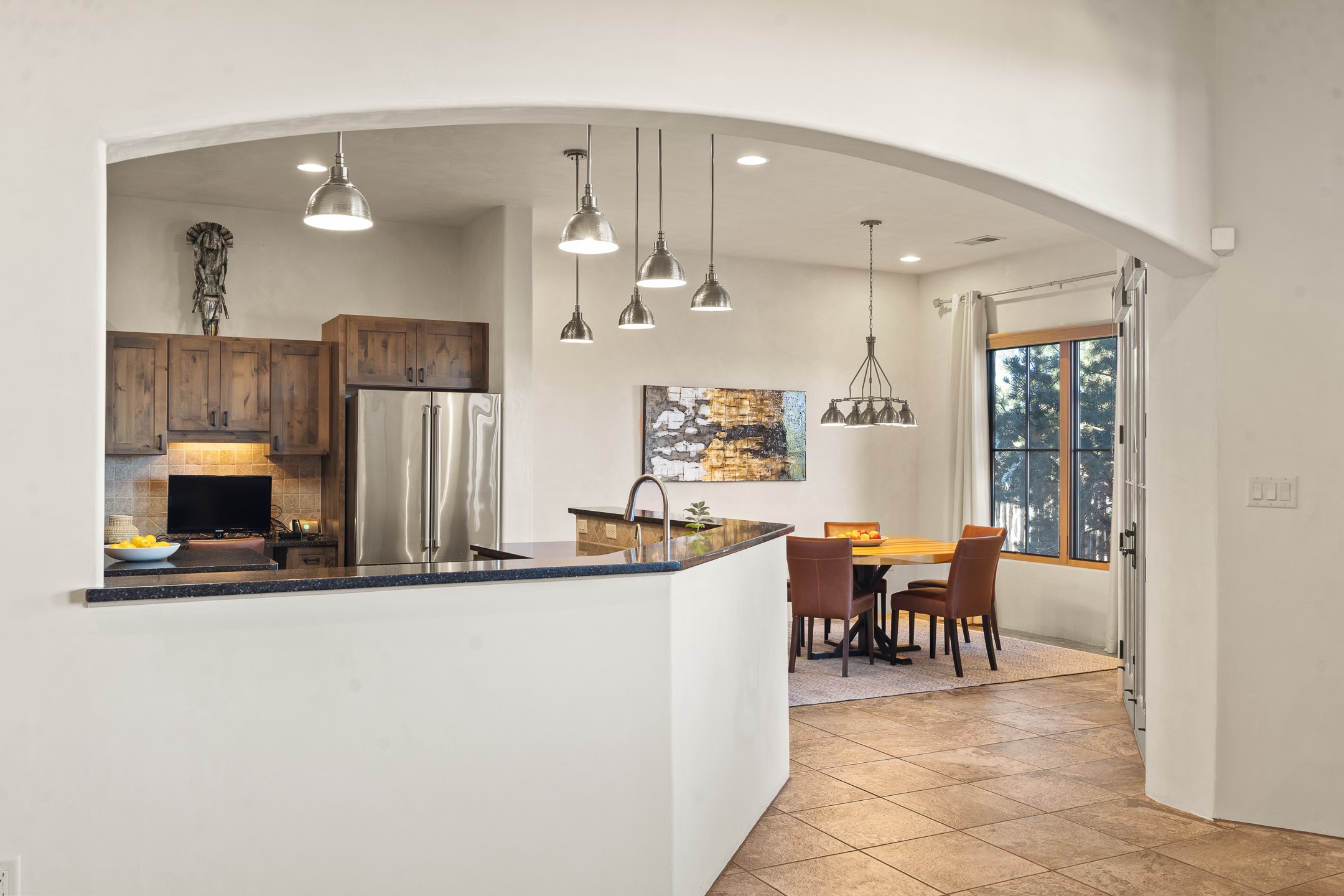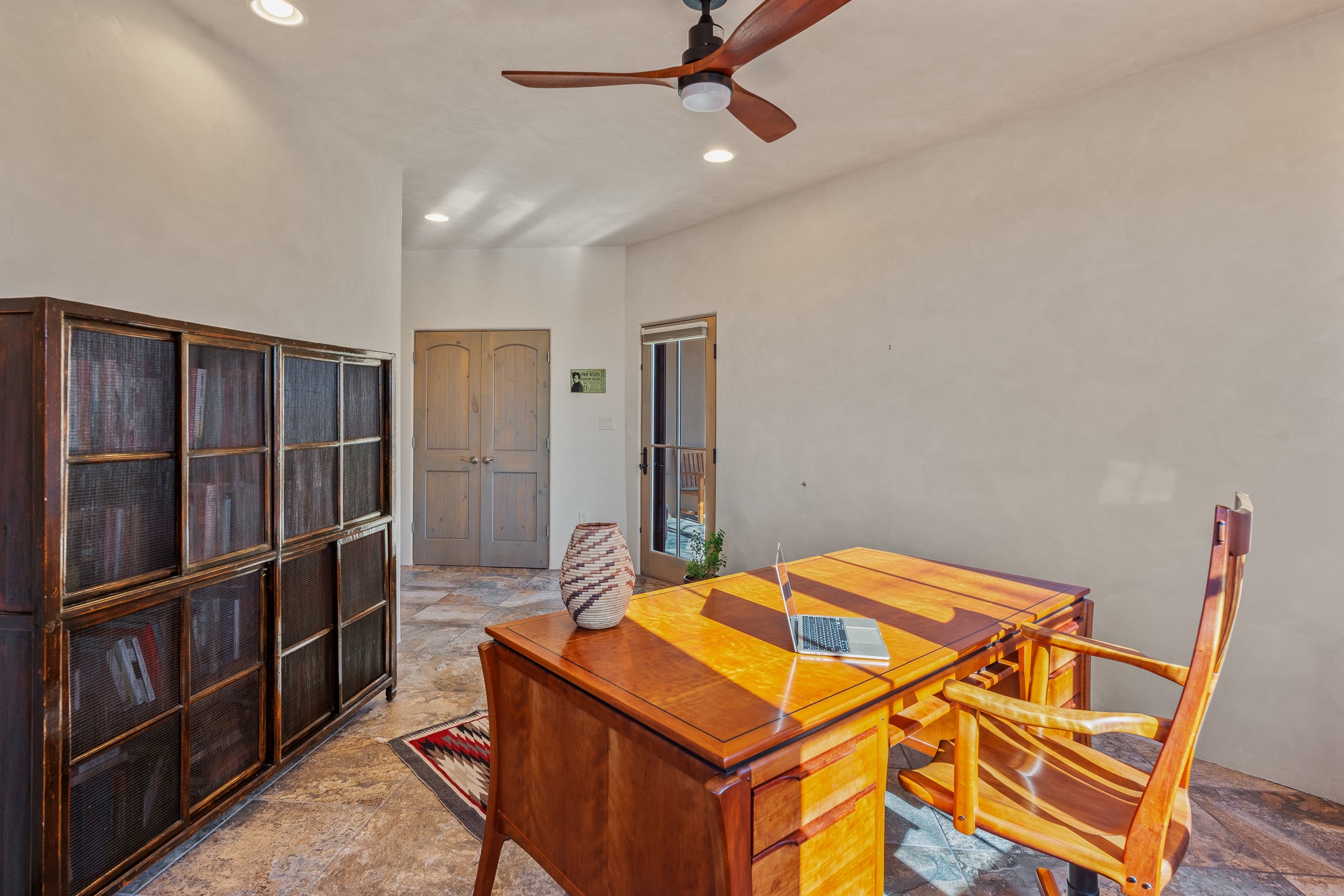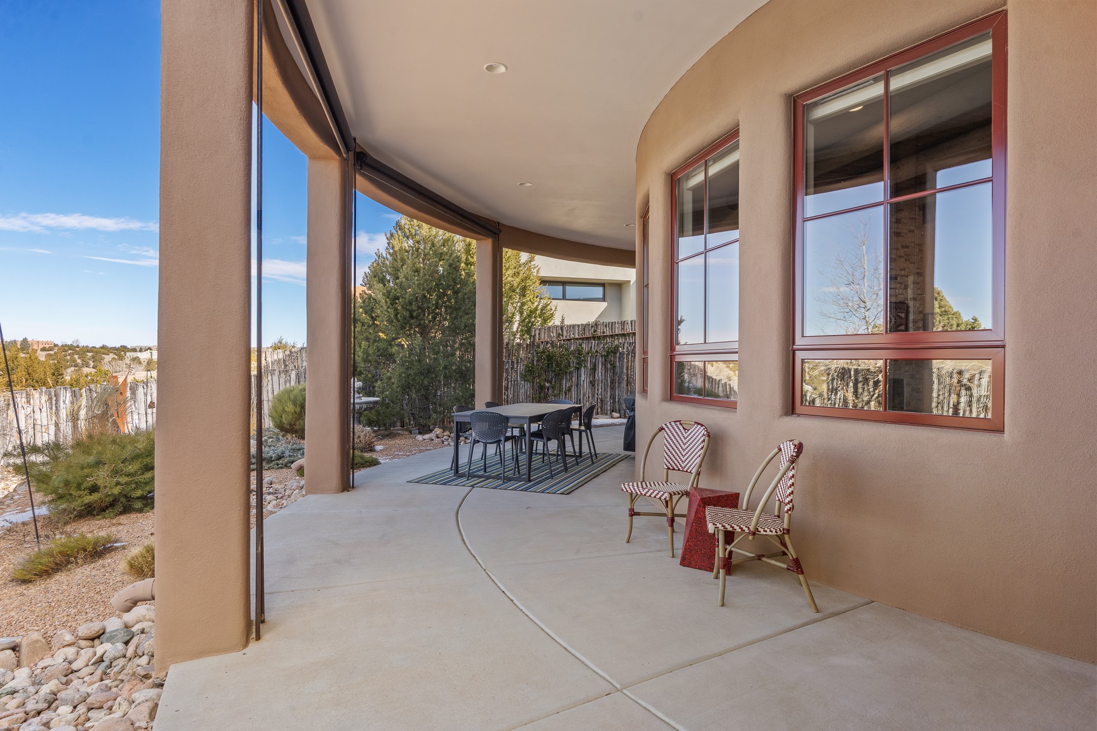 Sophisticated soft-contemporary living awaits in this beautifully designed single-level home, ideally situated on a desirable corner lot in the vibrant community of Aldea de Santa Fe. Built in 2014, this thoughtfully planned residence offers approximately 2,743 square feet of elegant living space, including three bedrooms, three baths, and a two-car garage.The well-designed floor plan provides excellent separation of spaces. A generous guest bedroom features an en-suite bath, while a versatile office or third bedroom includes a private exterior entrance--perfect for guests, creative pursuits, or a home office. Stone flooring throughout creates a clean, modern aesthetic, complemented by forced air heating and air conditioning for year-round comfort.The open-concept living, dining, and kitchen areas offer a seamless yet well-defined flow. The living room is highlighted by exposed beams, a gas fireplace, and tall windows that flood the space with natural light. The spacious kitchen is appointed with knotty alder cabinetry, extensive solid-surface countertops for food preparation, a stainless-steel range with exterior venting, a center island, and a built-in desk area--ideal for everyday living and entertaining.The primary suite serves as a serene retreat, featuring two spacious walk-in closets and a spa-inspired bath. Light-filled living and dining areas open effortlessly to the rear patio, where mature landscaping, and a charming peek-a-boo view of the Jemez Mountains create a tranquil outdoor setting for relaxation or gatherings.Aldea de Santa Fe is known for its village-style charm and active lifestyle, offering residents miles of walking trails, expansive shared open space, a community center, and tennis, basketball, and bocce courts. Annual art tours, community garage sales, and a variety of social clubs foster a welcoming and connected neighborhood atmosphere.This home presents a rare opportunity to enjoy refined comfort, thoughtful design, and a true sense of community--Santa Fe living at its best.