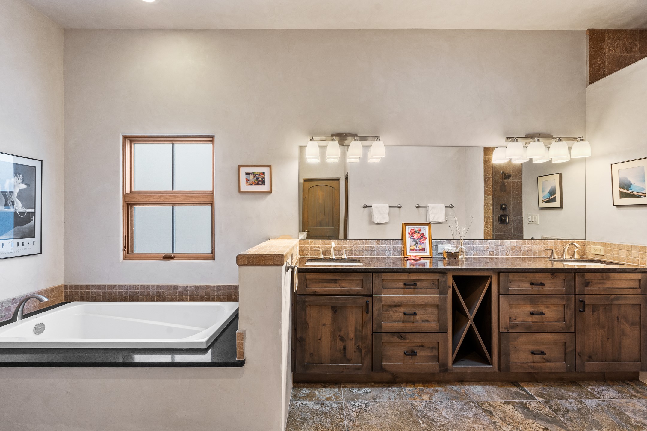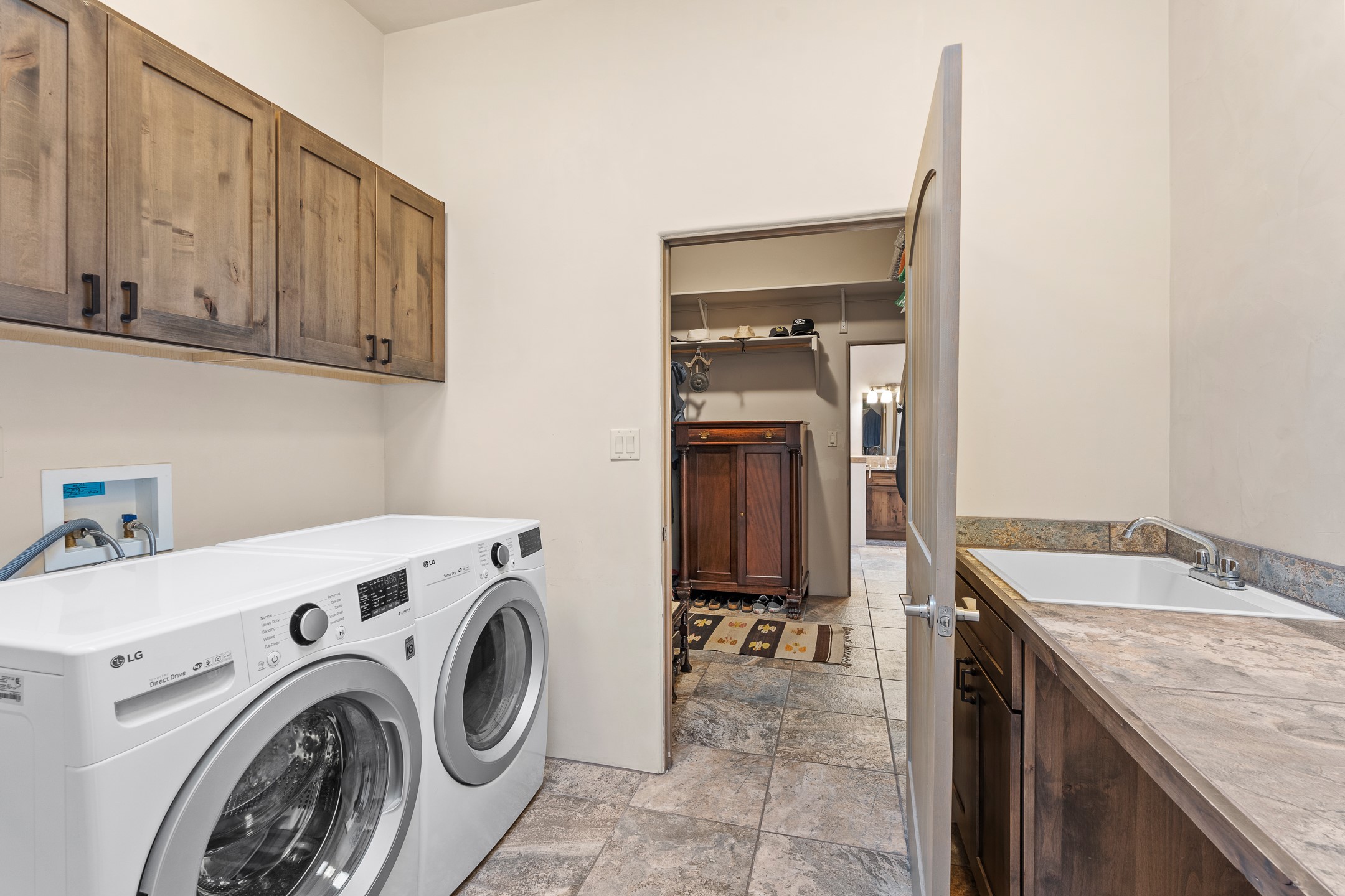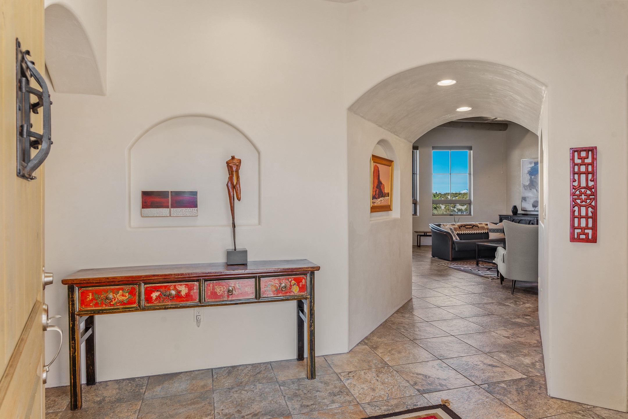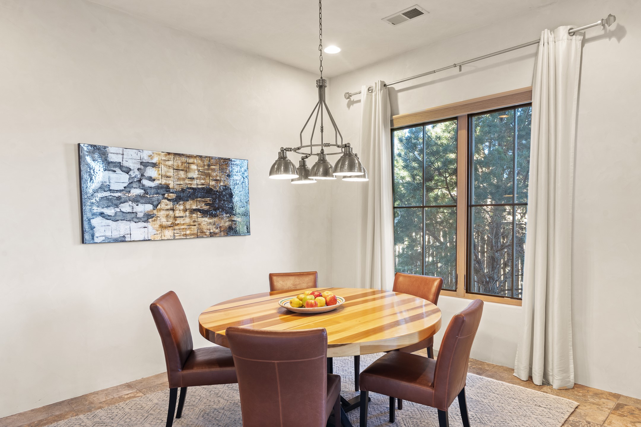 Sophisticated soft-contemporary living awaits in this beautifully designed single-level home, ideally situated on a desirable corner lot in the vibrant community of Aldea de Santa Fe. Built in 2014, this thoughtfully planned residence offers approximately 2,743 square feet of elegant living space, including three bedrooms, three baths, and a two-car garage.The well-designed floor plan provides excellent separation of spaces. A generous guest bedroom features an en-suite bath, while a versatile office or third bedroom includes a private exterior entrance--perfect for guests, creative pursuits, or a home office. Stone flooring throughout creates a clean, modern aesthetic, complemented by forced air heating and air conditioning for year-round comfort.The open-concept living, dining, and kitchen areas offer a seamless yet well-defined flow. The living room is highlighted by exposed beams, a gas fireplace, and tall windows that flood the space with natural light. The spacious kitchen is appointed with knotty alder cabinetry, extensive solid-surface countertops for food preparation, a stainless-steel range with exterior venting, a center island, and a built-in desk area--ideal for everyday living and entertaining.The primary suite serves as a serene retreat, featuring two spacious walk-in closets and a spa-inspired bath. Light-filled living and dining areas open effortlessly to the rear patio, where mature landscaping, and a charming peek-a-boo view of the Jemez Mountains create a tranquil outdoor setting for relaxation or gatherings.Aldea de Santa Fe is known for its village-style charm and active lifestyle, offering residents miles of walking trails, expansive shared open space, a community center, and tennis, basketball, and bocce courts. Annual art tours, community garage sales, and a variety of social clubs foster a welcoming and connected neighborhood atmosphere.This home presents a rare opportunity to enjoy refined comfort, thoughtful design, and a true sense of community--Santa Fe living at its best.