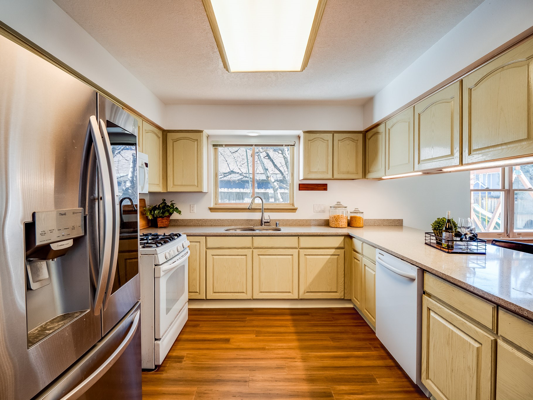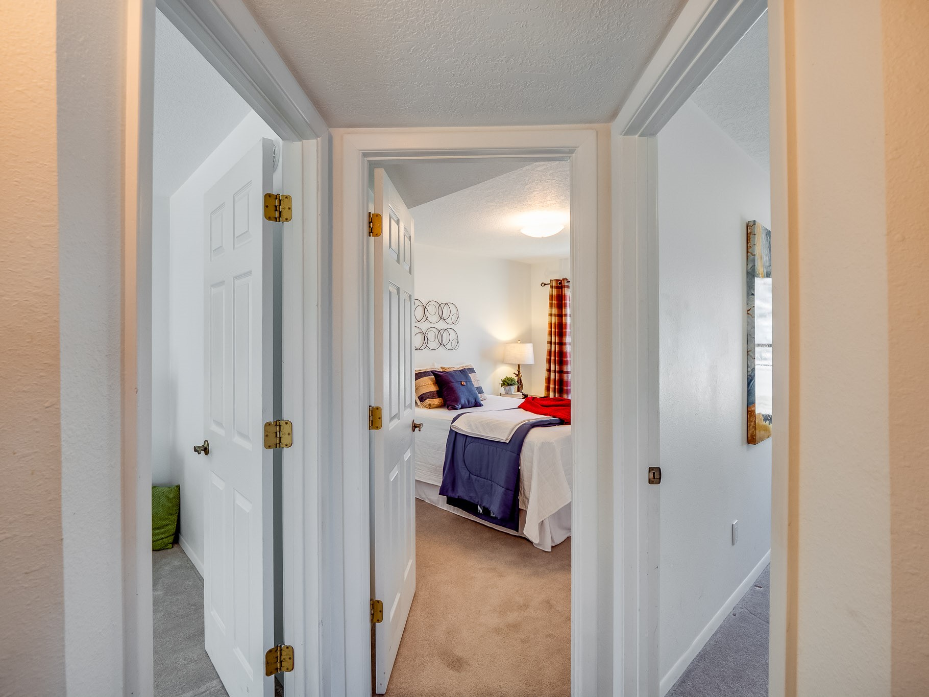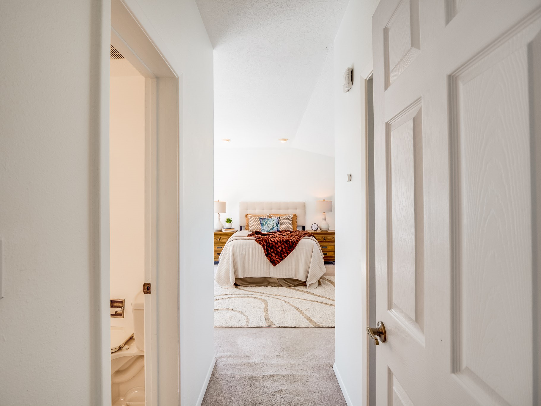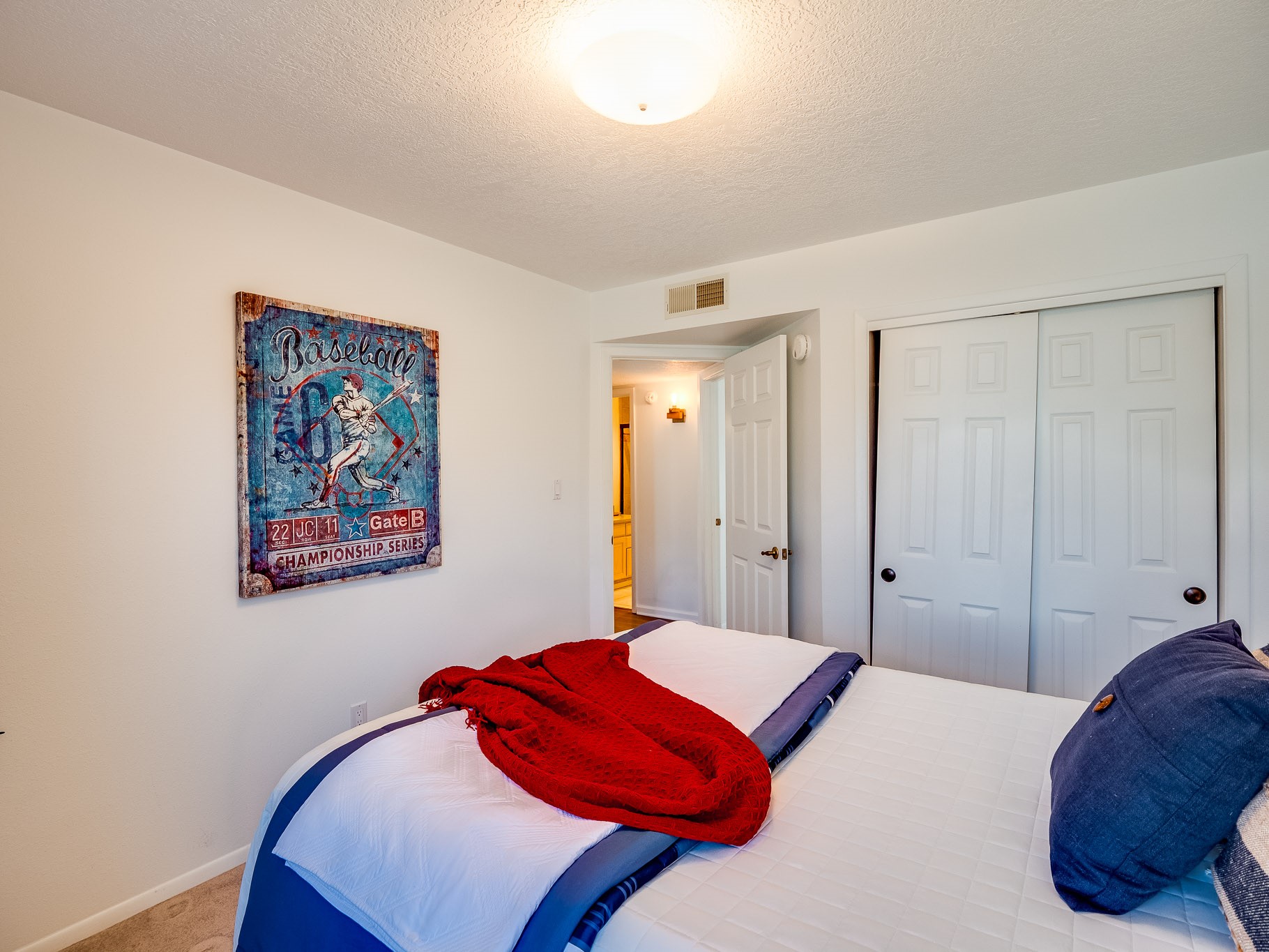Situated on a desirable corner lot in North Mesa, this beautiful two-story home offers exceptional curb appeal with a large grassy front yard and mature trees lining the welcoming front entrance, providing shade as well as privacy. Step inside the foyer and descend a few steps into the bright, open living room, where rich engineered wood floors extend throughout the main living spaces. Vaulted ceilings enhance the sense of space and light, creating an inviting atmosphere ideal for both everyday living and entertaining. The living room flows seamlessly into the dining area, thoughtfully divided from the kitchen by open glass shelving that adds architectural interest while maintaining an open-concept feel. The kitchen has light colored cabinetry and abundant quartz counter space, including a peninsula island with bar seating. Stainless steel refrigerator and a gas oven/range, and there is convenient access to the oversized two-car garage. Adjacent to the kitchen, the family room features vaulted ceilings and a dramatic floor to ceiling stone wood burning fireplace, serving as a warm and striking focal point. From here, step outside to the covered deck overlooking the fully fenced backyard with mature trees, and ample space for gardening and outdoor dining. The main level also includes three nicely sized carpeted guest bedrooms, a guest bathroom with a walk-in tiled shower featuring a luxurious shower panel and single-sink vanity, along with a dedicated laundry room and additional storage closet. Upstairs, the home is fully carpeted and features a cozy loft perfect for relaxing or reading, as well as a versatile bonus room that could serve as a hobby space, office, or additional bedroom. Spacious primary en-suite bedroom with a large walk-in closet and a spa-like bathroom complete with a double-sink vanity, tile flooring, and a deep soaking tub. Located near parks, horse stables and trails, book your tour of this move-in ready home and experience what it has to offer!