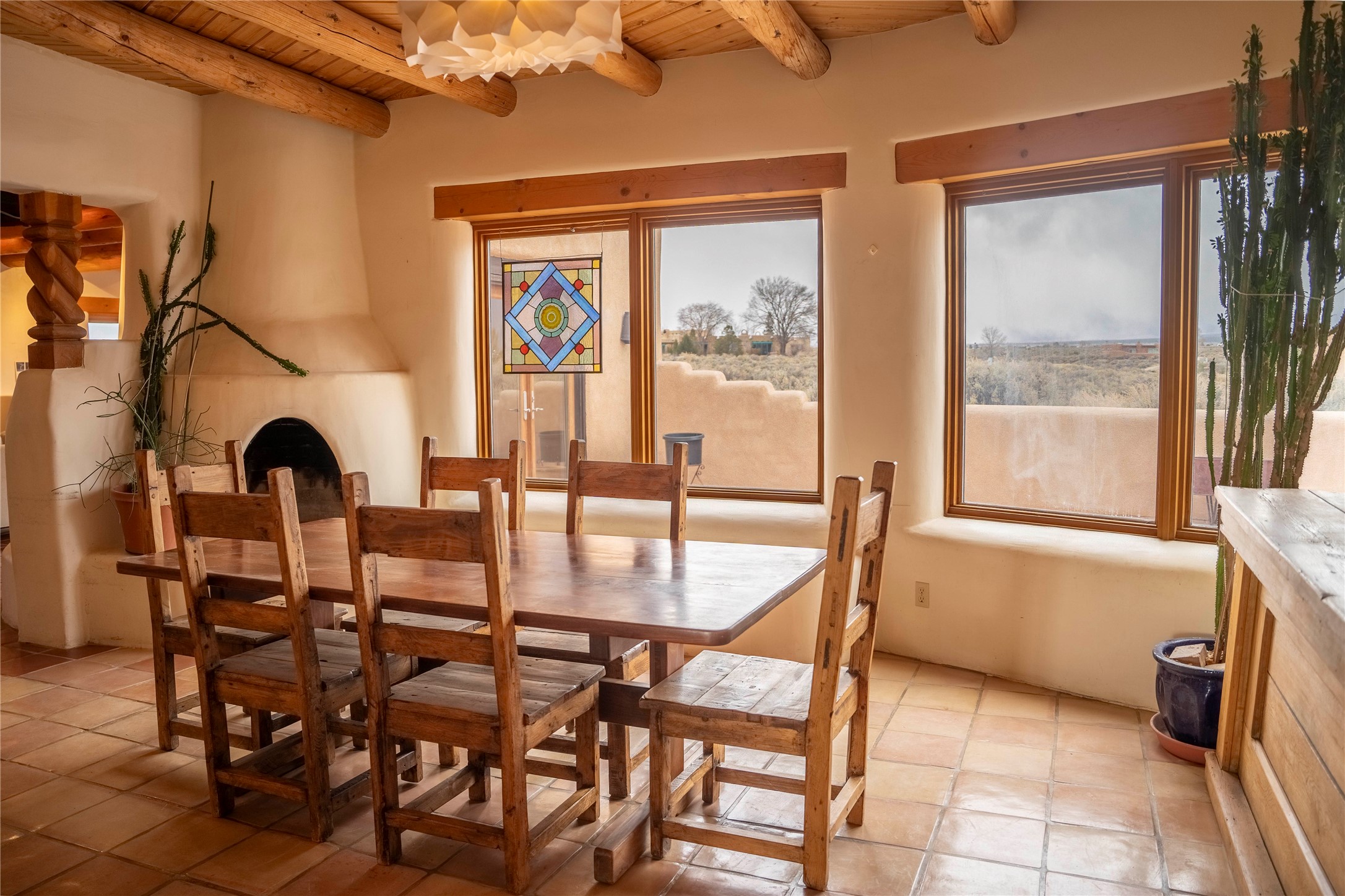 Looking for big views, tranquility and comfort! Well, look no further. Located on a peaceful road off Blueberry Hill, this stunning pueblo-style adobe, built by Godsoe, is a true sanctuary. Listed below appraisal the 2,845 square foot home features three bedrooms, two full baths, and flexible living spaces. Inside, natural light pours through large windows, illuminating rich adobe walls, rustic wood details, and thoughtful solar orientation that enhances year-round comfort. Cozy up by the fireplaces on cool evenings, gather for meals in the charming dining area, or let your culinary creativity shine in the chef's gourmet kitchen with generous counter space, two ovens, pot filler faucet, custom backsplash, Viking appliances and Miele dishwasher. Step outside to a walled courtyard and expansive patios, where you can sip your morning coffee, fire up the outdoor pizza oven for gatherings, or soak in the hot tub and take in the amazing sunsets and night skies. A covered breezeway leads to a spacious 2 car garage, workshop and green house. The 876 square foot workshop/studio is ready to become an artist studio, exercise space, or anything you envision. Eat fresh from your garden, and a greenhouse for year-round growing. Set on 2.16 acres of pristine high desert, it offers plenty of space to roam, relax, and soak in the landscape. Additional perks include natural gas and access to high-speed Wi-Fi. Located between Taos Plaza and Taos Ski Valley, this home offers the best of both worlds--secluded serenity with easy access to world-class skiing, hiking, art, dining, and cultural attractions. Come experience the magic of Taos living!