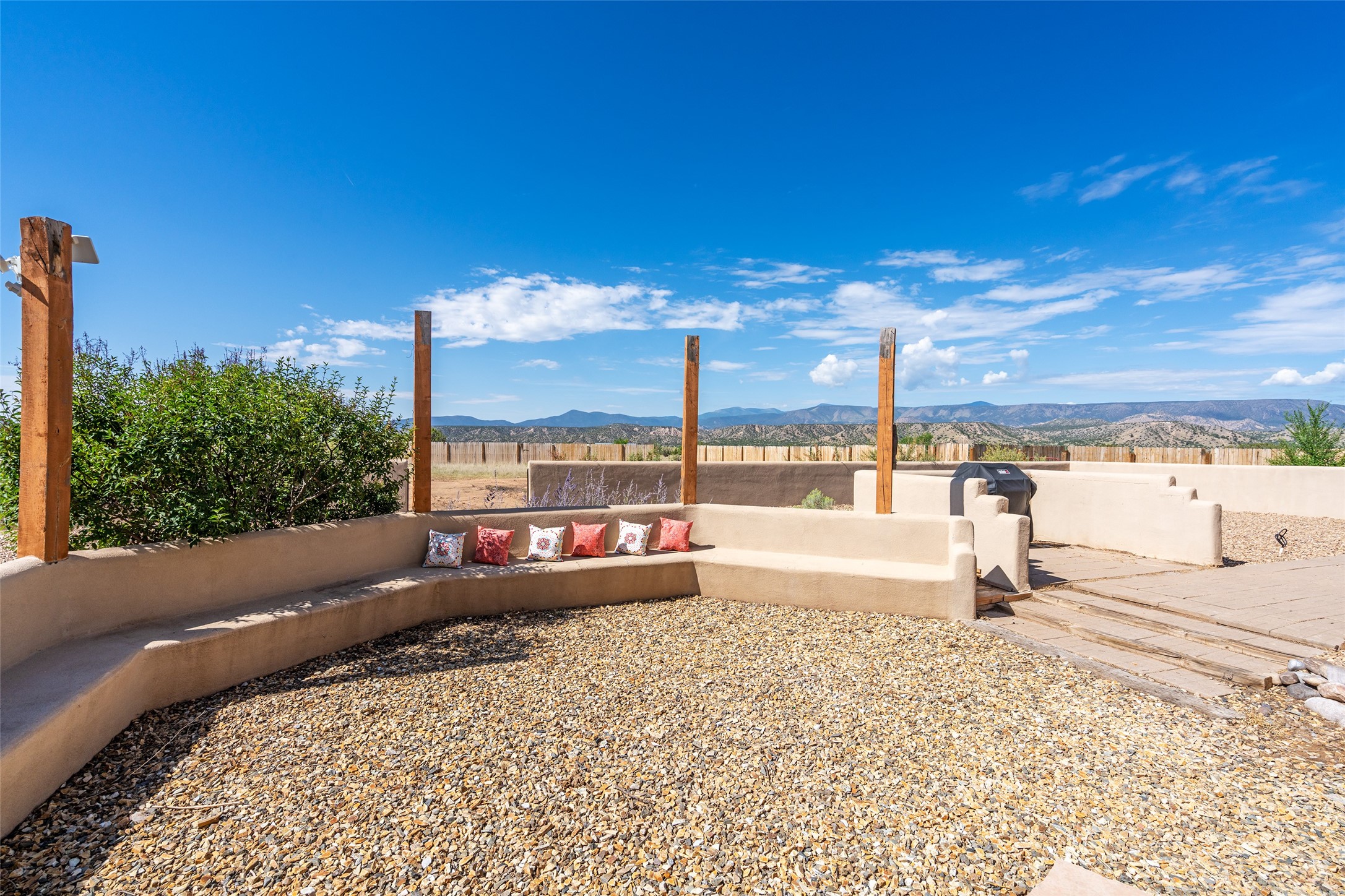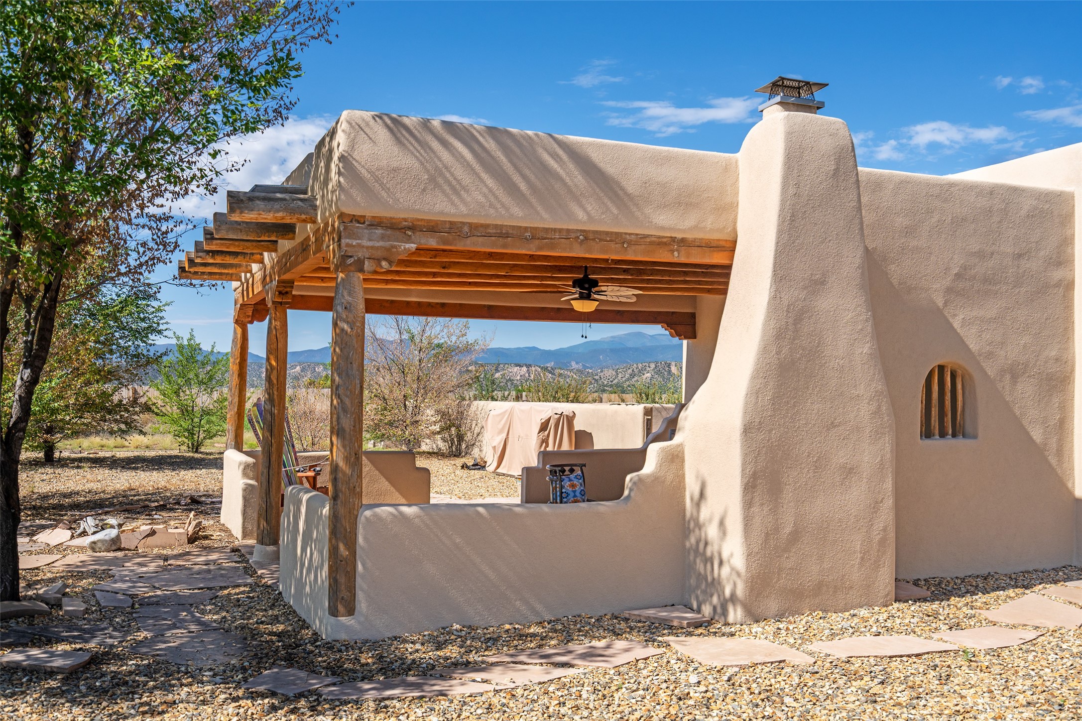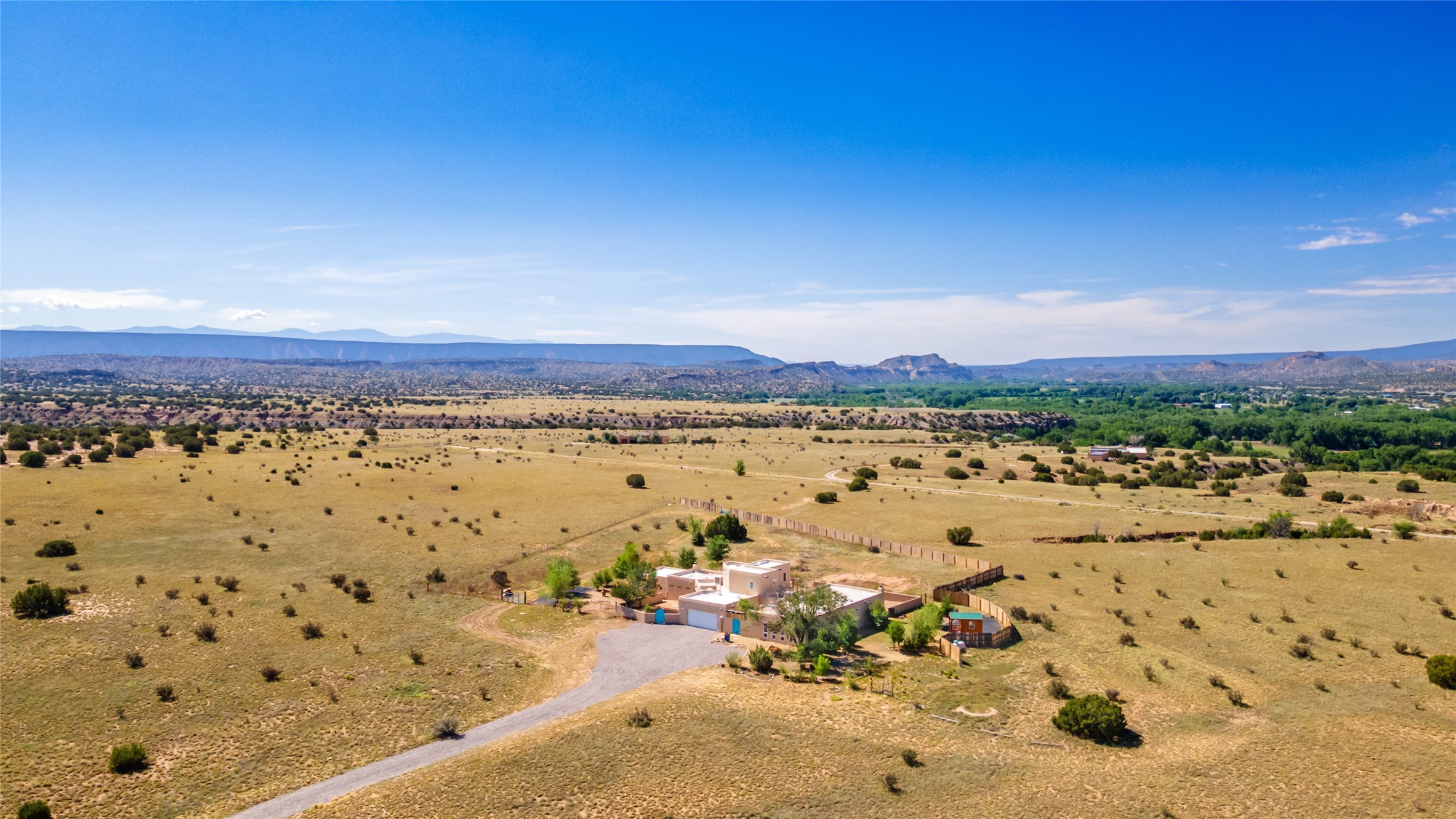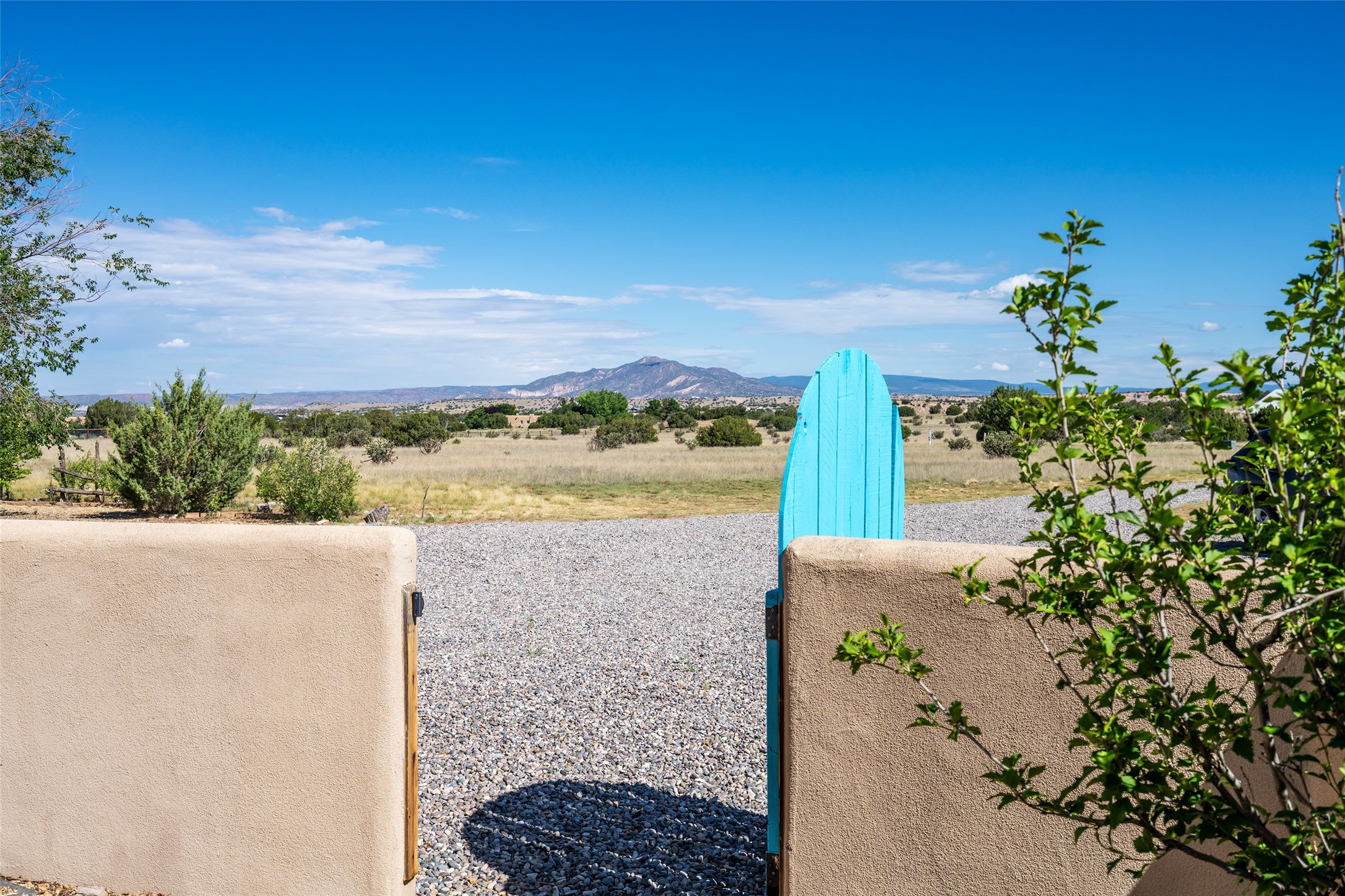 Ideally located for an easy commute to Espanola, Los Alamos and Santa Fe, this classic New Mexico-style home in the Mesa's de Medanales subdivision with No HOA! offers timeless Southwestern character, sweeping mountain views, and exceptional indoor-outdoor living. Set on five peaceful acres with horses welcome and surrounded by open vistas in every direction, the property provides an ideal balance of privacy, space, and convenience just minutes from Abiqui Lake, national forest, and Ojo Caliente Mineral Springs and Spa. At just under 4,000 square feet this mostly single level home features three spacious ensuite bedrooms, a fourth bedroom and a fourth bathroom, making it well suited for multi-generational living, guests, or flexible lifestyle needs. The main-level fourth bedroom is a large, light-filled space complete with a wood stove and cedar closet, offering excellent versatility as a guest suite, studio, or secondary living area. Throughout the home, classic Southwestern details create warmth and authenticity, including brick floors, beamed ceilings, nichos, radiant heat, multiple wood stoves, and three traditional kiva fireplaces. A generous eat-in kitchen serves as the heart of the home and opens to a formal dining room, while a dedicated office or flex space supports remote work, hobbies, or creative pursuits. All bathrooms have been tastefully remodeled with custom finishes and walk-in showers, enhancing both comfort and luxury. Outdoor living is a true highlight, with multiple serene courtyards and expansive exterior spaces designed for year-round enjoyment. A substantial covered portal with a traditional kiva fireplace invites relaxing evenings, entertaining, or simply taking in the remarkable high-desert surroundings. Recent updates add peace of mind and modern convenience, including remodeled bathrooms throughout, new stucco, updated electrical and lighting, fresh driveway gravel, security system and a water filtration and softener system.