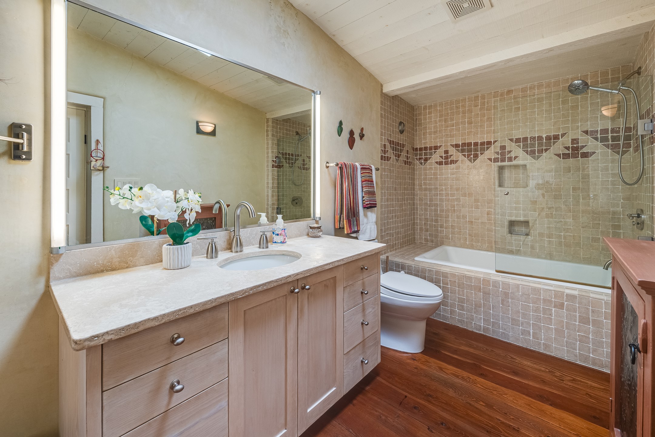 Historically Significant Home in The Don Gaspar Historic District! Step through the gate and discover a piece of Santa Fe history waiting to become your next chapter. This enchanting two-bedroom residence captures the authentic spirit of the Southwest. Traditional vigas stretch across the ceiling, skylights paint golden patterns across wide plank wood flooring, deep window sills hint at adobe behind the polished plaster walls, and a central wood burning fireplace summons you to sit and stay a while. The thoughtfully updated kitchen and bathroom blend modern convenience with timeless character, honoring the home's heritage while embracing contemporary comfort. Every corner whispers stories of generations past. Outside, a private courtyard beckons with sturdy brick pavers and tall walls creating your personal sanctuary. With 2 off-street parking spots and PV solar, this jewel nestled into a corner lot in the charming South Capital neighborhood, this retreat offers the peaceful solitude you crave while keeping downtown's galleries, restaurants, and cultural treasures within easy reach. This is more than a home; it is a lifestyle rooted in artistic tradition and Southwestern soul.