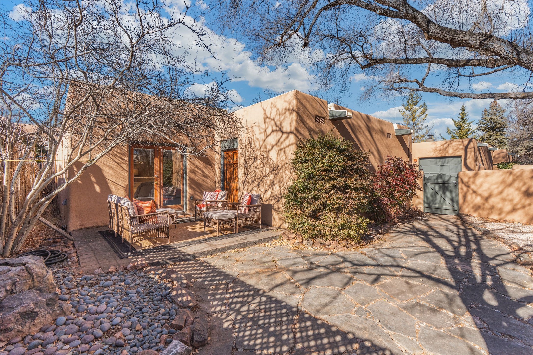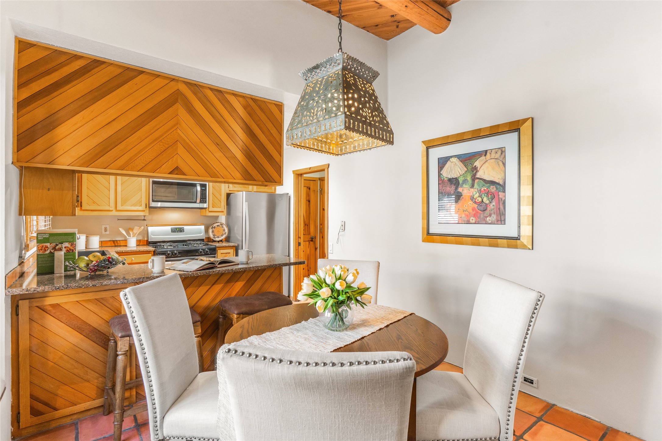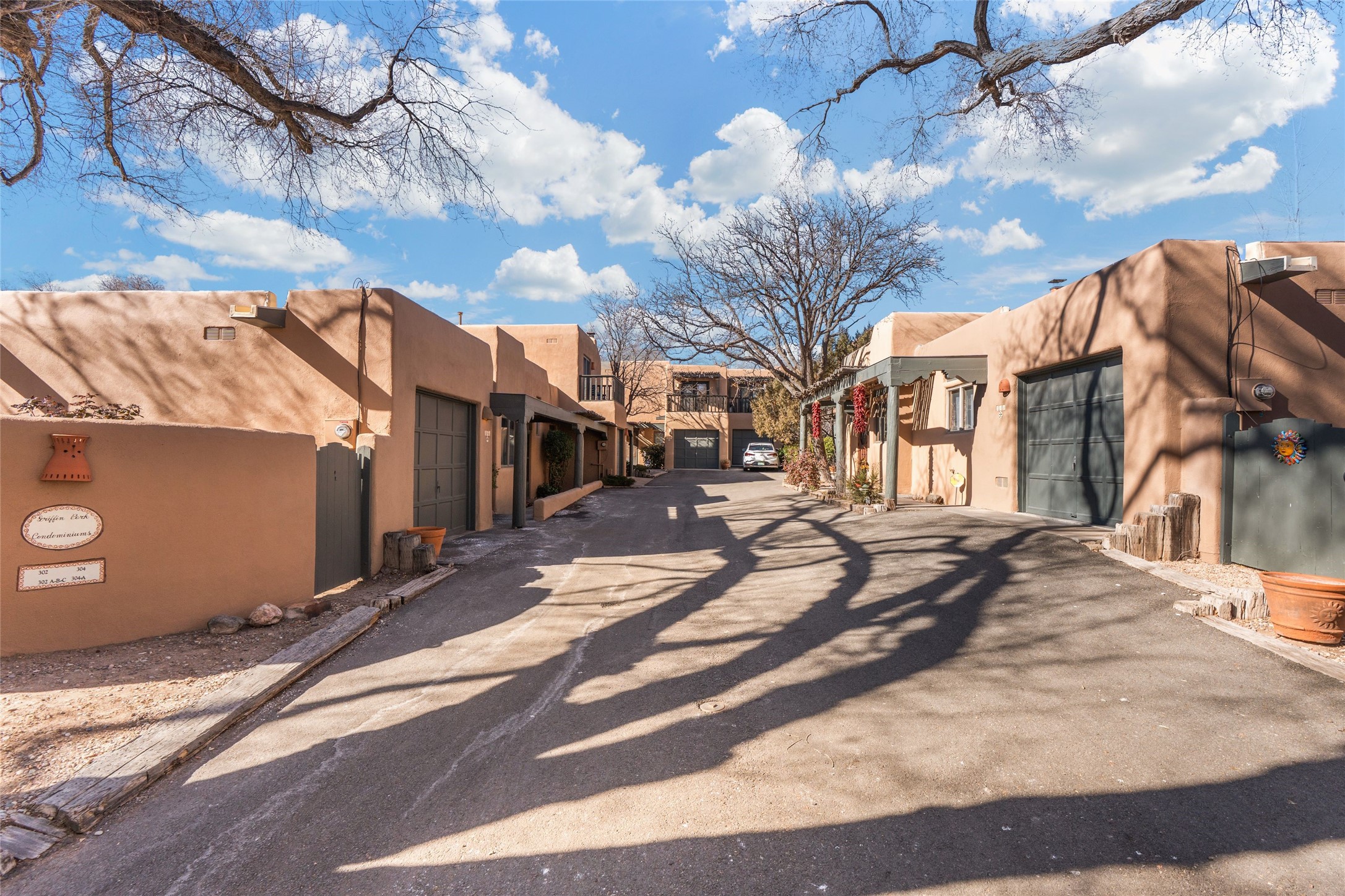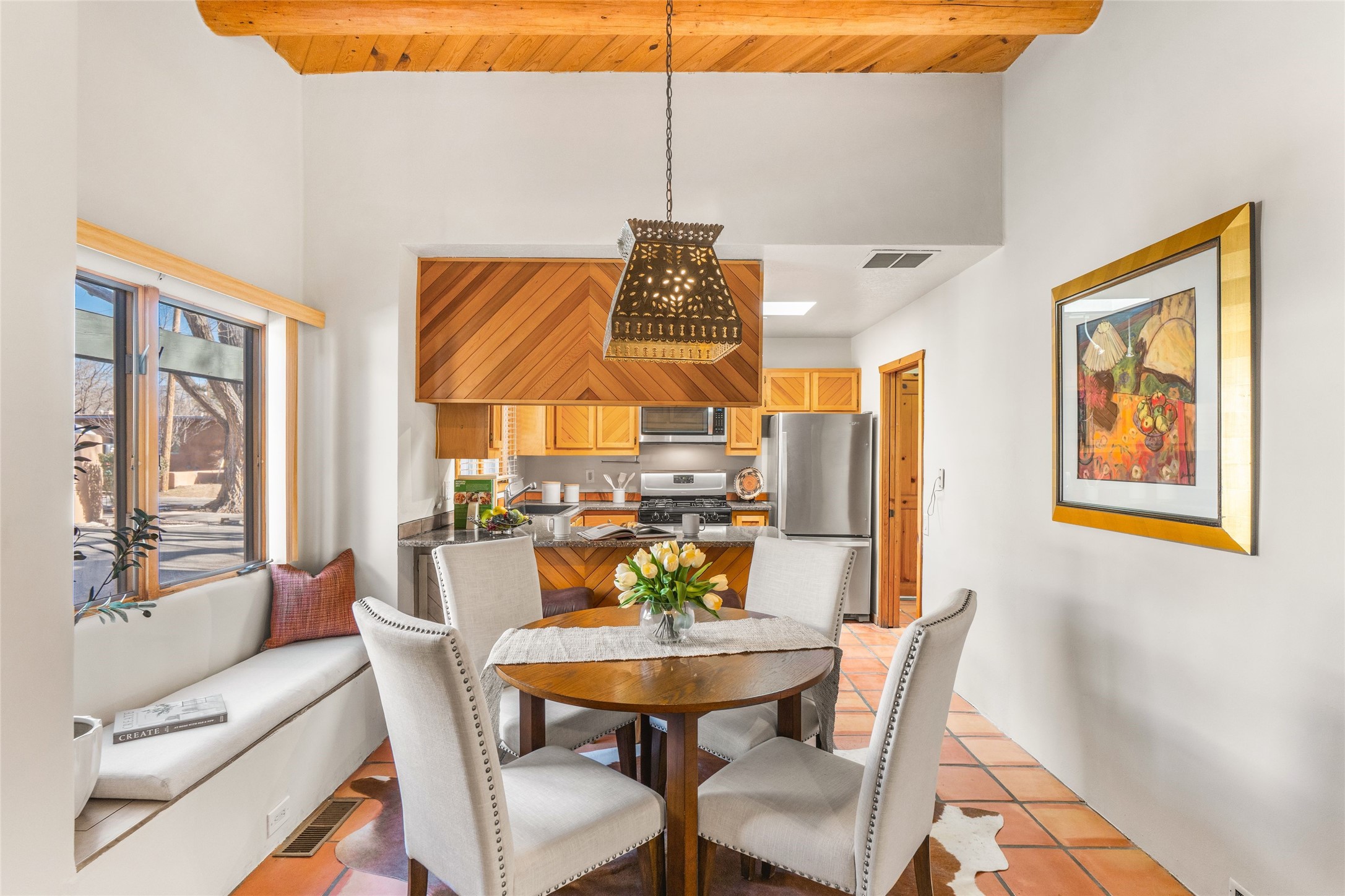 This is it: that coveted downtown Pied-a-Terre, a Santa Fe Stylish, single-level, 2-bedroom, 2-bath end unit with generous courtyard, and direct access, one-car garage. The living room, with its high ceiling, Vigas and corner Kiva fireplace adjoins the light-filled dining area, with Banco and well-ordered kitchen. Classic Saltillo tile runs throughout most of the freshly-painted home. The spacious Primary Bedroom has hardwood flooring, a carpeted, walk-in closet, an ensuite bath with walk-in shower, and French door access to the private, walled courtyard. The second bedroom, with adjacent three-quarter bath, is outfitted with brand new luxury vinyl flooring. The neighborhood has a pleasant, comparatively tranquil feel, yet is just blocks from many restaurants, shops, grocers, galleries and Santa Fe's Historic Plaza.