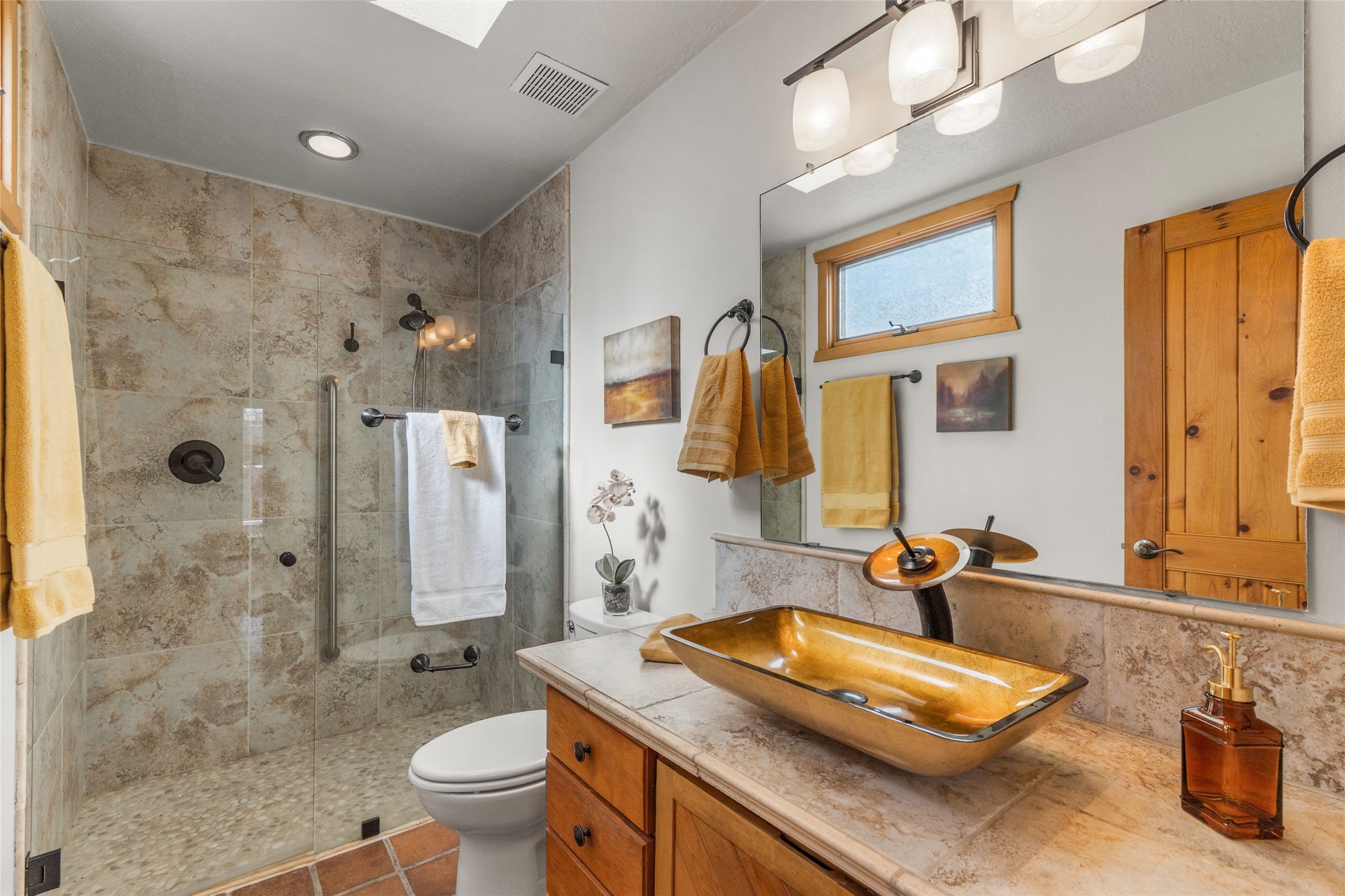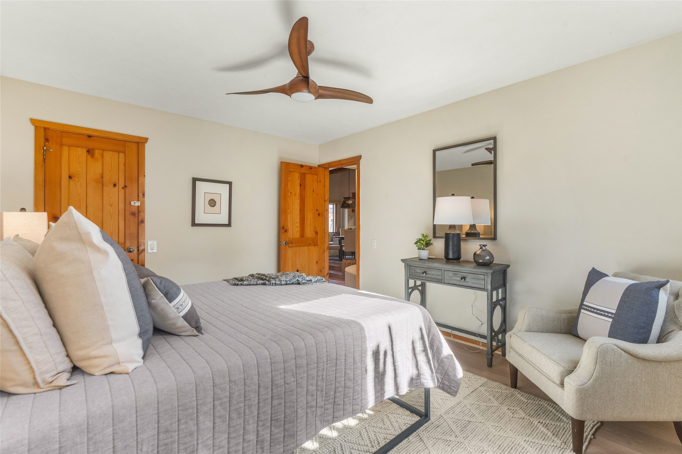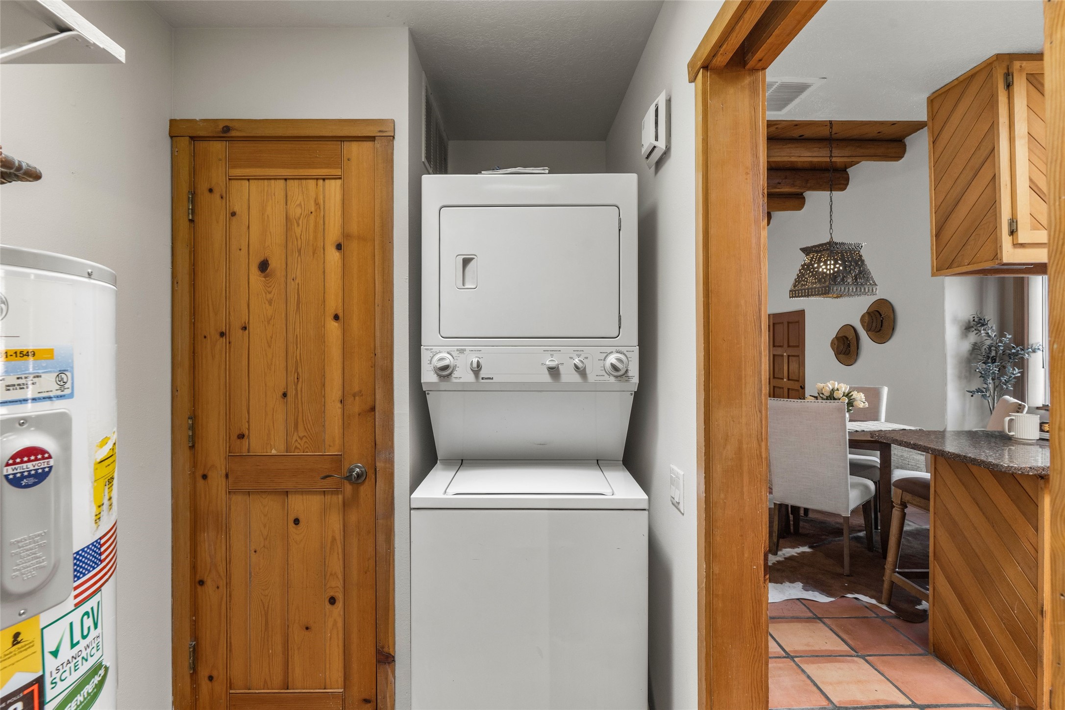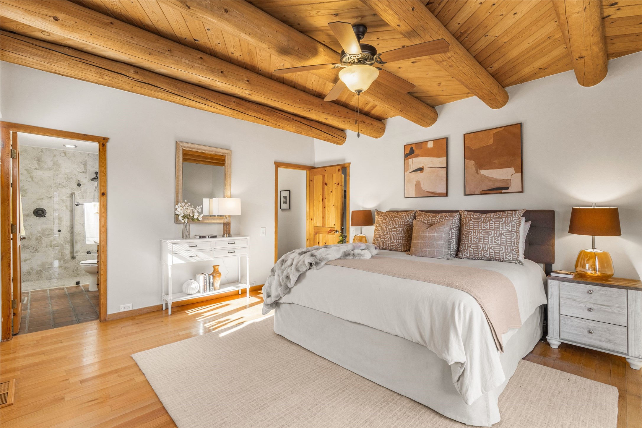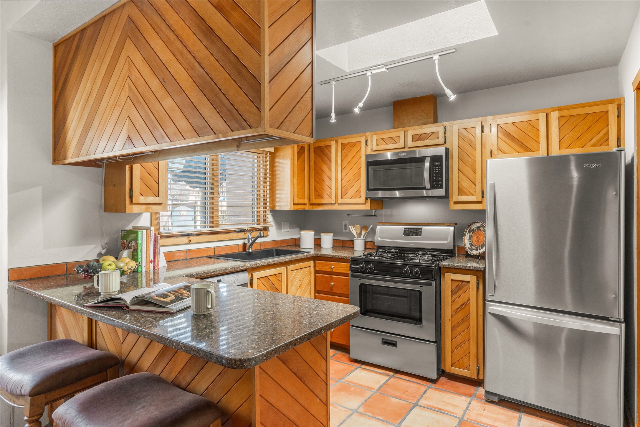 This is it: that coveted downtown Pied-a-Terre, a Santa Fe Stylish, single-level, 2-bedroom, 2-bath end unit with generous courtyard, and direct access, one-car garage. The living room, with its high ceiling, Vigas and corner Kiva fireplace adjoins the light-filled dining area, with Banco and well-ordered kitchen. Classic Saltillo tile runs throughout most of the freshly-painted home. The spacious Primary Bedroom has hardwood flooring, a carpeted, walk-in closet, an ensuite bath with walk-in shower, and French door access to the private, walled courtyard. The second bedroom, with adjacent three-quarter bath, is outfitted with brand new luxury vinyl flooring. The neighborhood has a pleasant, comparatively tranquil feel, yet is just blocks from many restaurants, shops, grocers, galleries and Santa Fe's Historic Plaza.