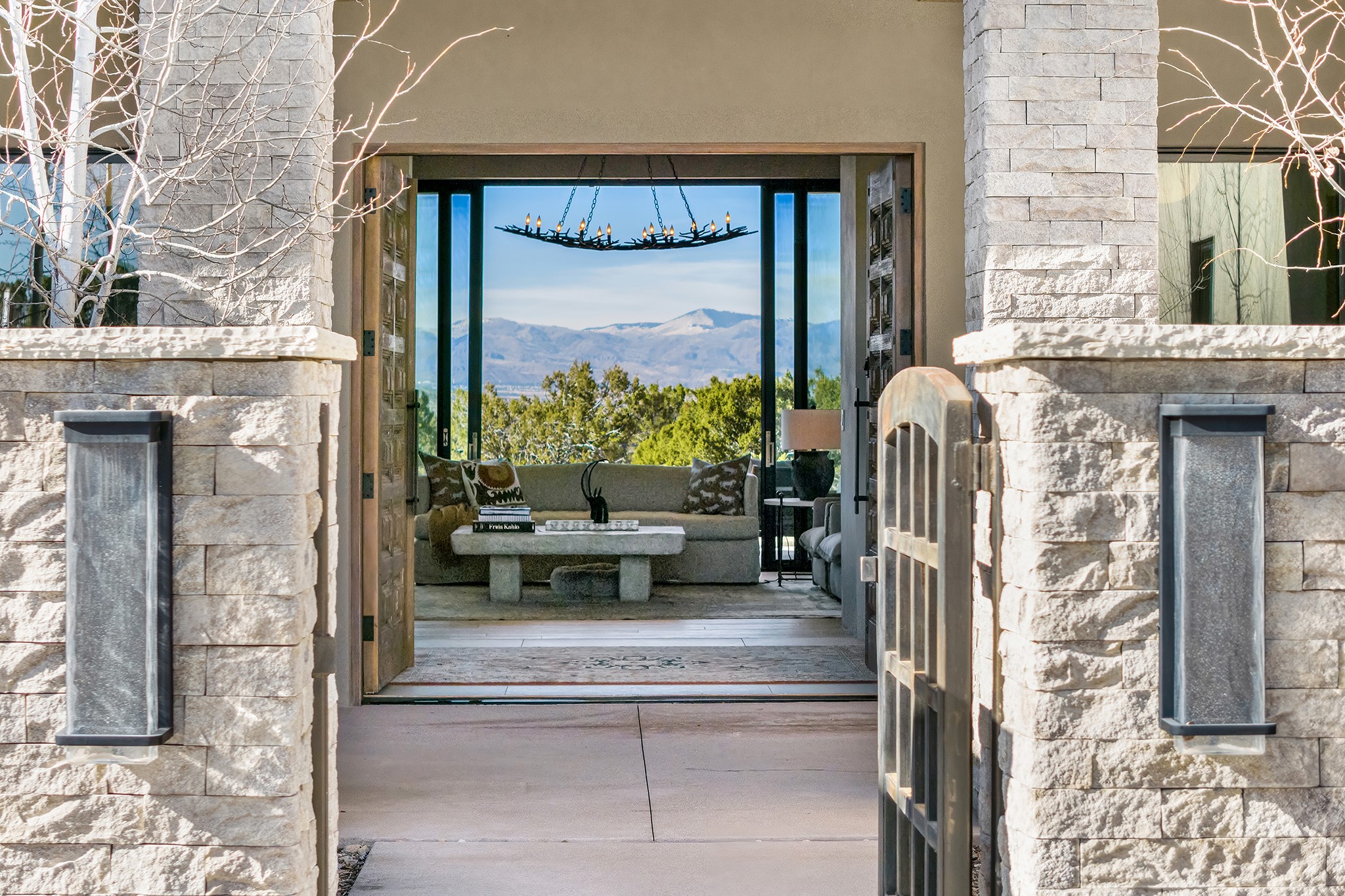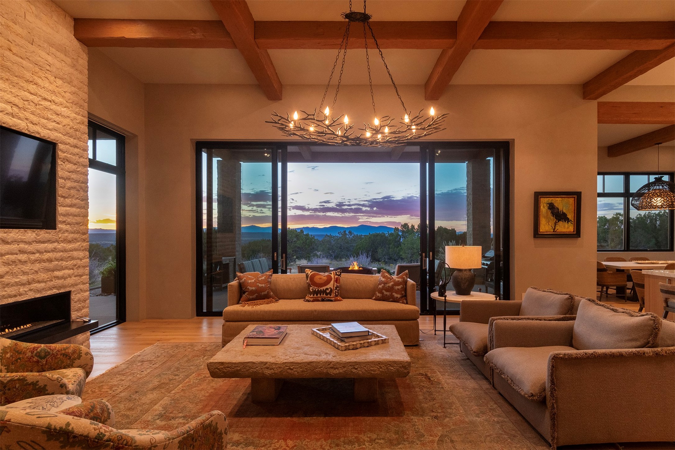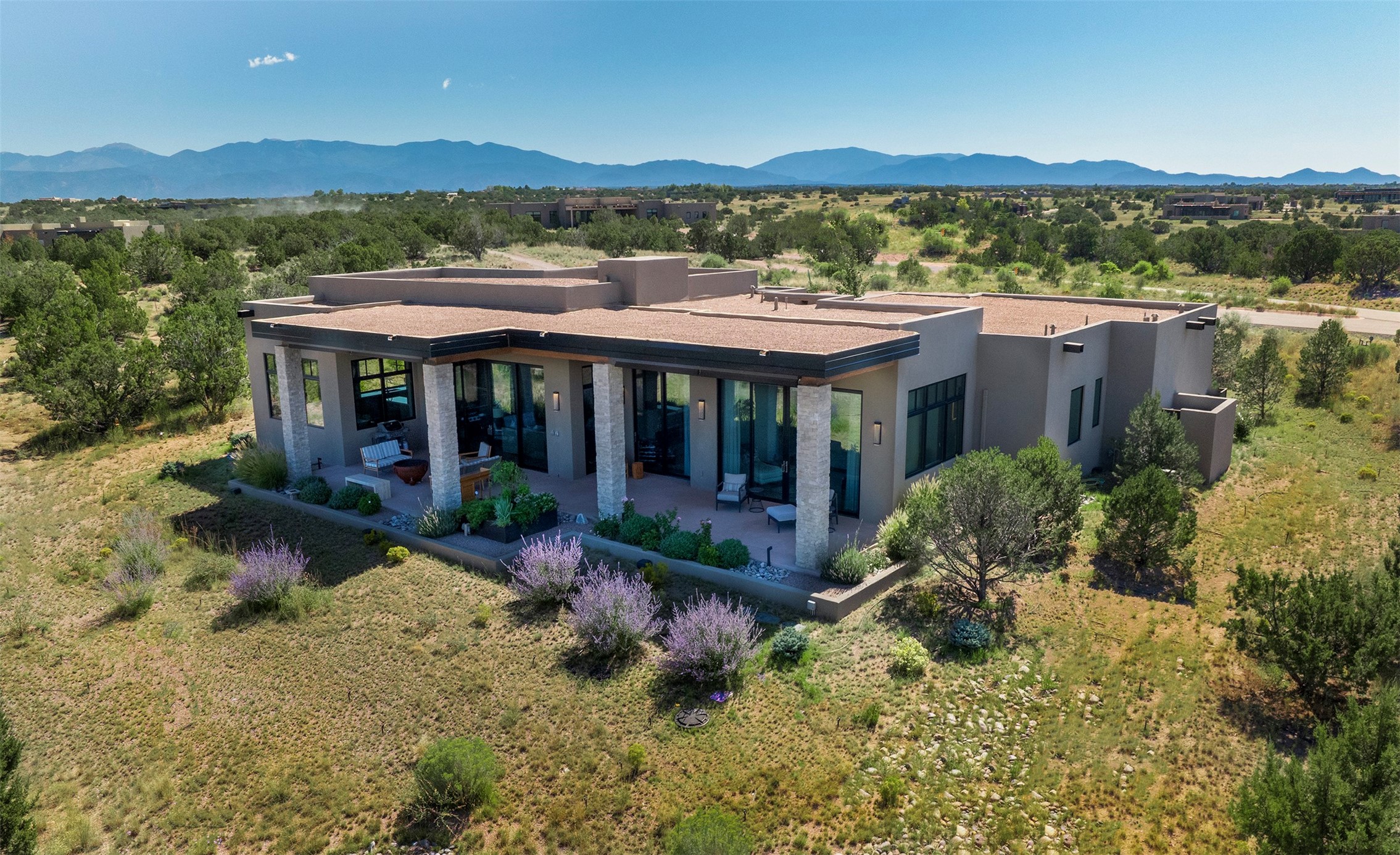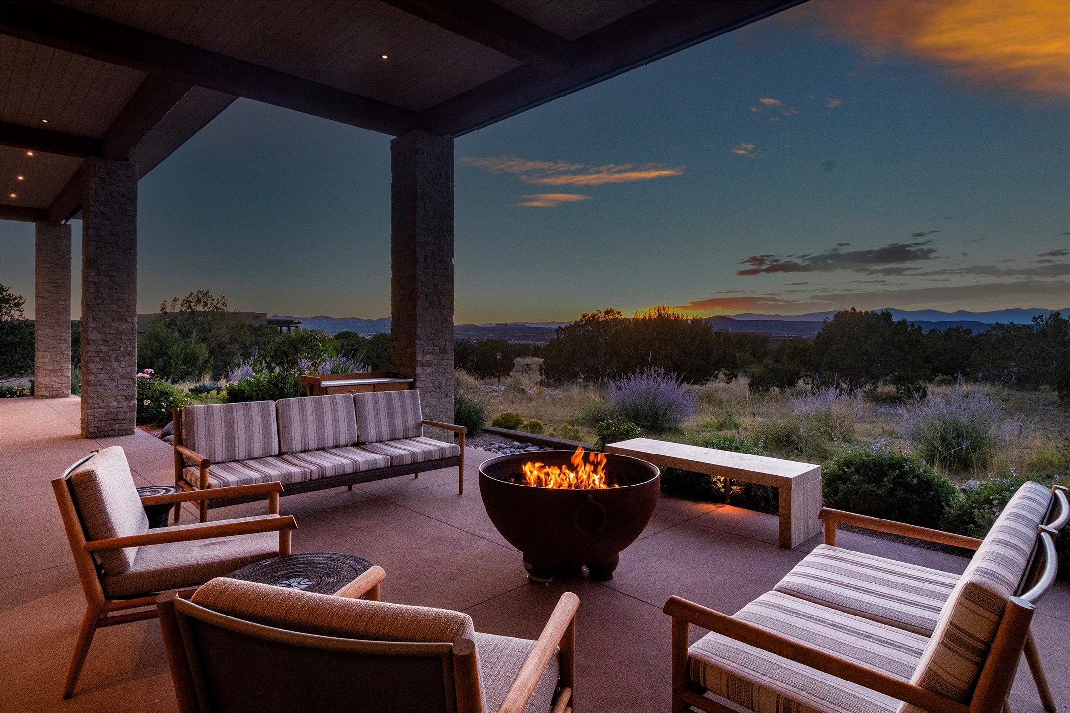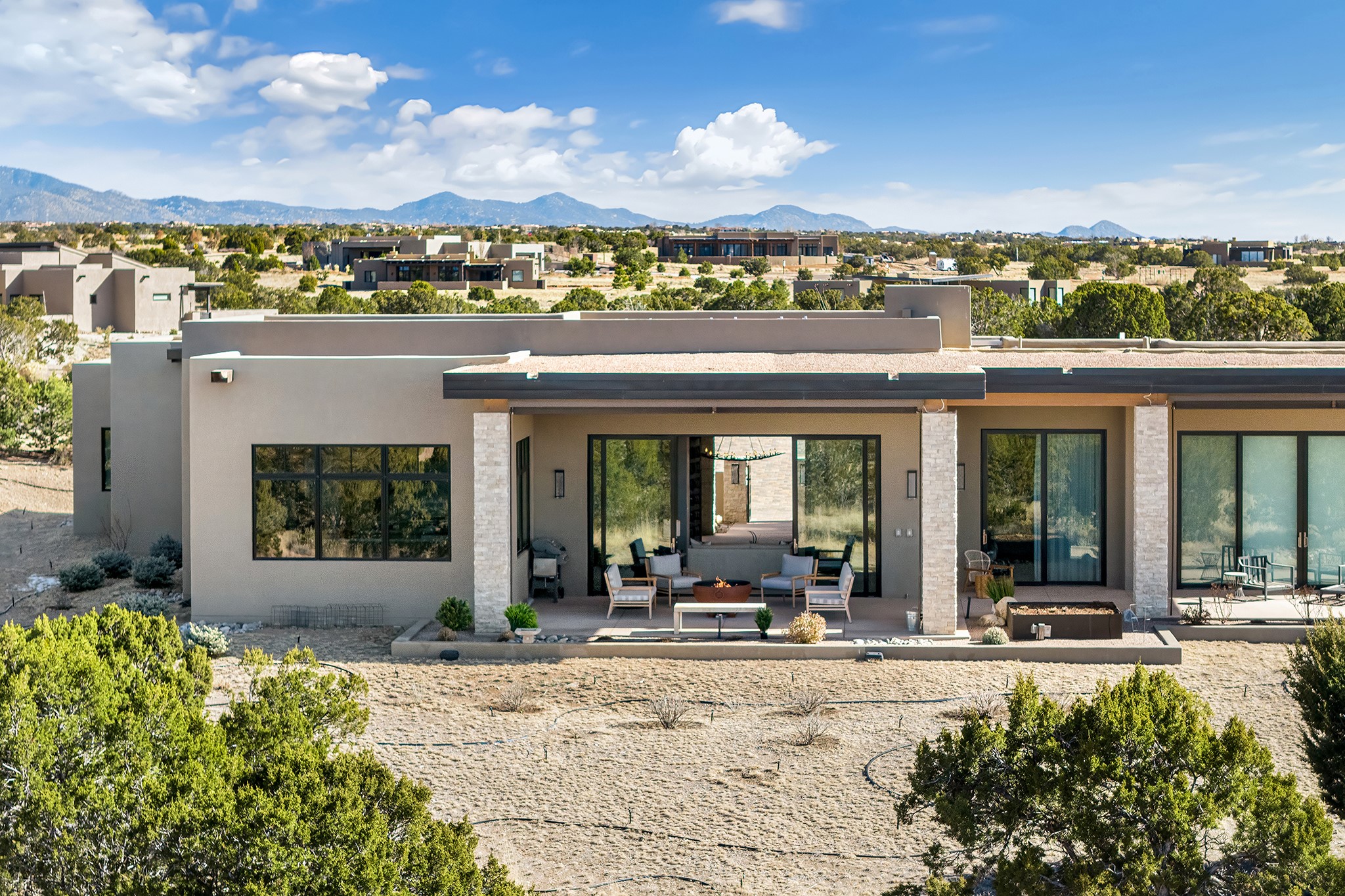 A masterful blend of modernity and warmth, this single-level custom home--built by Prull Custom Builders in 2021-- is sited on 1.8 acres and framed by the panoramic majesty of the Jemez Mountains. Every detail was thoughtfully designed to reflect the natural beauty of New Mexico while embracing clean, contemporary lines and sustainable living.The heart of the home is the expansive living, kitchen, and dining area--anchored by a split stone accent wall with a sleek gas fireplace and wrapped in floor-to-ceiling windows that open to a deep portal with a gas firepit and uninterrupted views. The chef's kitchen is a showpiece, featuring an 8-burner Viking range, Sub-Zero refrigerator, expansive stone countertops, and a large center island with bar seating and a prep sink--ideal for gathering and entertaining.Organic textures and subtle design elements are woven throughout: lime-washed walls, distressed beams, and a soft stone feature wall create a quiet luxury that feels both rooted and elevated. Powered by solar, this home pays homage to the land in both form and function.The private primary suite and adjacent office offer direct access to the portal and inspiring western views. In the guest wing, three bedrooms, two bathrooms, and a media room provide generous accommodation and flexible use. A separate flex room--currently an art studio--is located off the laundry room for added versatility.This is a rare opportunity to own a nearly new, artfully crafted home in the coveted community of Las Campanas--where architecture, sustainability, and the soul of the Southwest converge.