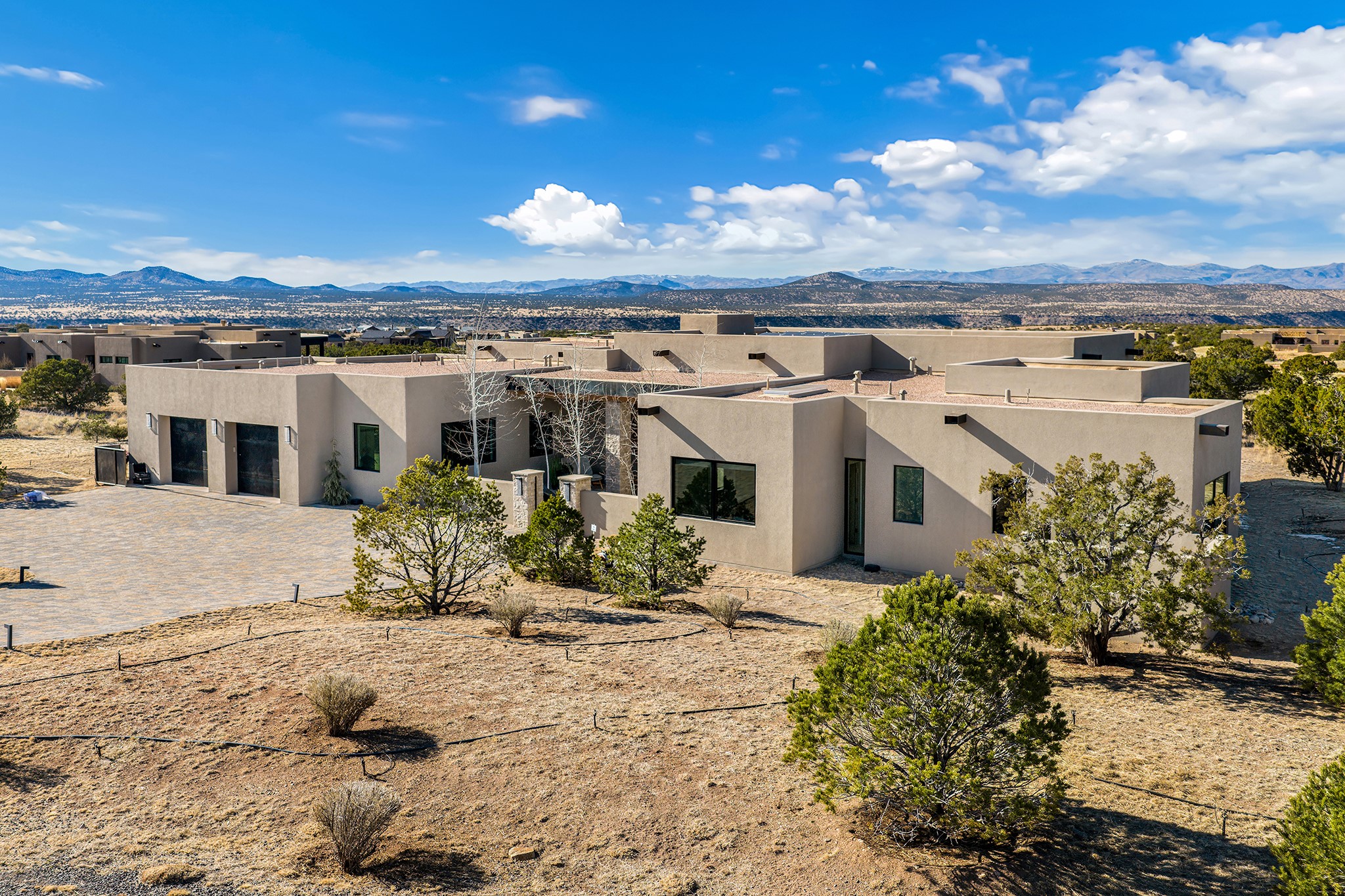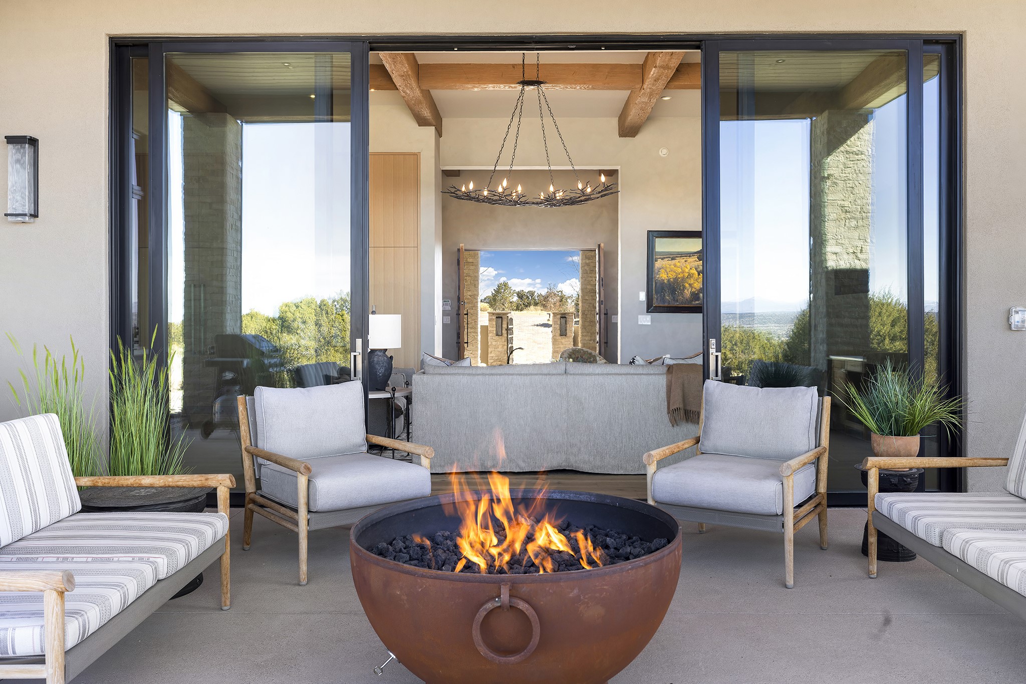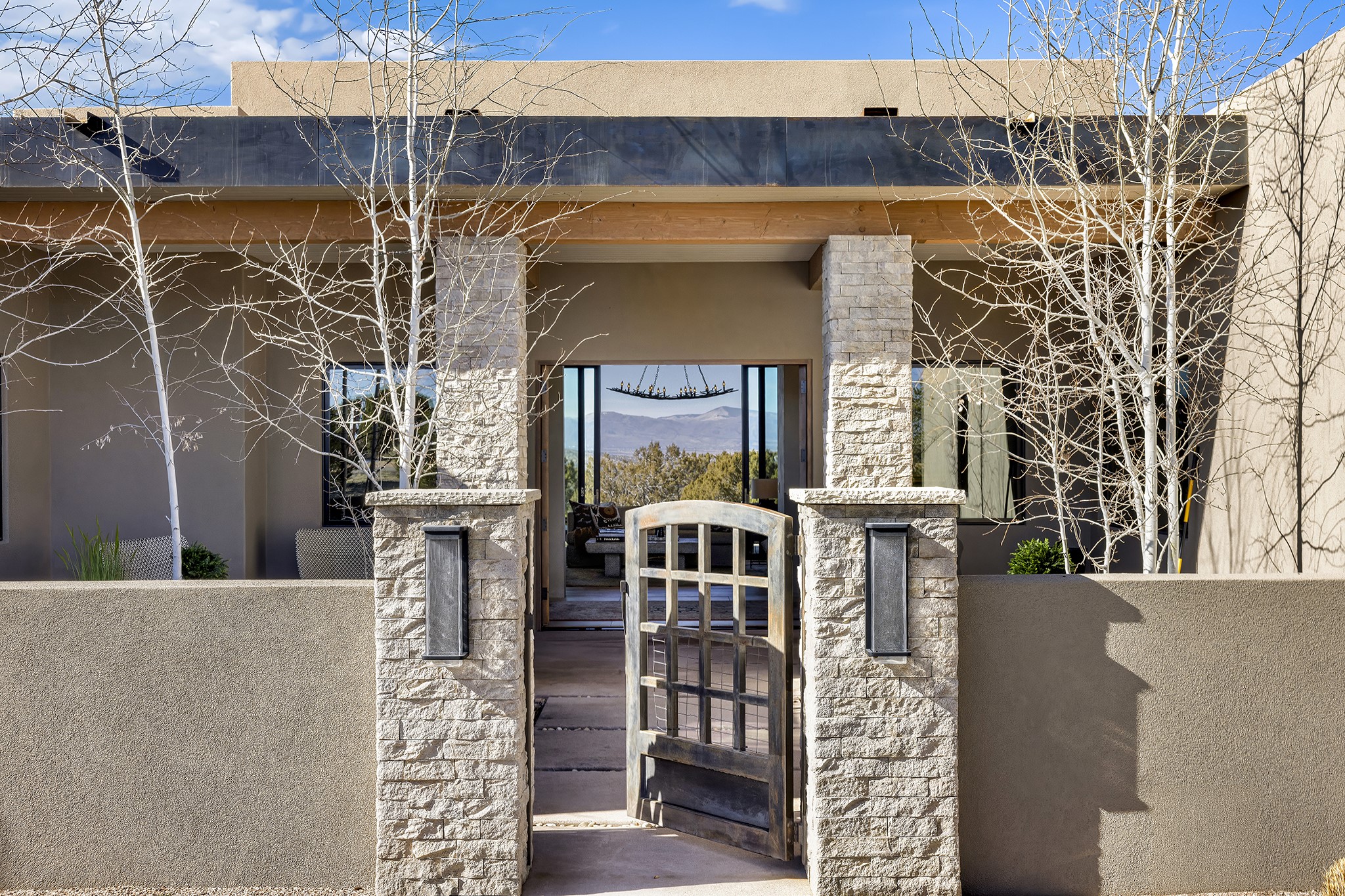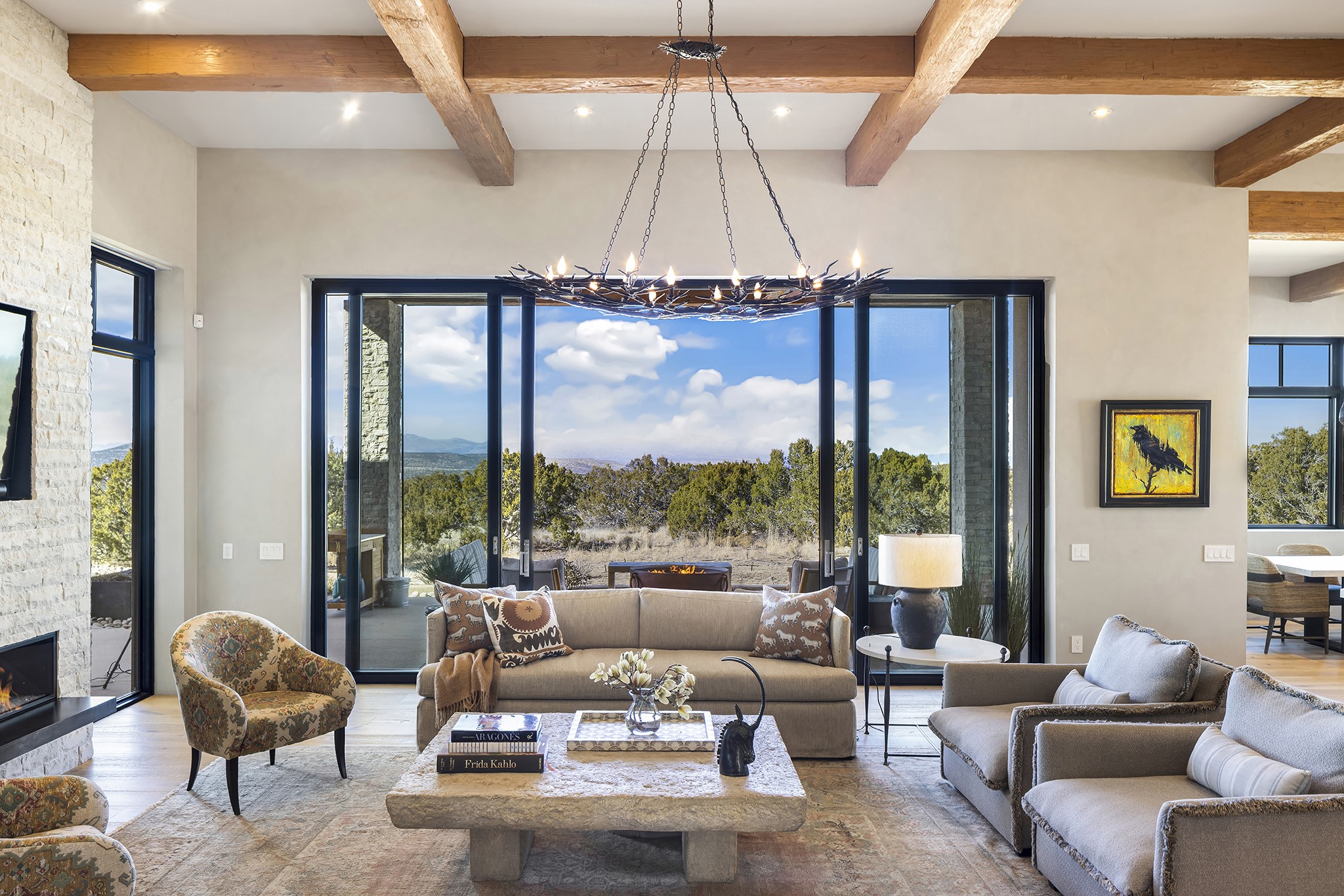 A masterful blend of modernity and warmth, this single-level custom home--built by Prull Custom Builders in 2021-- is sited on 1.8 acres and framed by the panoramic majesty of the Jemez Mountains. Every detail was thoughtfully designed to reflect the natural beauty of New Mexico while embracing clean, contemporary lines and sustainable living.The heart of the home is the expansive living, kitchen, and dining area--anchored by a split stone accent wall with a sleek gas fireplace and wrapped in floor-to-ceiling windows that open to a deep portal with a gas firepit and uninterrupted views. The chef's kitchen is a showpiece, featuring an 8-burner Viking range, Sub-Zero refrigerator, expansive stone countertops, and a large center island with bar seating and a prep sink--ideal for gathering and entertaining.Organic textures and subtle design elements are woven throughout: lime-washed walls, distressed beams, and a soft stone feature wall create a quiet luxury that feels both rooted and elevated. Powered by solar, this home pays homage to the land in both form and function.The private primary suite and adjacent office offer direct access to the portal and inspiring western views. In the guest wing, three bedrooms, two bathrooms, and a media room provide generous accommodation and flexible use. A separate flex room--currently an art studio--is located off the laundry room for added versatility.This is a rare opportunity to own a nearly new, artfully crafted home in the coveted community of Las Campanas--where architecture, sustainability, and the soul of the Southwest converge.