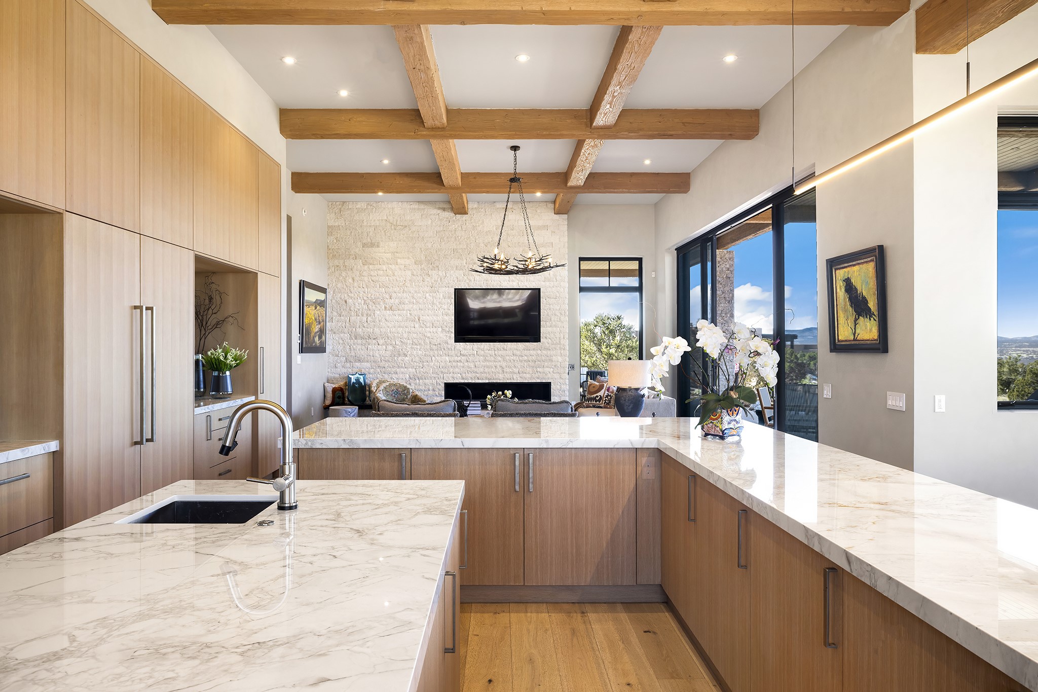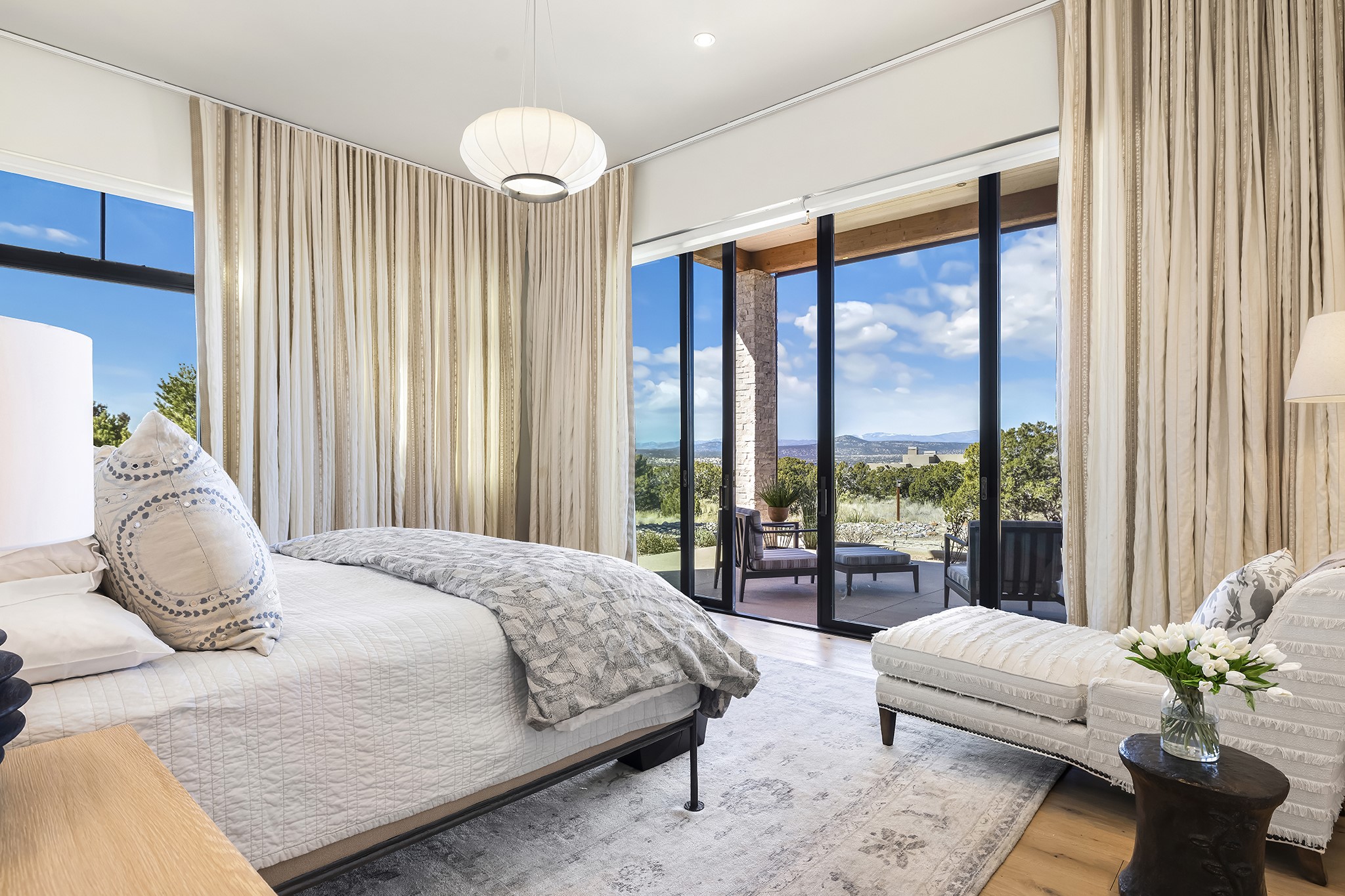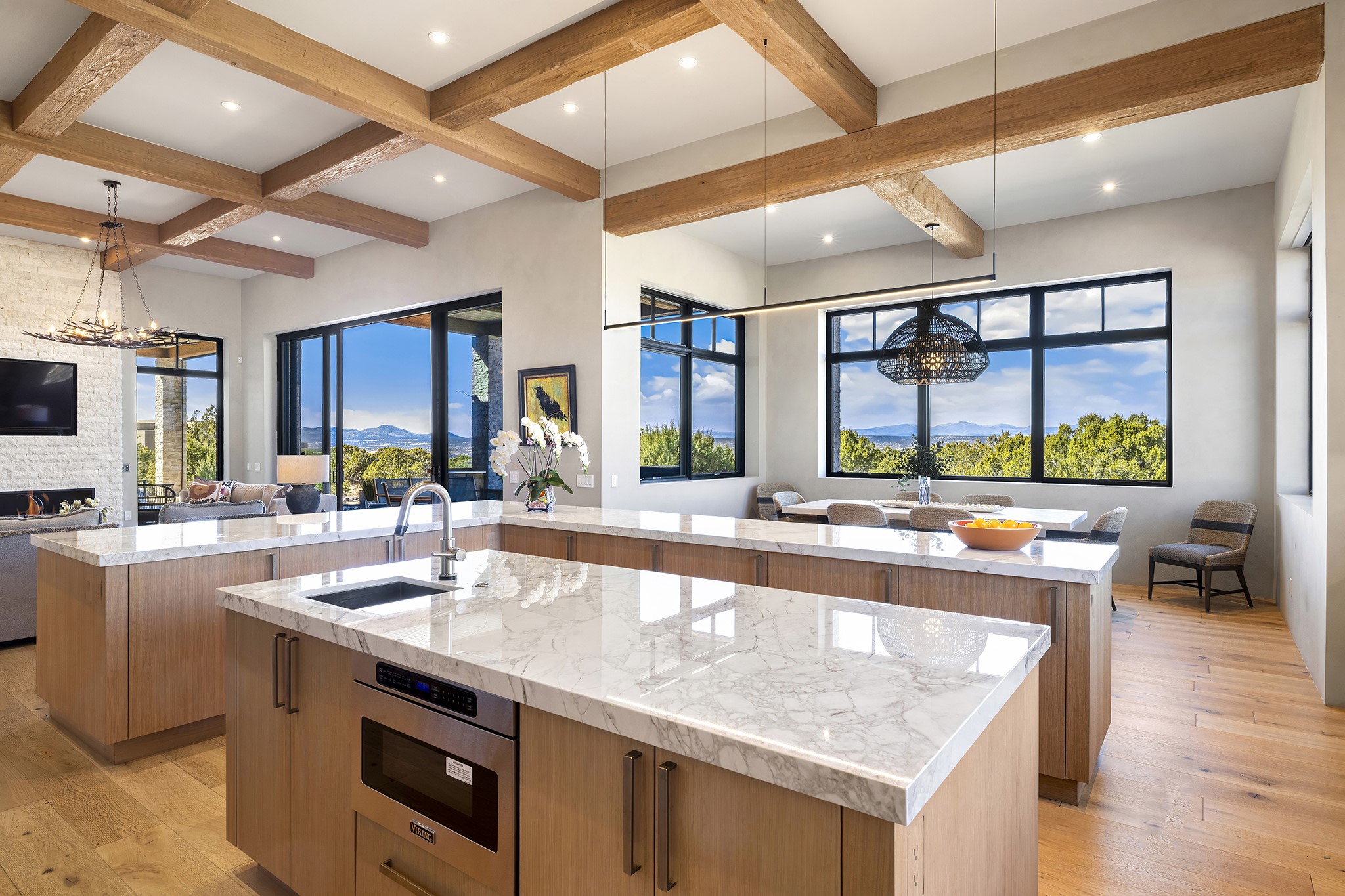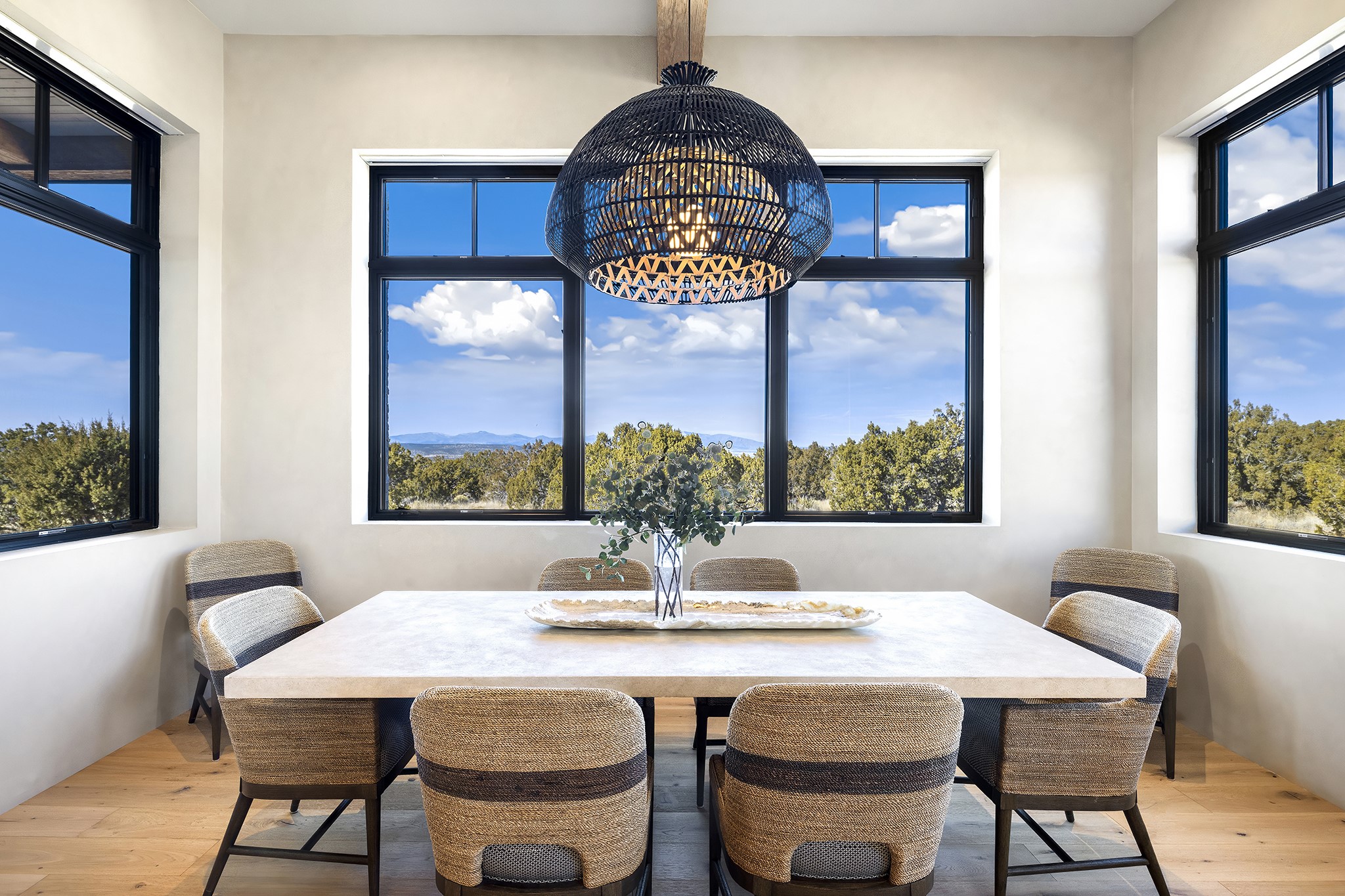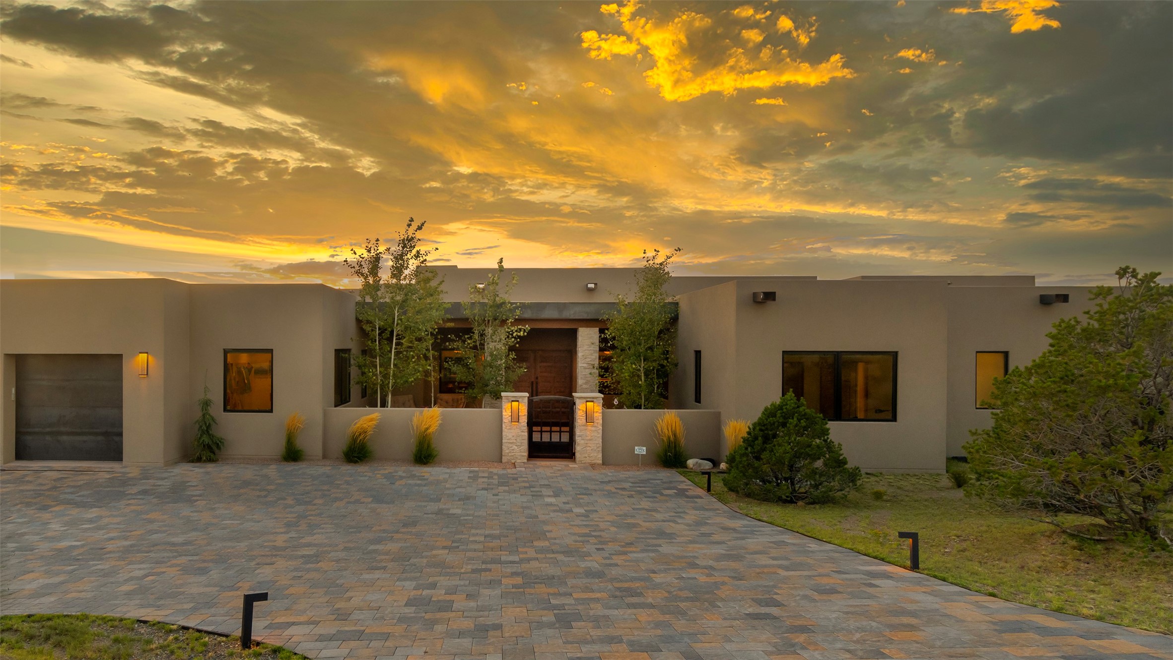 A masterful blend of modernity and warmth, this single-level custom home--built by Prull Custom Builders in 2021-- is sited on 1.8 acres and framed by the panoramic majesty of the Jemez Mountains. Every detail was thoughtfully designed to reflect the natural beauty of New Mexico while embracing clean, contemporary lines and sustainable living.The heart of the home is the expansive living, kitchen, and dining area--anchored by a split stone accent wall with a sleek gas fireplace and wrapped in floor-to-ceiling windows that open to a deep portal with a gas firepit and uninterrupted views. The chef's kitchen is a showpiece, featuring an 8-burner Viking range, Sub-Zero refrigerator, expansive stone countertops, and a large center island with bar seating and a prep sink--ideal for gathering and entertaining.Organic textures and subtle design elements are woven throughout: lime-washed walls, distressed beams, and a soft stone feature wall create a quiet luxury that feels both rooted and elevated. Powered by solar, this home pays homage to the land in both form and function.The private primary suite and adjacent office offer direct access to the portal and inspiring western views. In the guest wing, three bedrooms, two bathrooms, and a media room provide generous accommodation and flexible use. A separate flex room--currently an art studio--is located off the laundry room for added versatility.This is a rare opportunity to own a nearly new, artfully crafted home in the coveted community of Las Campanas--where architecture, sustainability, and the soul of the Southwest converge.