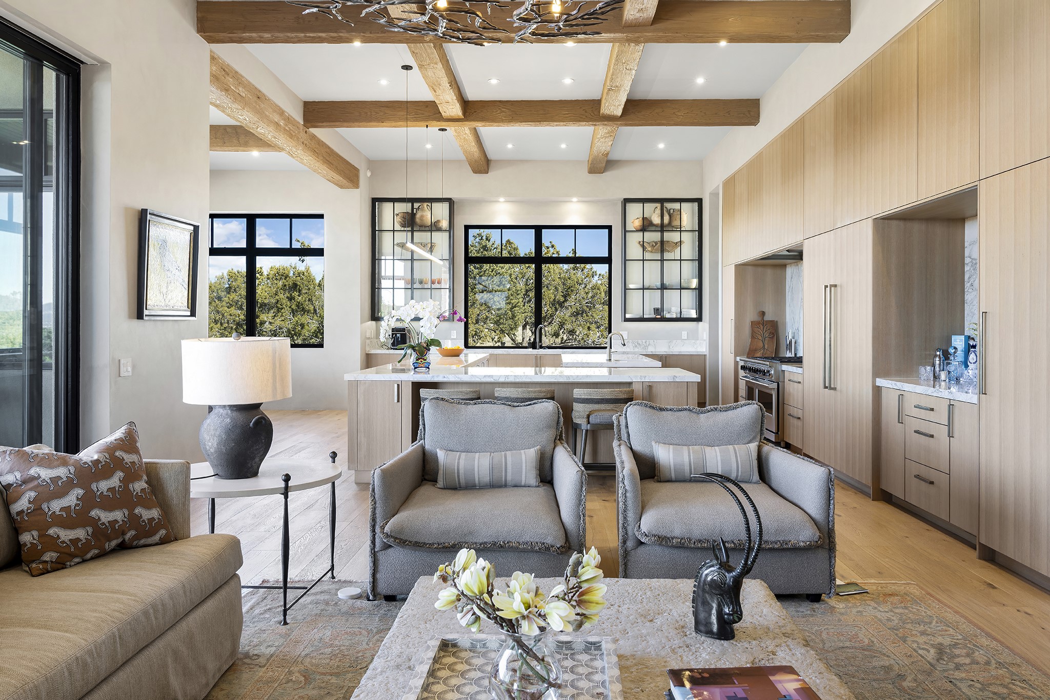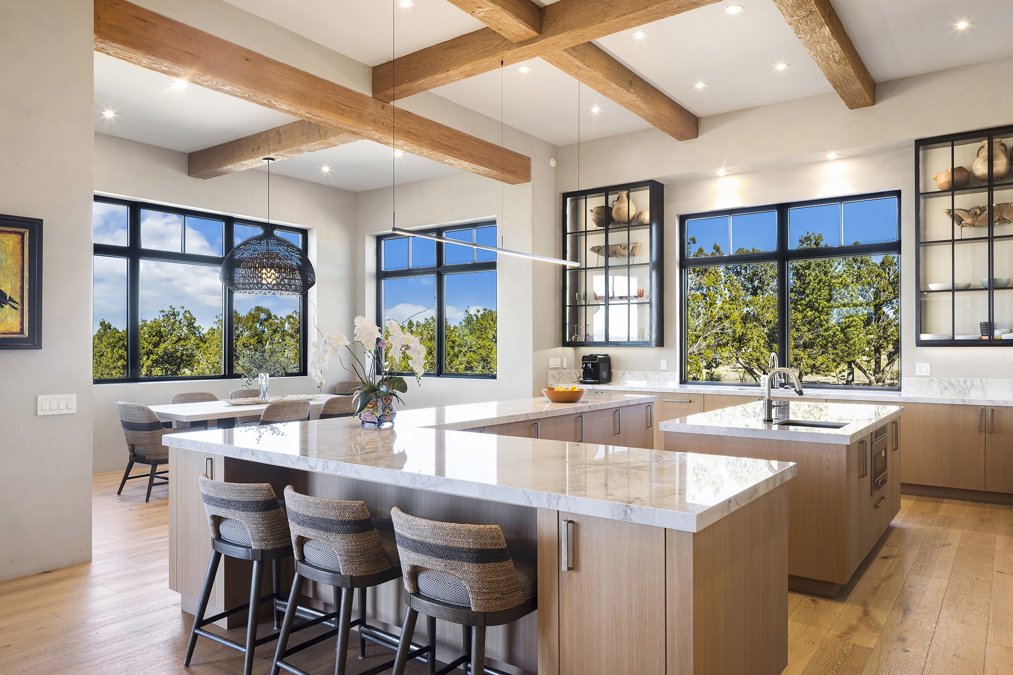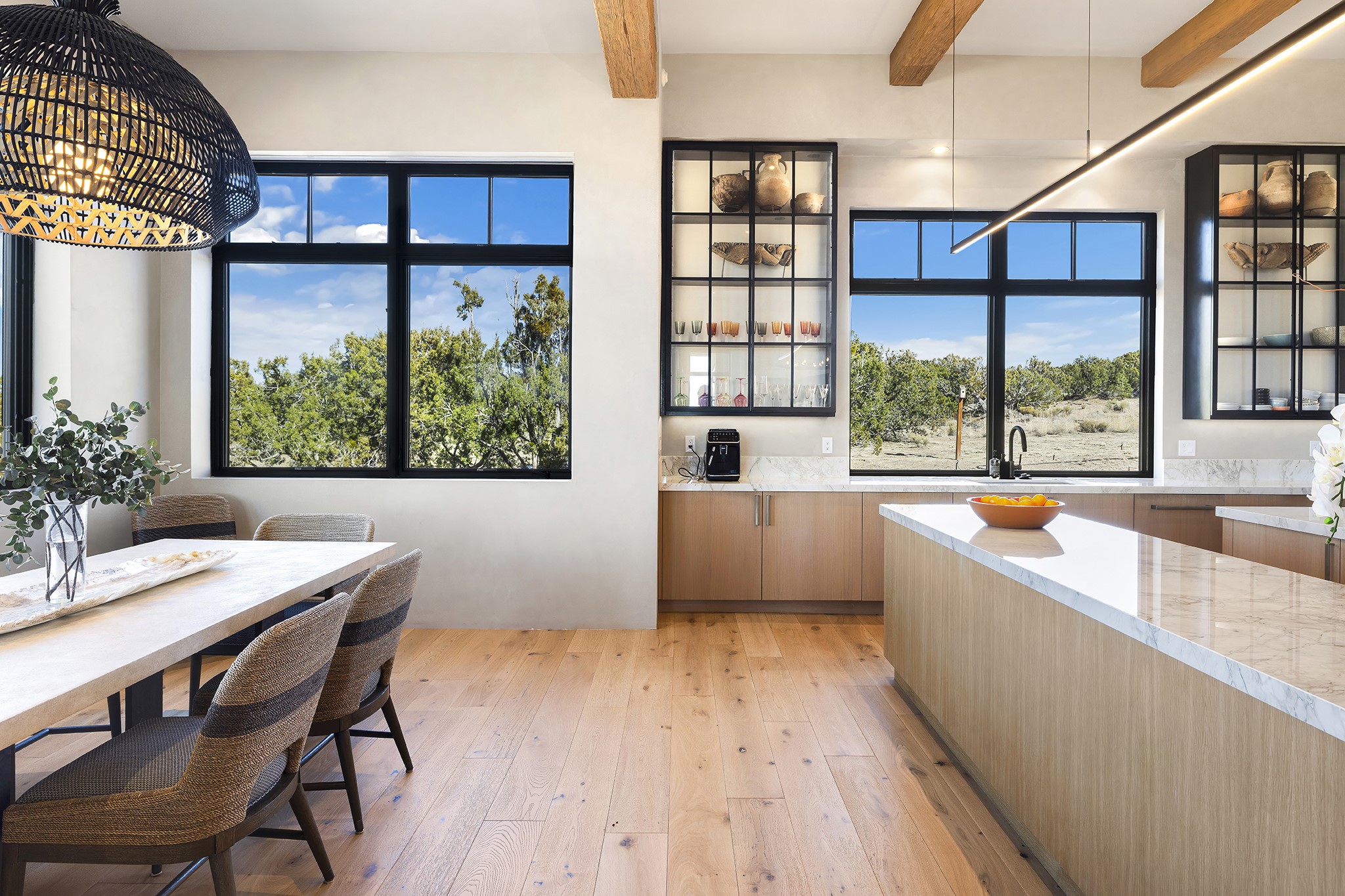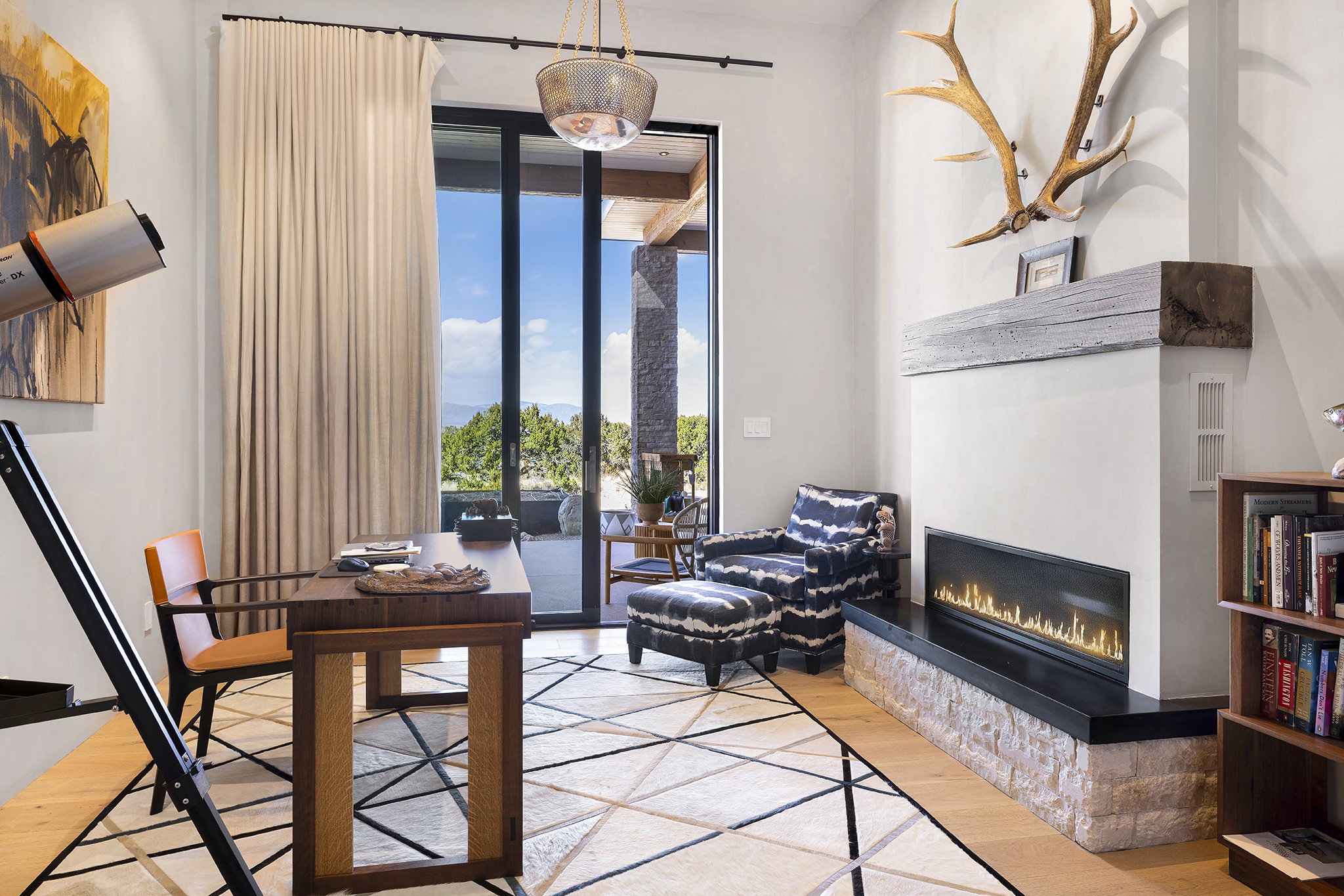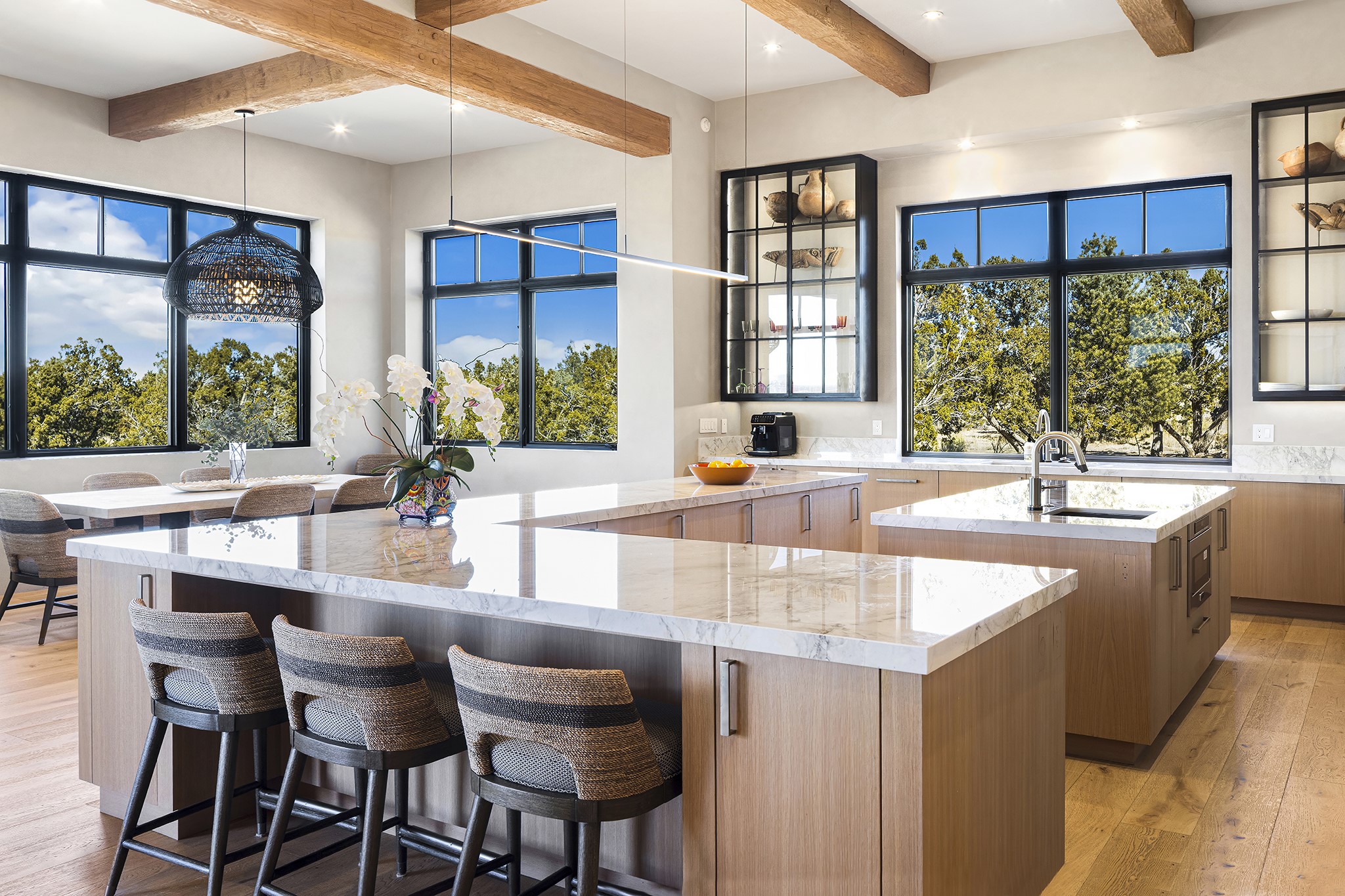 A masterful blend of modernity and warmth, this single-level custom home--built by Prull Custom Builders in 2021-- is sited on 1.8 acres and framed by the panoramic majesty of the Jemez Mountains. Every detail was thoughtfully designed to reflect the natural beauty of New Mexico while embracing clean, contemporary lines and sustainable living.The heart of the home is the expansive living, kitchen, and dining area--anchored by a split stone accent wall with a sleek gas fireplace and wrapped in floor-to-ceiling windows that open to a deep portal with a gas firepit and uninterrupted views. The chef's kitchen is a showpiece, featuring an 8-burner Viking range, Sub-Zero refrigerator, expansive stone countertops, and a large center island with bar seating and a prep sink--ideal for gathering and entertaining.Organic textures and subtle design elements are woven throughout: lime-washed walls, distressed beams, and a soft stone feature wall create a quiet luxury that feels both rooted and elevated. Powered by solar, this home pays homage to the land in both form and function.The private primary suite and adjacent office offer direct access to the portal and inspiring western views. In the guest wing, three bedrooms, two bathrooms, and a media room provide generous accommodation and flexible use. A separate flex room--currently an art studio--is located off the laundry room for added versatility.This is a rare opportunity to own a nearly new, artfully crafted home in the coveted community of Las Campanas--where architecture, sustainability, and the soul of the Southwest converge.