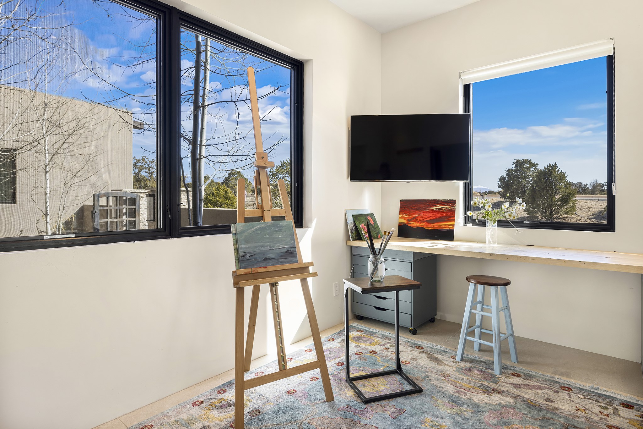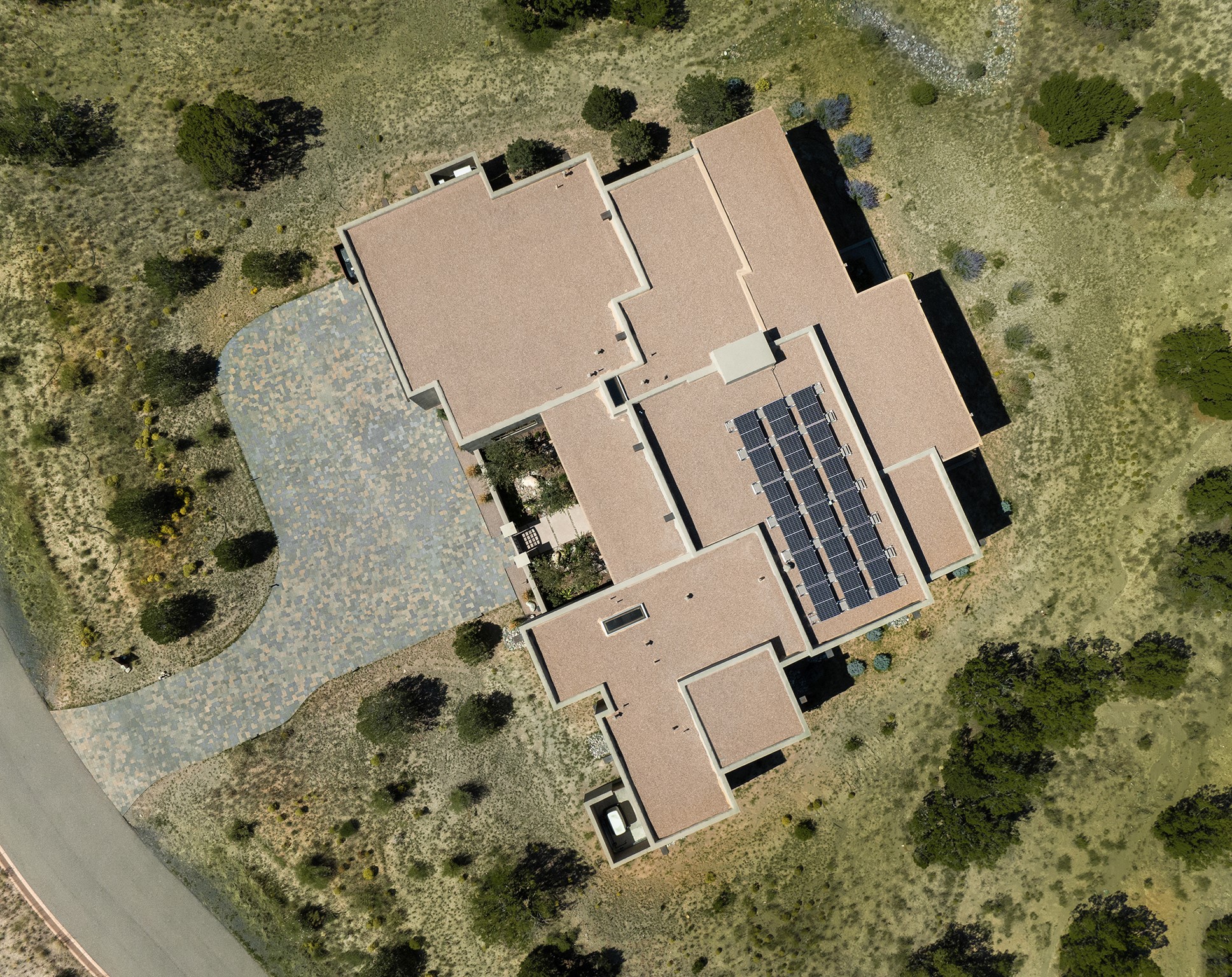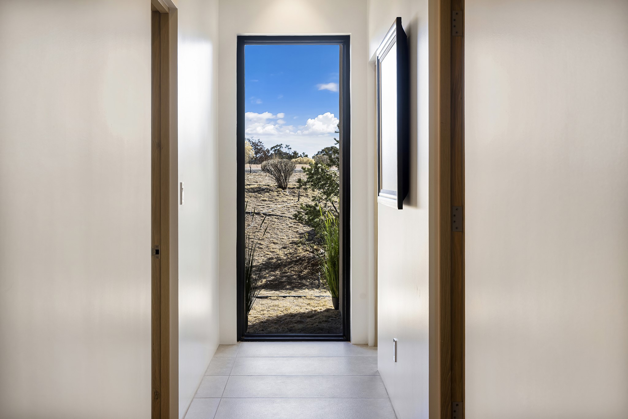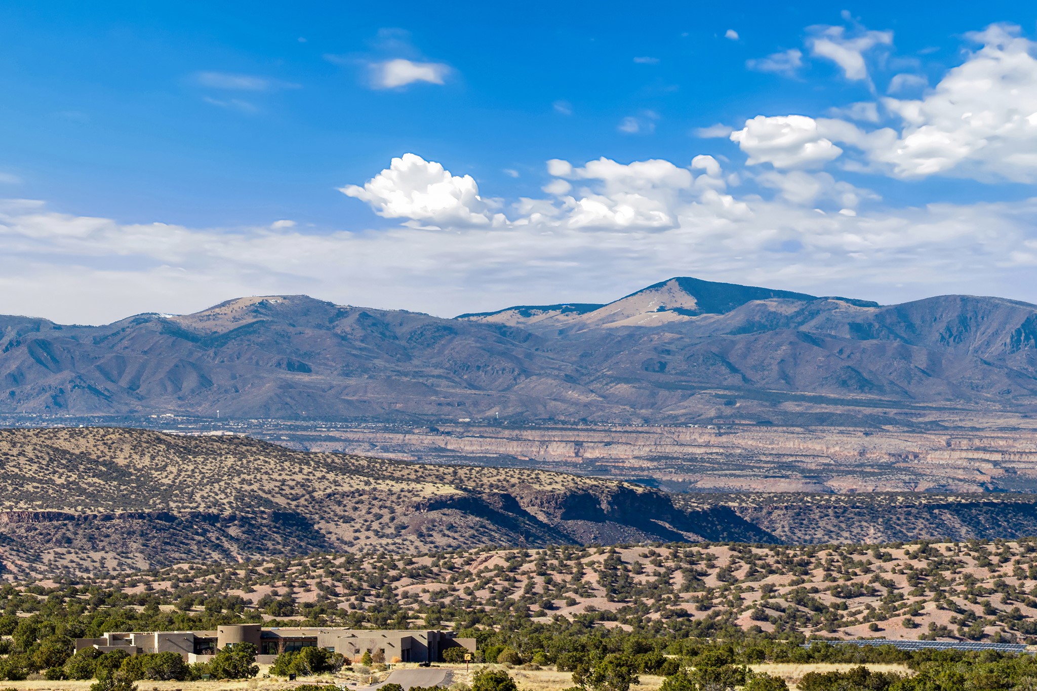 A masterful blend of modernity and warmth, this single-level custom home--built by Prull Custom Builders in 2021-- is sited on 1.8 acres and framed by the panoramic majesty of the Jemez Mountains. Every detail was thoughtfully designed to reflect the natural beauty of New Mexico while embracing clean, contemporary lines and sustainable living.The heart of the home is the expansive living, kitchen, and dining area--anchored by a split stone accent wall with a sleek gas fireplace and wrapped in floor-to-ceiling windows that open to a deep portal with a gas firepit and uninterrupted views. The chef's kitchen is a showpiece, featuring an 8-burner Viking range, Sub-Zero refrigerator, expansive stone countertops, and a large center island with bar seating and a prep sink--ideal for gathering and entertaining.Organic textures and subtle design elements are woven throughout: lime-washed walls, distressed beams, and a soft stone feature wall create a quiet luxury that feels both rooted and elevated. Powered by solar, this home pays homage to the land in both form and function.The private primary suite and adjacent office offer direct access to the portal and inspiring western views. In the guest wing, three bedrooms, two bathrooms, and a media room provide generous accommodation and flexible use. A separate flex room--currently an art studio--is located off the laundry room for added versatility.This is a rare opportunity to own a nearly new, artfully crafted home in the coveted community of Las Campanas--where architecture, sustainability, and the soul of the Southwest converge.