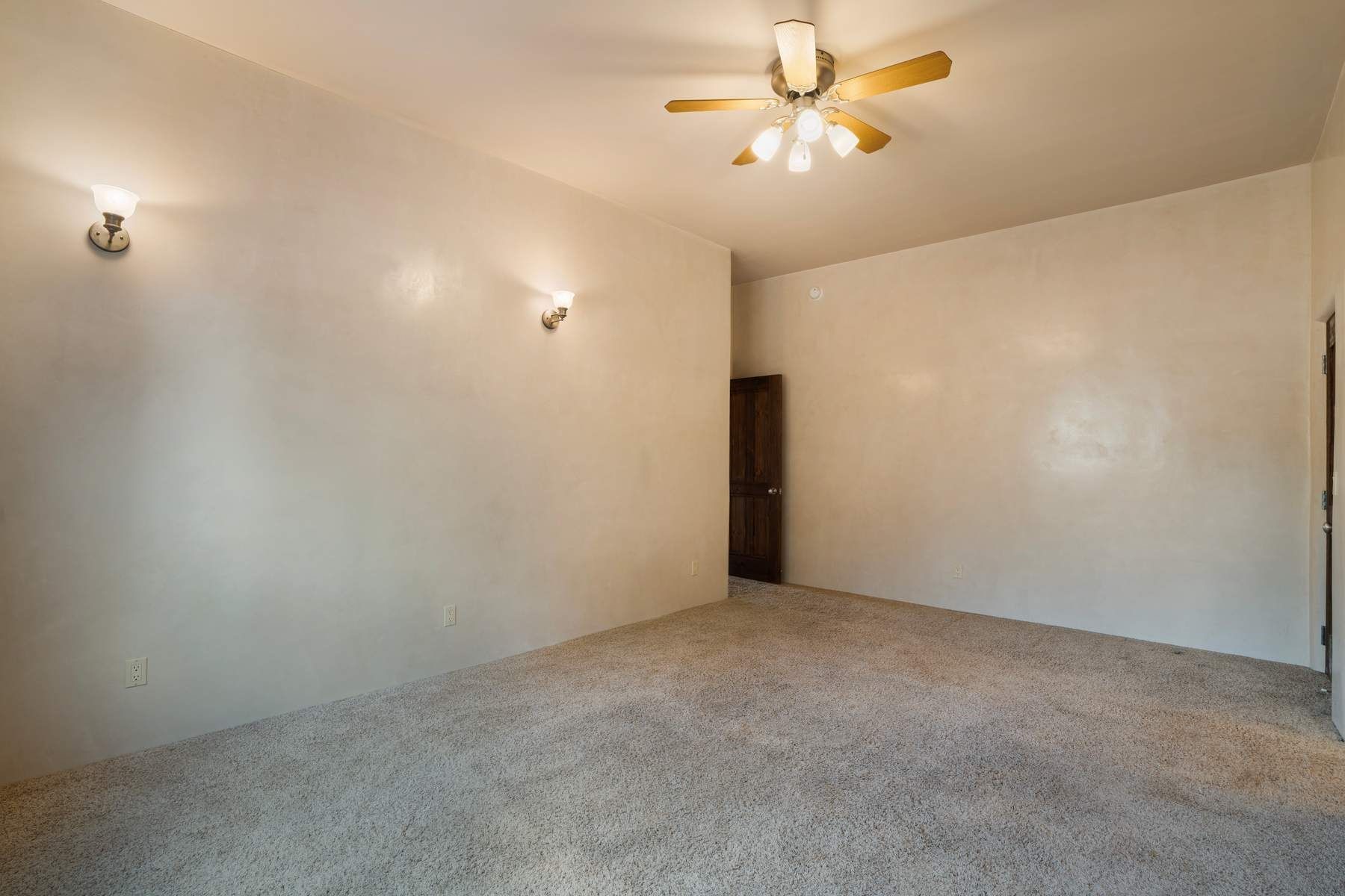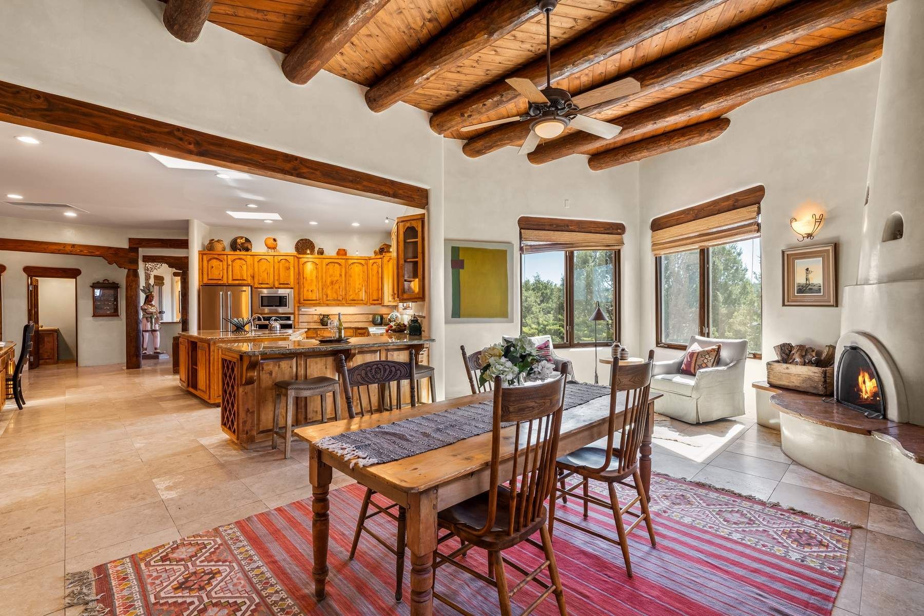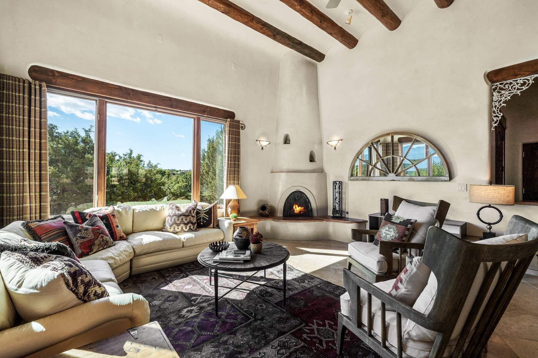 Single-level Pueblo Revival home on 2.86 acres with Sangre de Cristo mountain views, located just 13 minutes from the Santa Fe Plaza. Built in 2005, this 3,486 sq ft residence offers no interior steps, high ceilings, and classic Santa Fe architectural details designed for comfortable living and entertaining. Diamond plaster walls, coved viga ceilings, travertine tile floors, nichos, bancos, skylights, and corbels define the interior, along with four wood-burning kiva fireplaces, including one on the outdoor portal. The great room opens through French doors to a covered rear portal with kiva fireplace, sunshade, and landscaped privacy wall, creating a strong indoor-outdoor living connection. The kitchen features abundant wood cabinetry, granite countertops, a large island with second sink, built-in desk area, and flows into an additional gathering space with its own kiva fireplace. A separate laundry room with sink and cabinetry opens to a side yard with an established herb garden. Three en-suite bedrooms and five bathrooms provide flexibility and privacy. The primary suite includes a kiva fireplace, large walk-in closet, French doors to a portal, and a generous flex space suitable for office, gym, or studio use. ADA-compliant front entry and primary bathroom shower add accessibility. Comfort systems include in-floor radiant heating and evaporative cooling. Recent improvements include full re-stucco of the home and rear privacy wall (2023) and partial TPO roof replacement (2023). Additional features include a heated 3-car garage with RV bay, workshop or studio space, central vacuum, ample parking, rock fountain, native plant landscaping, and flagstone walkways. Located near La Tierra trail access and with no HOA, this property offers a combination of single-level living, acreage, architectural detail, and proximity to Santa Fe.