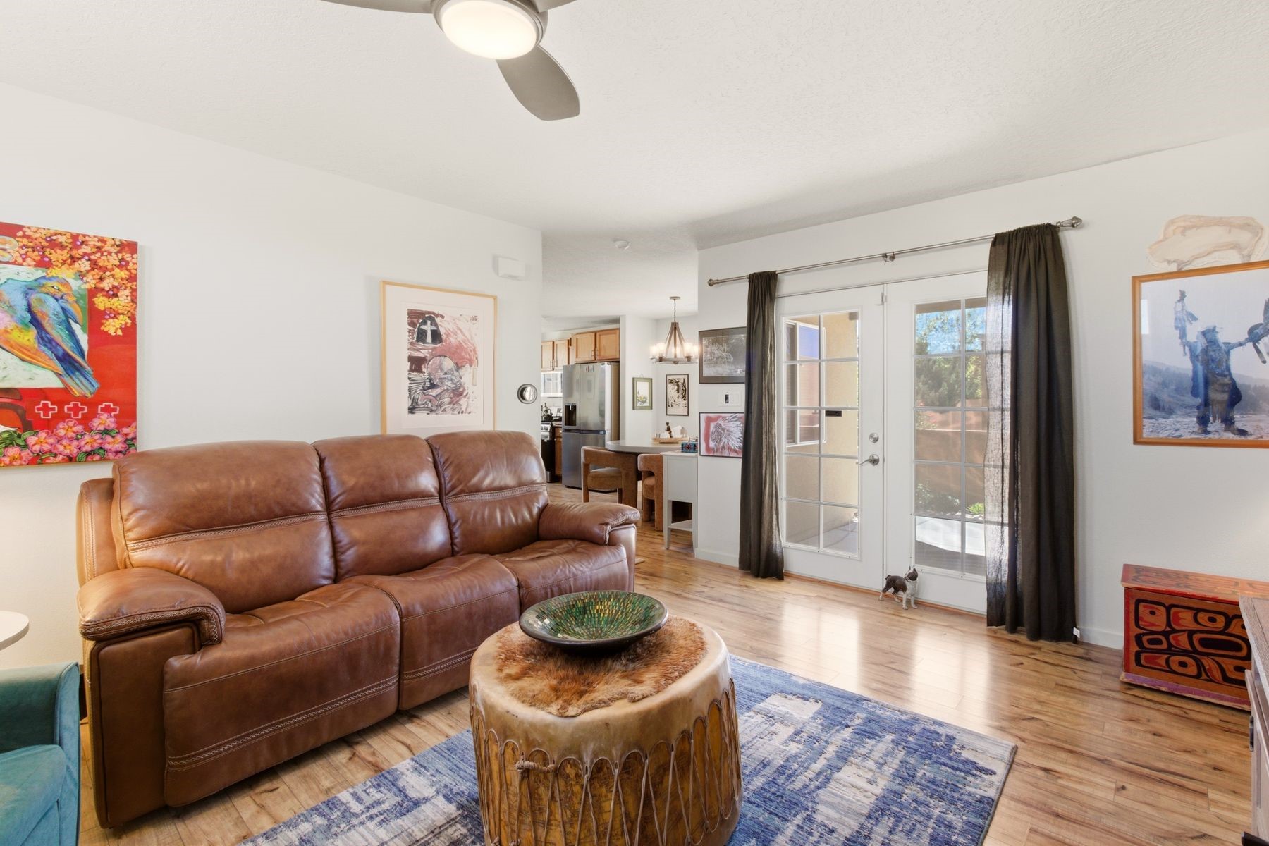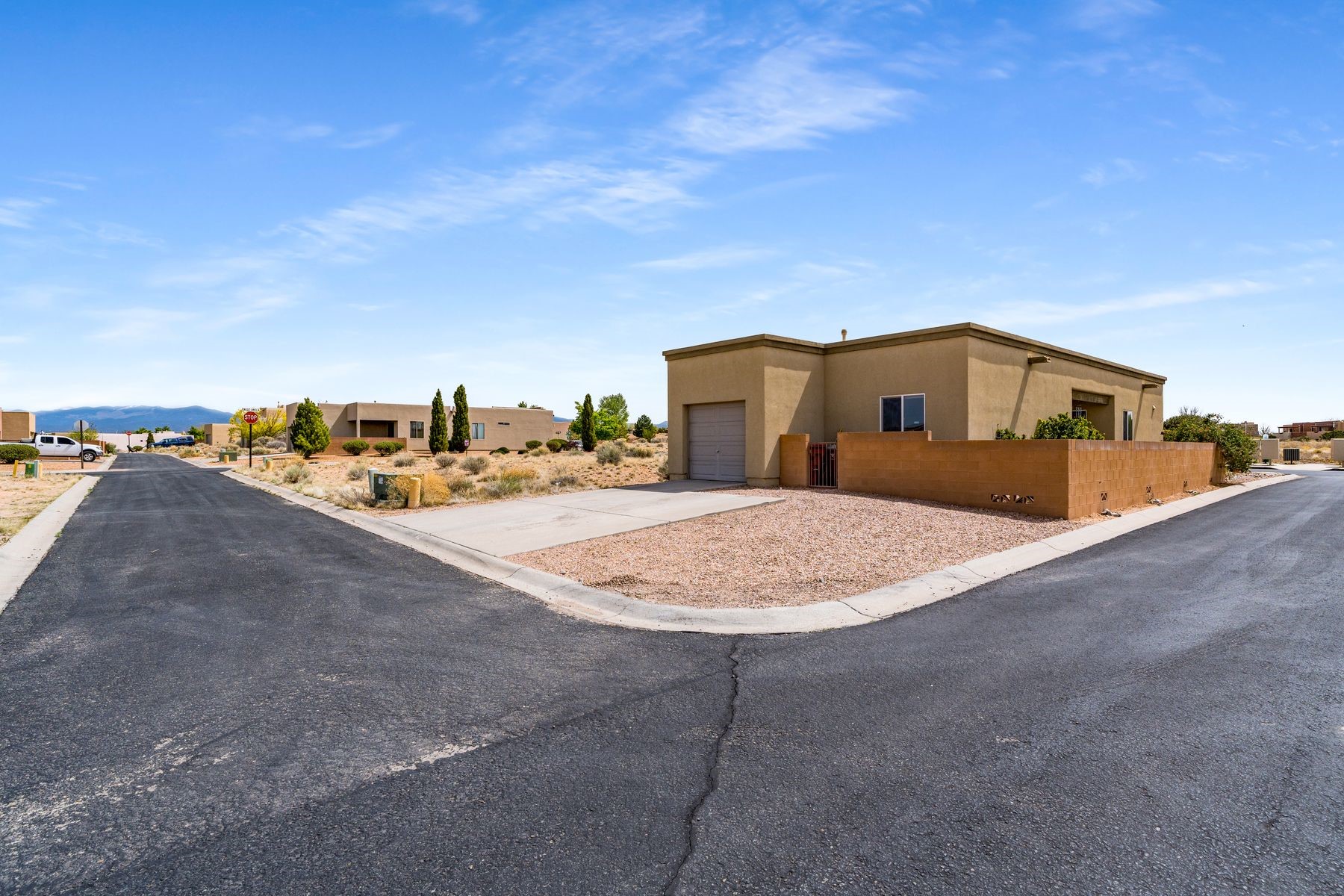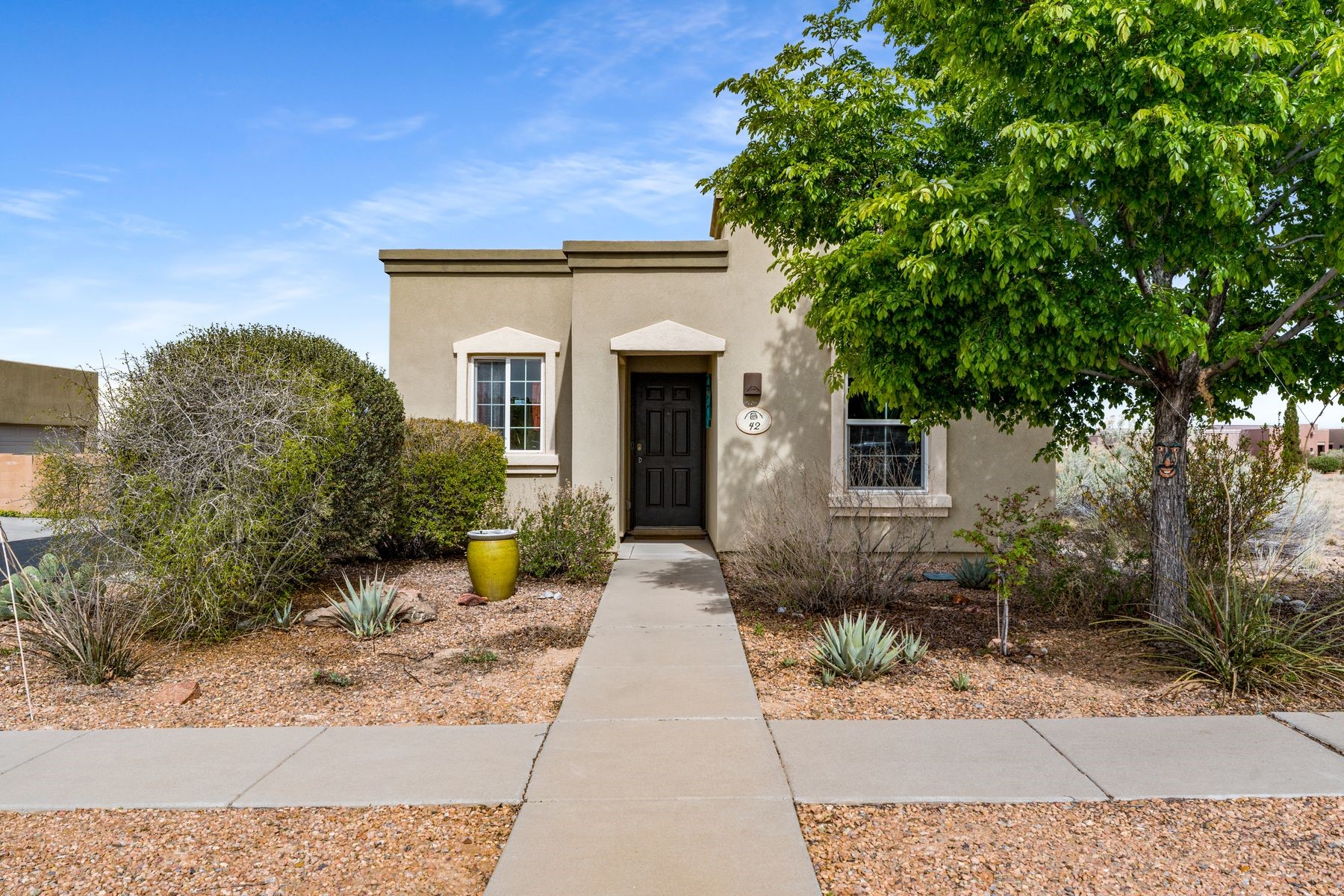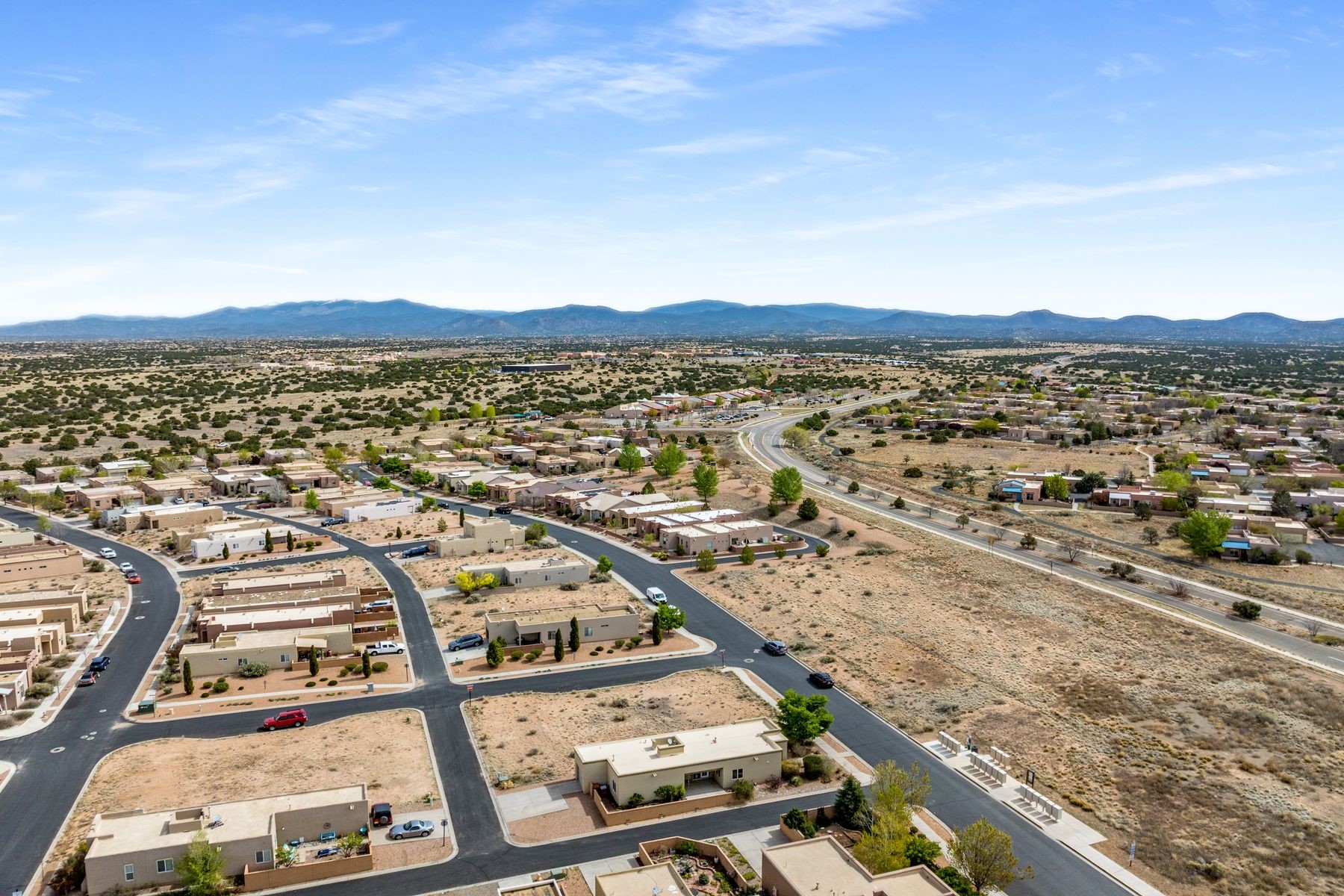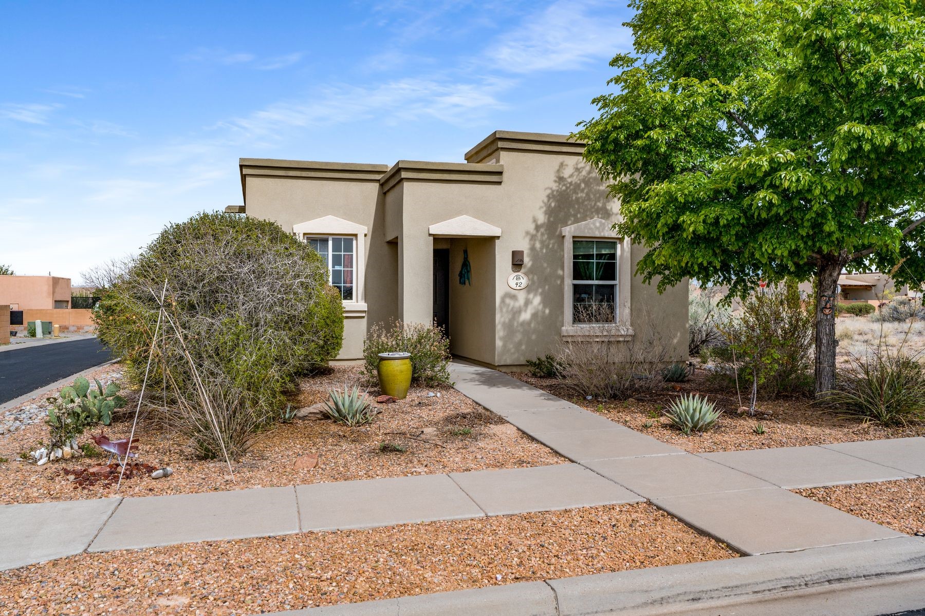 Cozy, single-level Rancho Viejo home built in 2009, offering 3 bedrooms, 2 bathrooms, and 1,227 square feet with good separation between the primary suite and guest bedrooms. Located on a .09-acre lot with quick access to I-25 and just 10 minutes to southside Santa Fe shopping and restaurants, this home combines efficient design with everyday convenience. The interior features engineered wood and laminate flooring, with carpet only in the guest bedrooms. The living area is filled with natural light and connects easily to the kitchen and dining spaces for comfortable daily living. The kitchen includes granite countertops, abundant cabinetry, and a full suite of appliances, all replaced in 2024. The layout supports both functionality and ease of use, all centered around the main living area. The primary bedroom suite is positioned separately from the guest bedrooms, offering privacy and flexibility. Two additional bedrooms and a second bathroom accommodate guests, workspace, or additional living needs. Outdoor living is enhanced by French doors leading to a walled-in portal with a manageable garden, providing a sheltered and usable space for dining, relaxing, or enjoying Santa Fe's climate. The manageable .09-acre lot offers low-maintenance outdoor space with room for personalization. Comfort systems include forced air heating and refrigerated cooling. A new TPO roof installed in 2025 includes a transferable warranty. Additional features include a one-car garage and efficient single-level layout. Located within the beautiful Rancho Viejo community, known for its peace and quiet and extensive network of walking trails and open space, this property offers a balance of accessibility, low-maintenance living, and proximity to schools, colleges, and amenities.