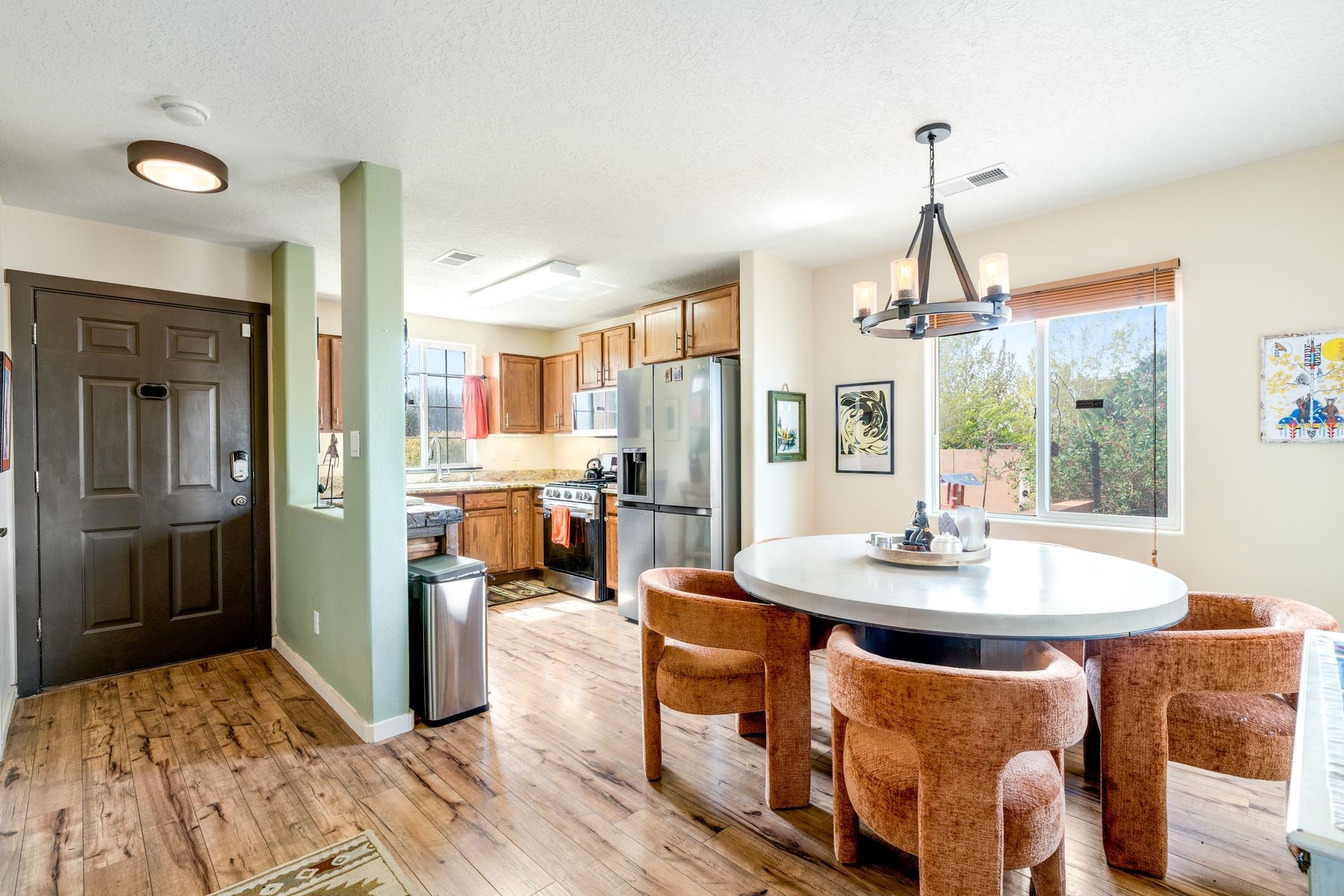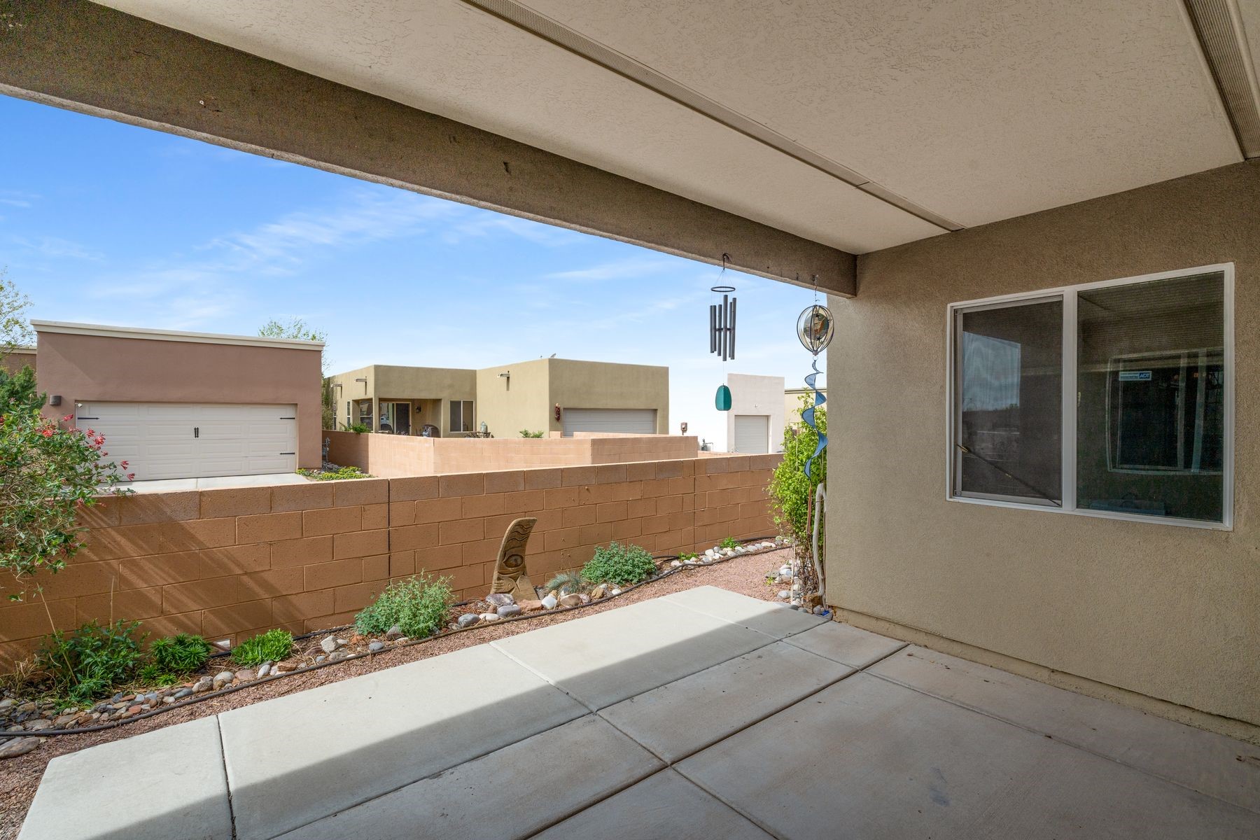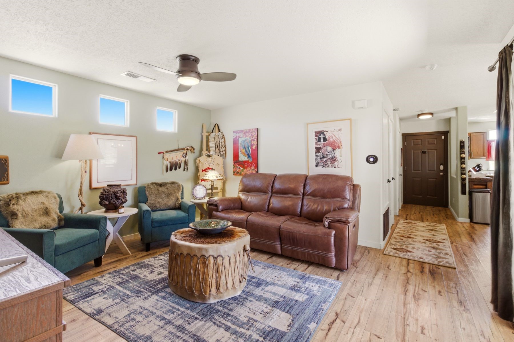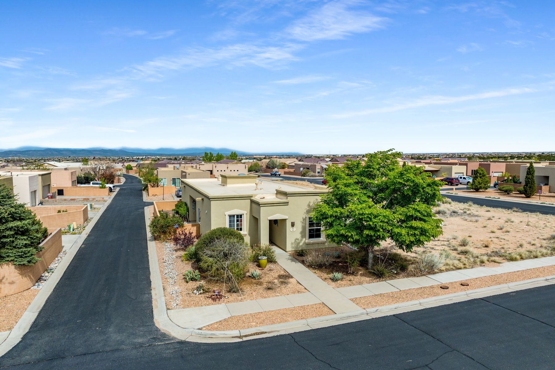 Cozy, single-level Rancho Viejo home built in 2009, offering 3 bedrooms, 2 bathrooms, and 1,227 square feet with good separation between the primary suite and guest bedrooms. Located on a .09-acre lot with quick access to I-25 and just 10 minutes to southside Santa Fe shopping and restaurants, this home combines efficient design with everyday convenience. The interior features engineered wood and laminate flooring, with carpet only in the guest bedrooms. The living area is filled with natural light and connects easily to the kitchen and dining spaces for comfortable daily living. The kitchen includes granite countertops, abundant cabinetry, and a full suite of appliances, all replaced in 2024. The layout supports both functionality and ease of use, all centered around the main living area. The primary bedroom suite is positioned separately from the guest bedrooms, offering privacy and flexibility. Two additional bedrooms and a second bathroom accommodate guests, workspace, or additional living needs. Outdoor living is enhanced by French doors leading to a walled-in portal with a manageable garden, providing a sheltered and usable space for dining, relaxing, or enjoying Santa Fe's climate. The manageable .09-acre lot offers low-maintenance outdoor space with room for personalization. Comfort systems include forced air heating and refrigerated cooling. A new TPO roof installed in 2025 includes a transferable warranty. Additional features include a one-car garage and efficient single-level layout. Located within the beautiful Rancho Viejo community, known for its peace and quiet and extensive network of walking trails and open space, this property offers a balance of accessibility, low-maintenance living, and proximity to schools, colleges, and amenities.