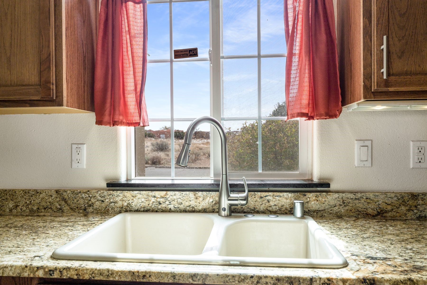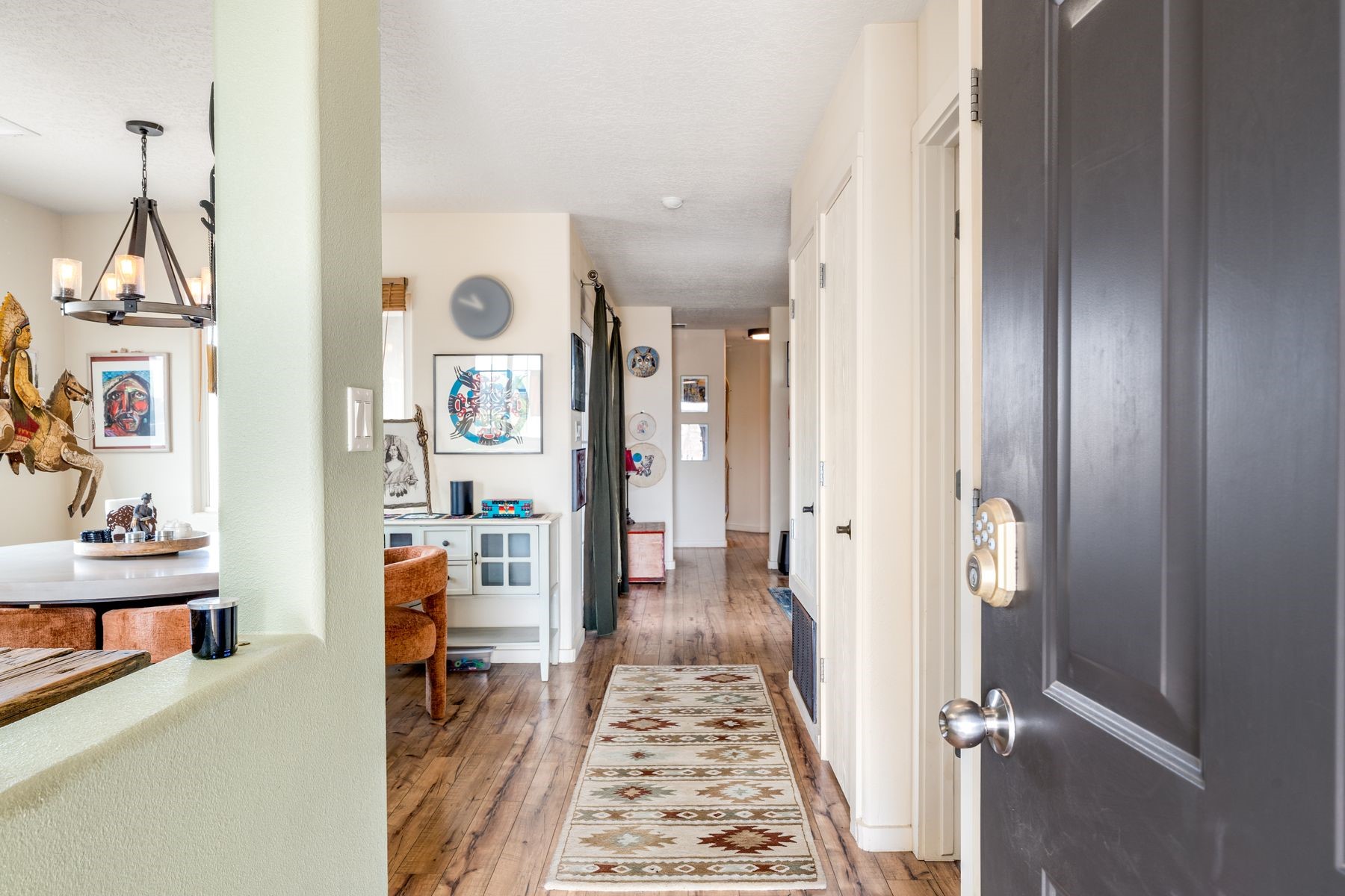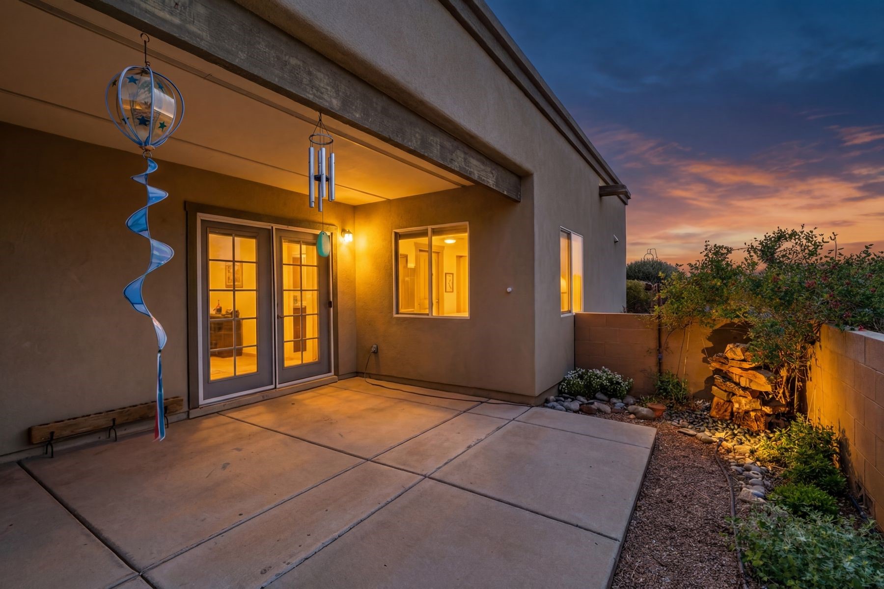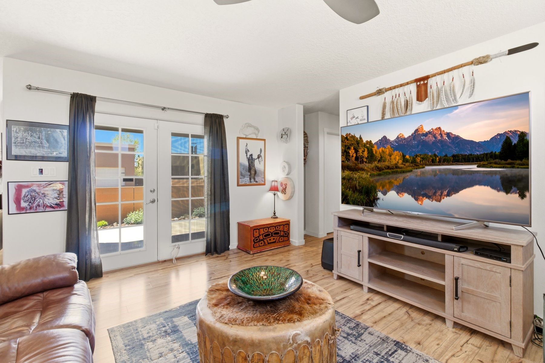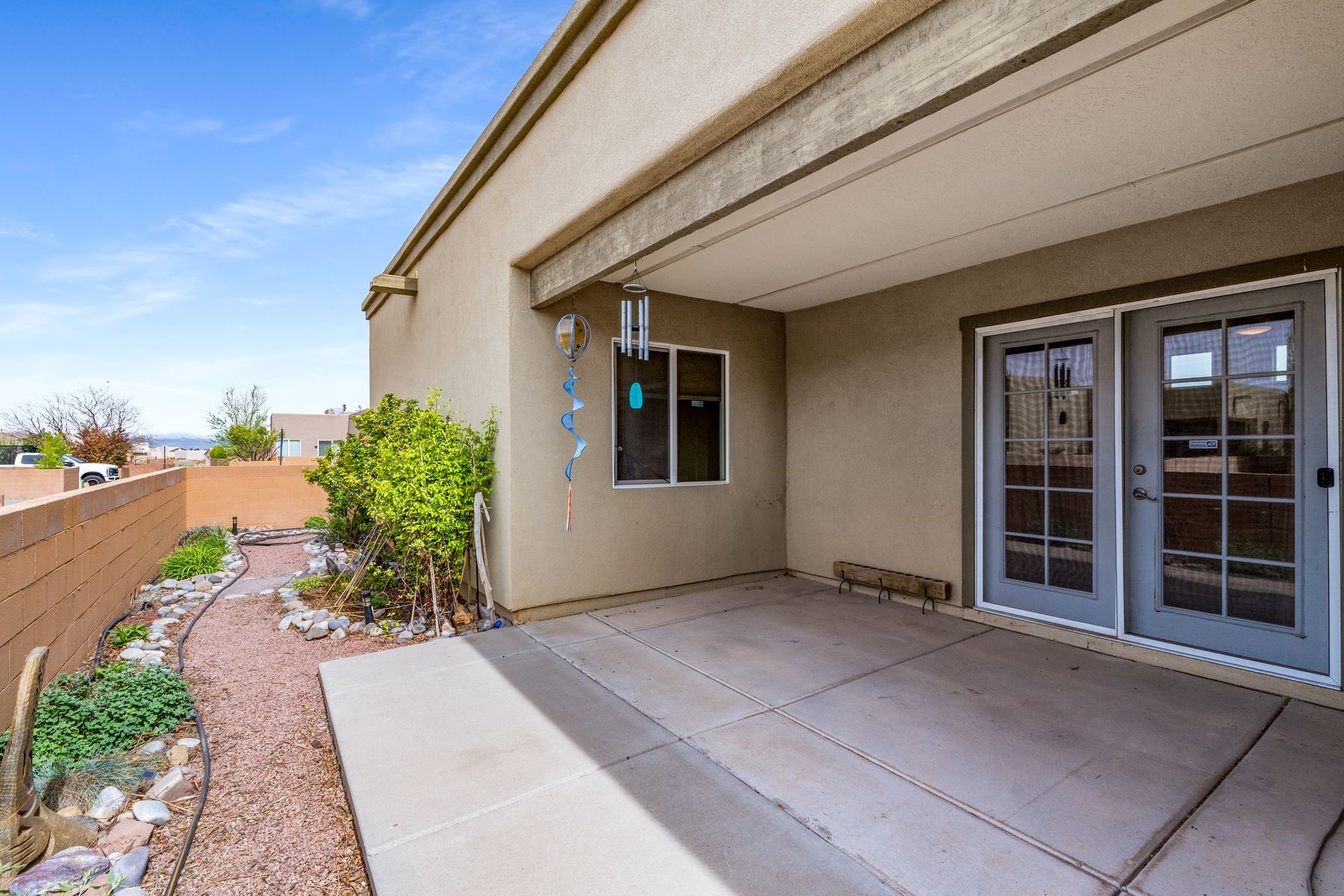Cozy, single-level Rancho Viejo home built in 2009, offering 3 bedrooms, 2 bathrooms, and 1,227 square feet with good separation between the primary suite and guest bedrooms. Located on a .09-acre lot with quick access to I-25 and just 10 minutes to southside Santa Fe shopping and restaurants, this home combines efficient design with everyday convenience. The interior features engineered wood and laminate flooring, with carpet only in the guest bedrooms. The living area is filled with natural light and connects easily to the kitchen and dining spaces for comfortable daily living. The kitchen includes granite countertops, abundant cabinetry, and a full suite of appliances, all replaced in 2024. The layout supports both functionality and ease of use, all centered around the main living area. The primary bedroom suite is positioned separately from the guest bedrooms, offering privacy and flexibility. Two additional bedrooms and a second bathroom accommodate guests, workspace, or additional living needs. Outdoor living is enhanced by French doors leading to a walled-in portal with a manageable garden, providing a sheltered and usable space for dining, relaxing, or enjoying Santa Fe's climate. The manageable .09-acre lot offers low-maintenance outdoor space with room for personalization. Comfort systems include forced air heating and refrigerated cooling. A new TPO roof installed in 2025 includes a transferable warranty. Additional features include a one-car garage and efficient single-level layout. Located within the beautiful Rancho Viejo community, known for its peace and quiet and extensive network of walking trails and open space, this property offers a balance of accessibility, low-maintenance living, and proximity to schools, colleges, and amenities.