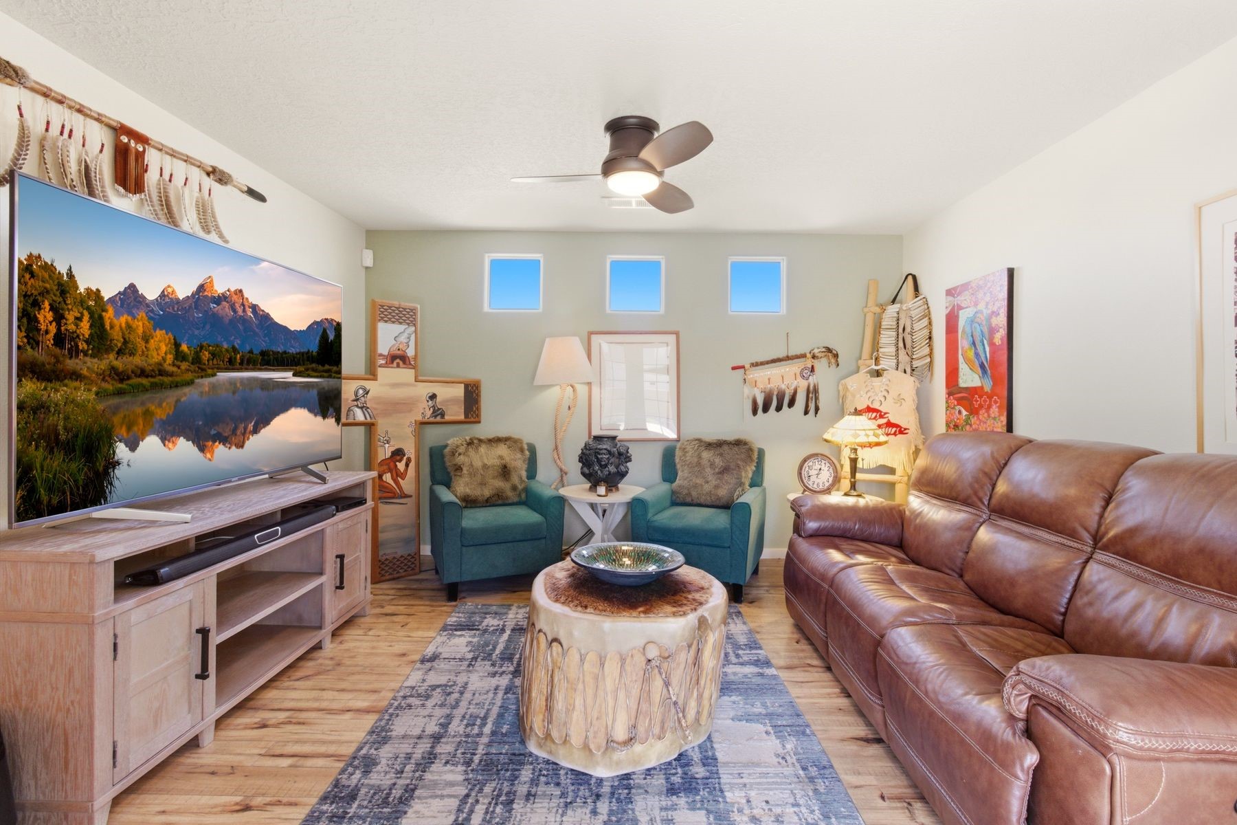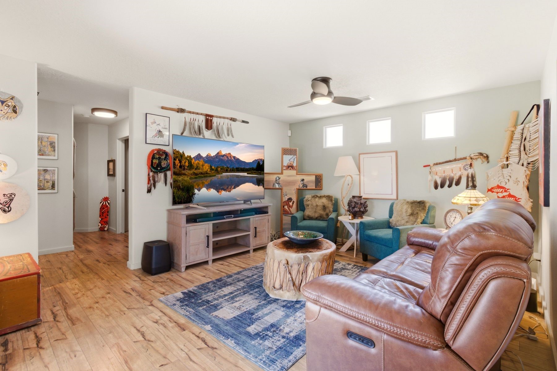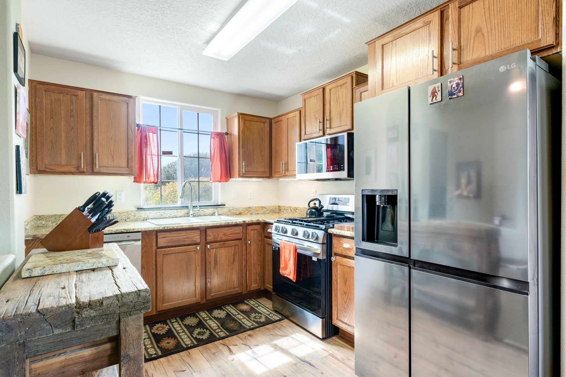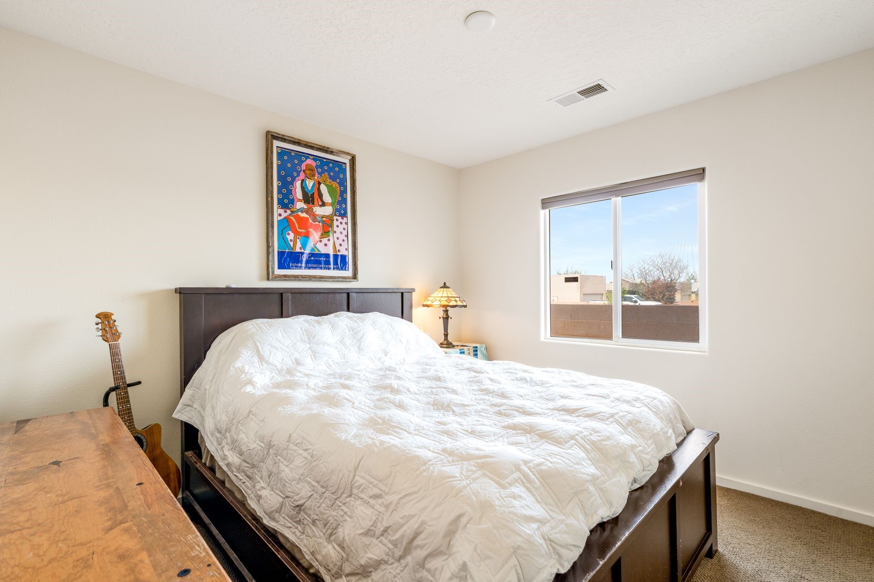 Cozy, single-level Rancho Viejo home built in 2009, offering 3 bedrooms, 2 bathrooms, and 1,227 square feet with good separation between the primary suite and guest bedrooms. Located on a .09-acre lot with quick access to I-25 and just 10 minutes to southside Santa Fe shopping and restaurants, this home combines efficient design with everyday convenience. The interior features engineered wood and laminate flooring, with carpet only in the guest bedrooms. The living area is filled with natural light and connects easily to the kitchen and dining spaces for comfortable daily living. The kitchen includes granite countertops, abundant cabinetry, and a full suite of appliances, all replaced in 2024. The layout supports both functionality and ease of use, all centered around the main living area. The primary bedroom suite is positioned separately from the guest bedrooms, offering privacy and flexibility. Two additional bedrooms and a second bathroom accommodate guests, workspace, or additional living needs. Outdoor living is enhanced by French doors leading to a walled-in portal with a manageable garden, providing a sheltered and usable space for dining, relaxing, or enjoying Santa Fe's climate. The manageable .09-acre lot offers low-maintenance outdoor space with room for personalization. Comfort systems include forced air heating and refrigerated cooling. A new TPO roof installed in 2025 includes a transferable warranty. Additional features include a one-car garage and efficient single-level layout. Located within the beautiful Rancho Viejo community, known for its peace and quiet and extensive network of walking trails and open space, this property offers a balance of accessibility, low-maintenance living, and proximity to schools, colleges, and amenities.