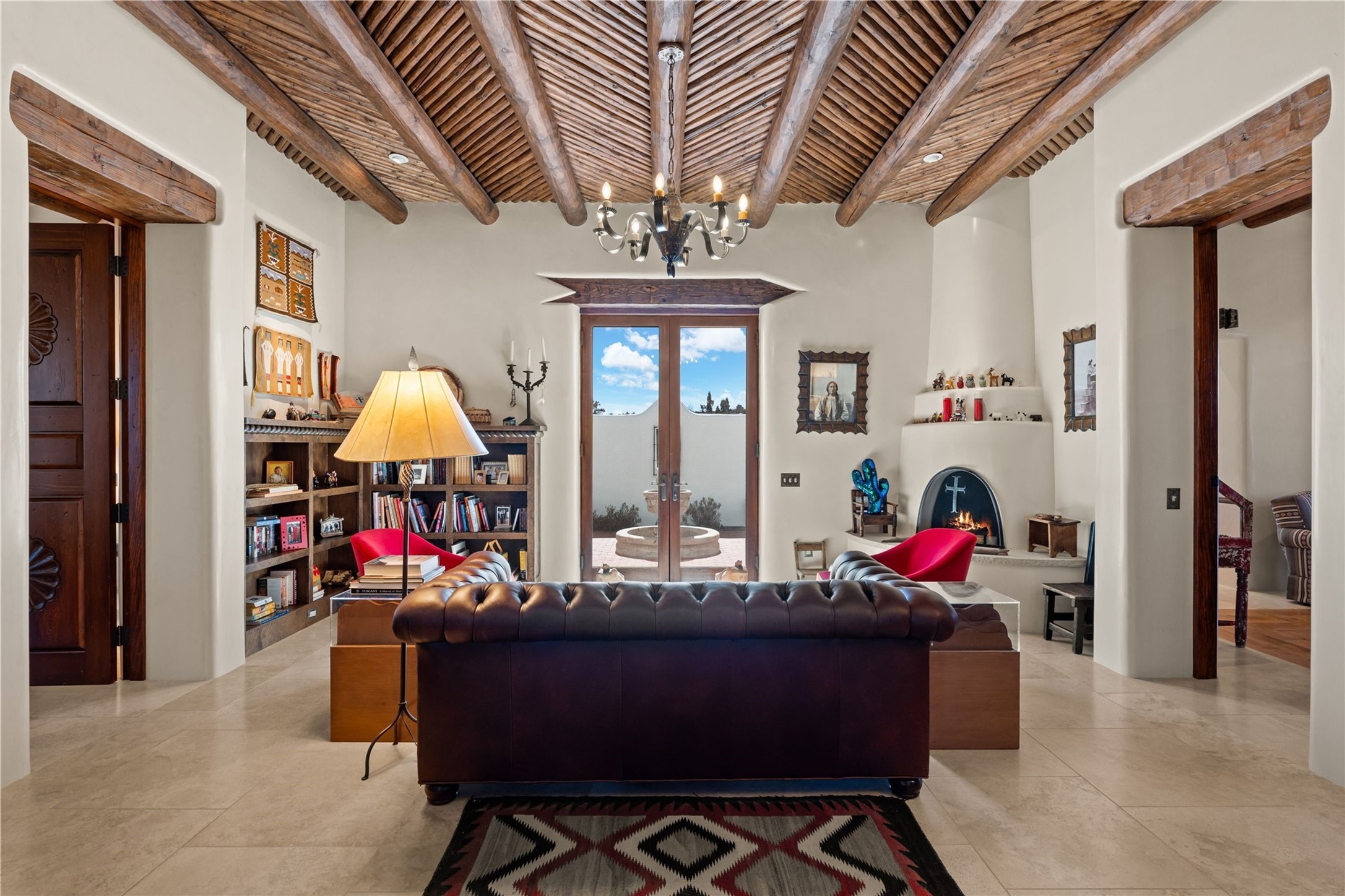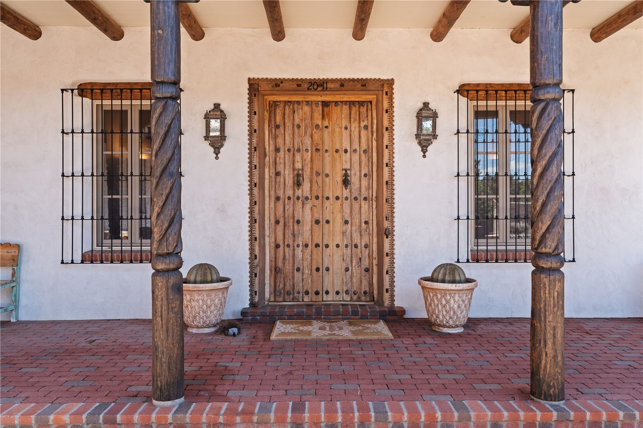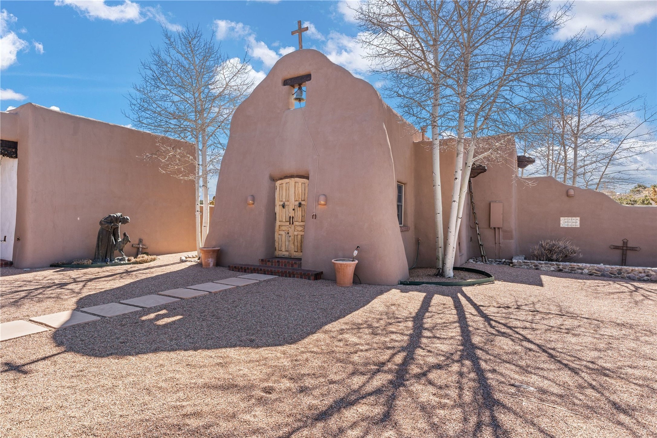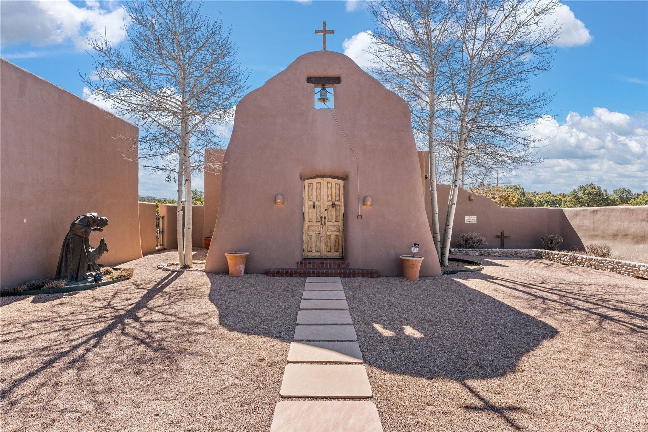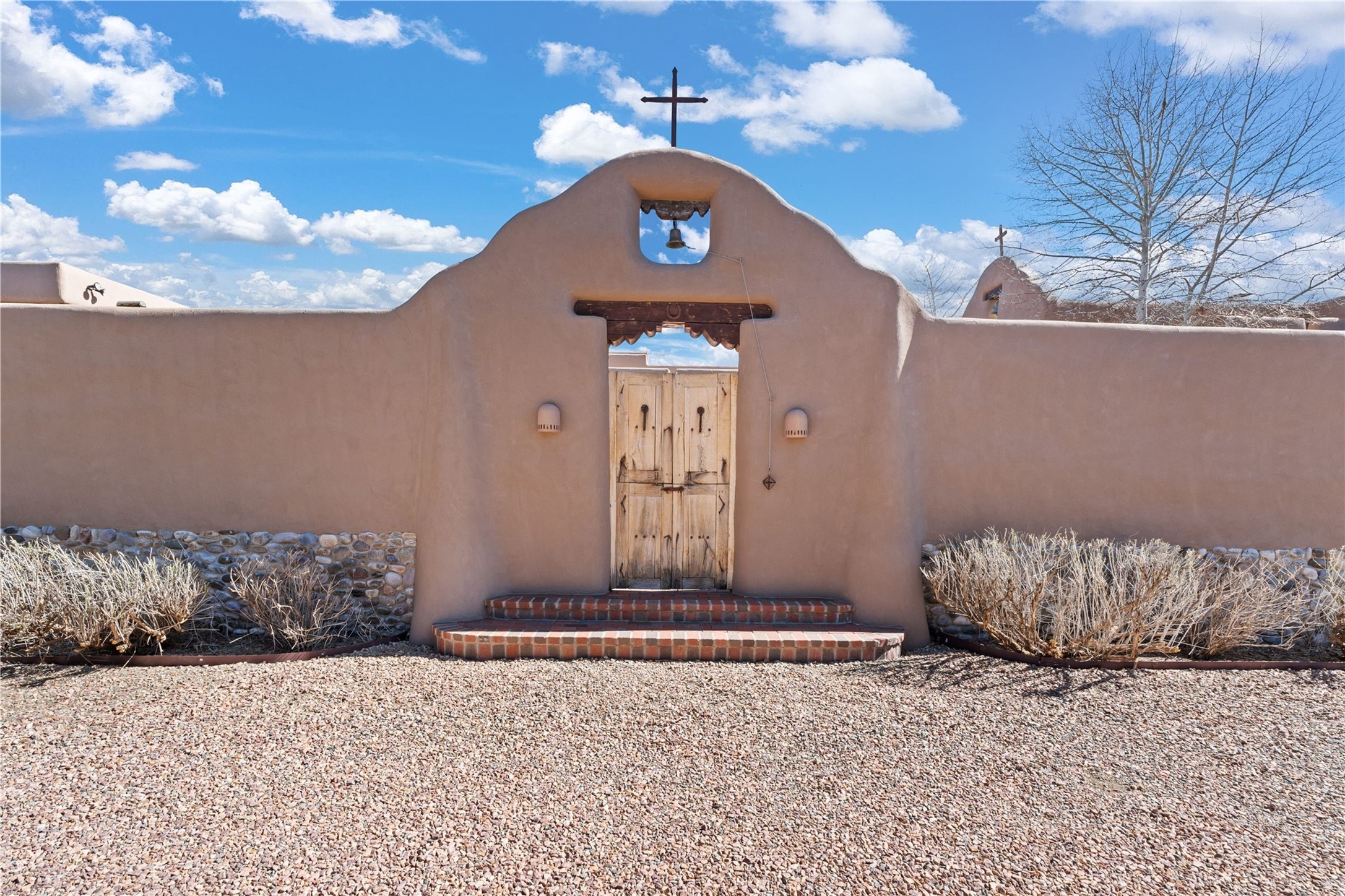 Reminiscent of a colonial hacienda, this impressive estate offers privacy, views, an adobe walled-in main residence and casita, plus a studio/guest house. Beautifully sited on nearly 10 acres (comprised of 2 separately deeded lots), and featuring the highest quality construction (double adobe in the main house). The Main house consists of 2 bedroom suites plus 2 half baths; the Casita consists of 2 bedrooms and 2 baths, and the Studio/Hogan has 1 bedroom,1 bath. There is an expansive portal and a roof top deck, 7 Fireplaces, private well and 12' and 15' Ceilings in public areas. This property is one of Santa Fe's finest.