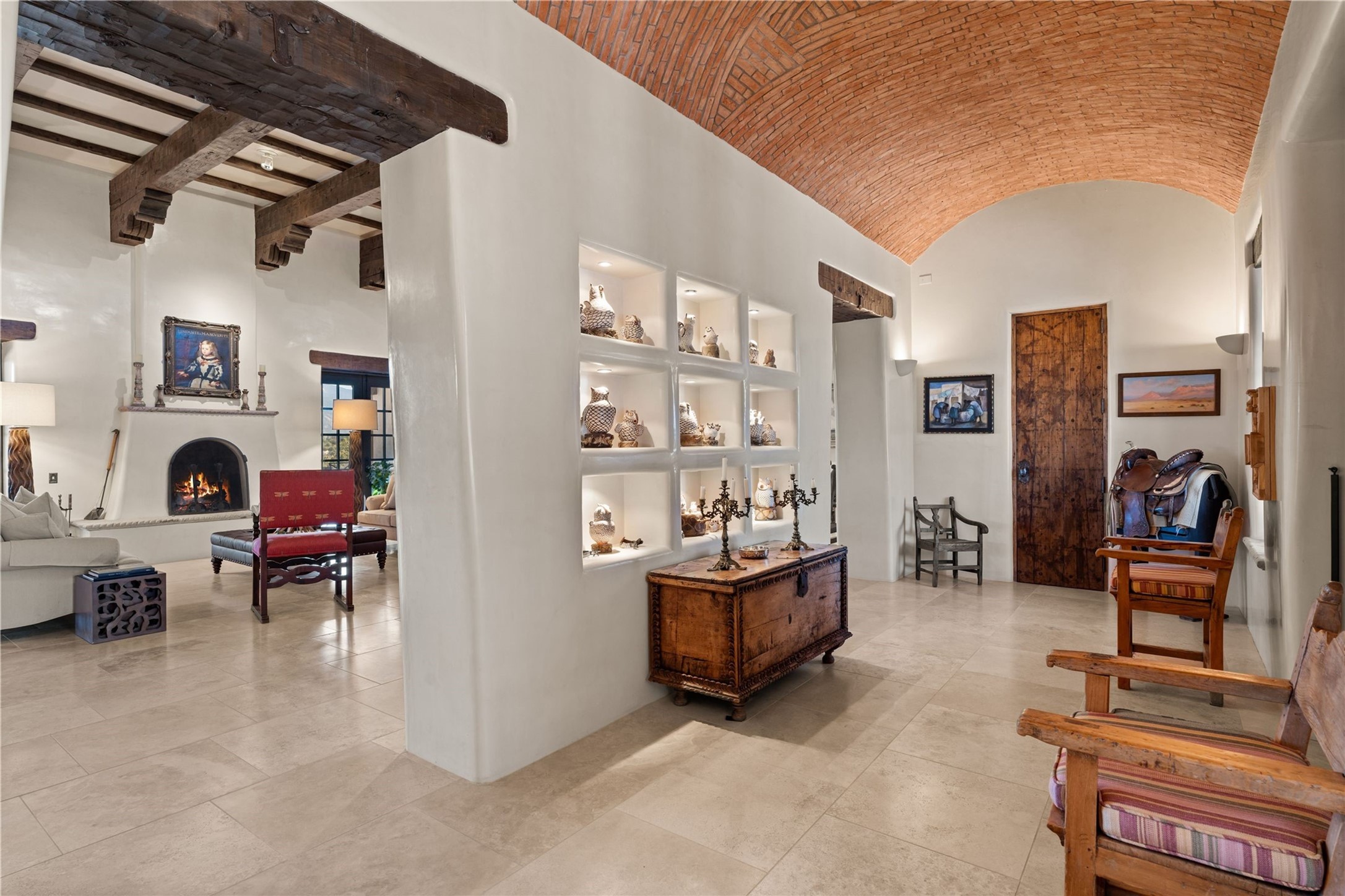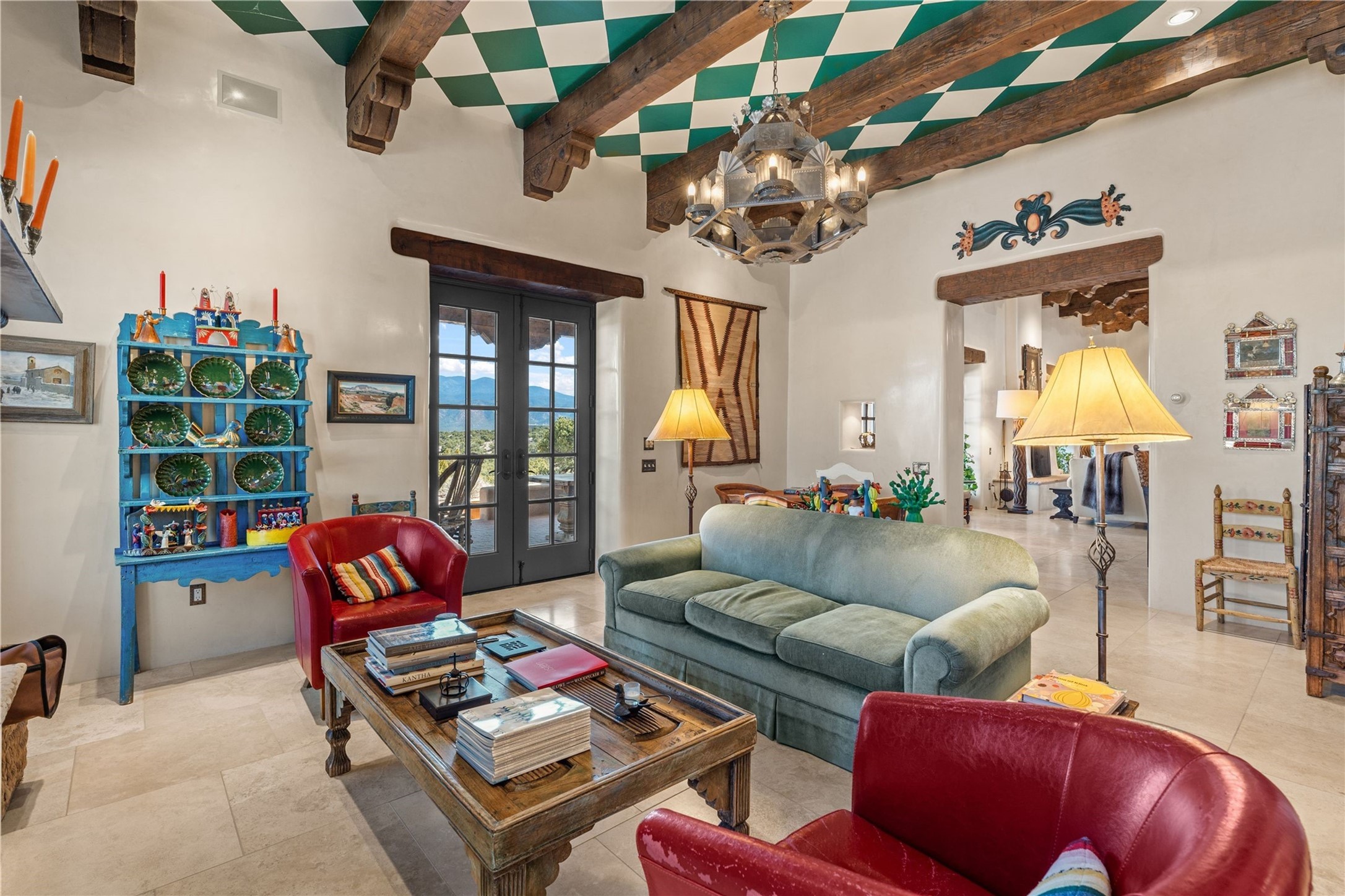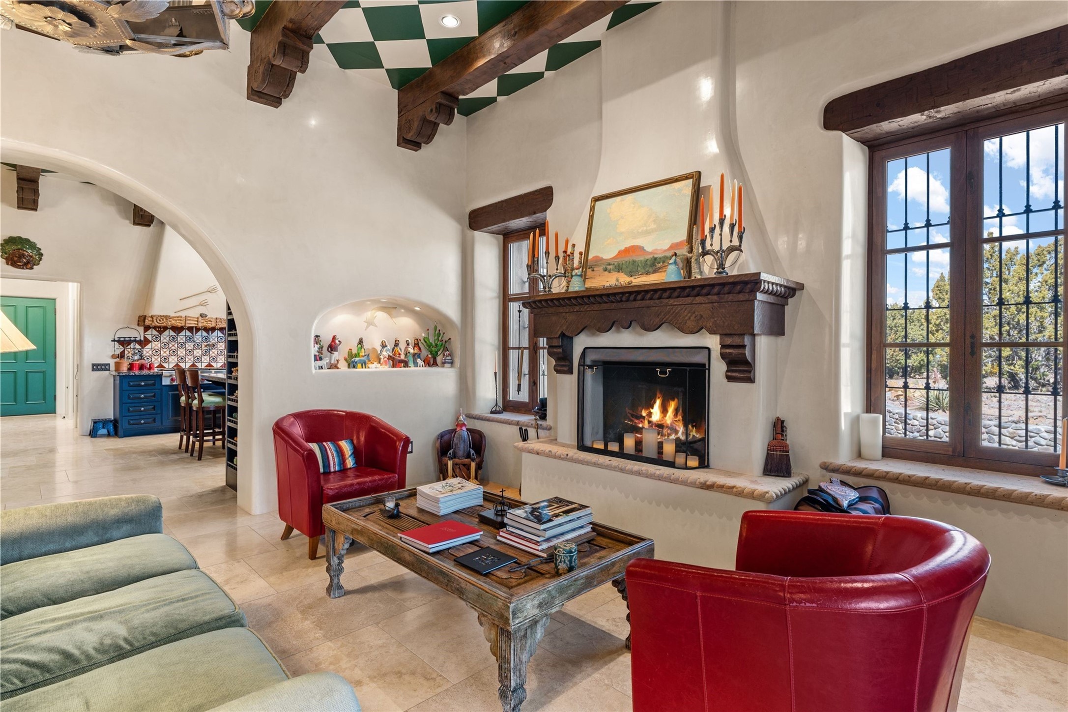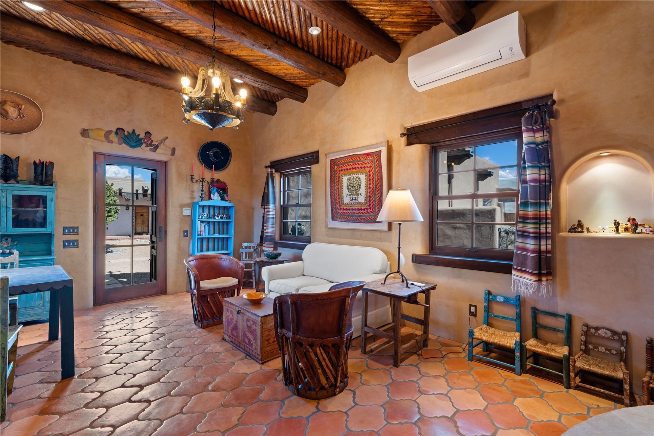 Reminiscent of a colonial hacienda, this impressive estate offers privacy, views, an adobe walled-in main residence and casita, plus a studio/guest house. Beautifully sited on nearly 10 acres (comprised of 2 separately deeded lots), and featuring the highest quality construction (double adobe in the main house). The Main house consists of 2 bedroom suites plus 2 half baths; the Casita consists of 2 bedrooms and 2 baths, and the Studio/Hogan has 1 bedroom,1 bath. There is an expansive portal and a roof top deck, 7 Fireplaces, private well and 12' and 15' Ceilings in public areas. This property is one of Santa Fe's finest.
