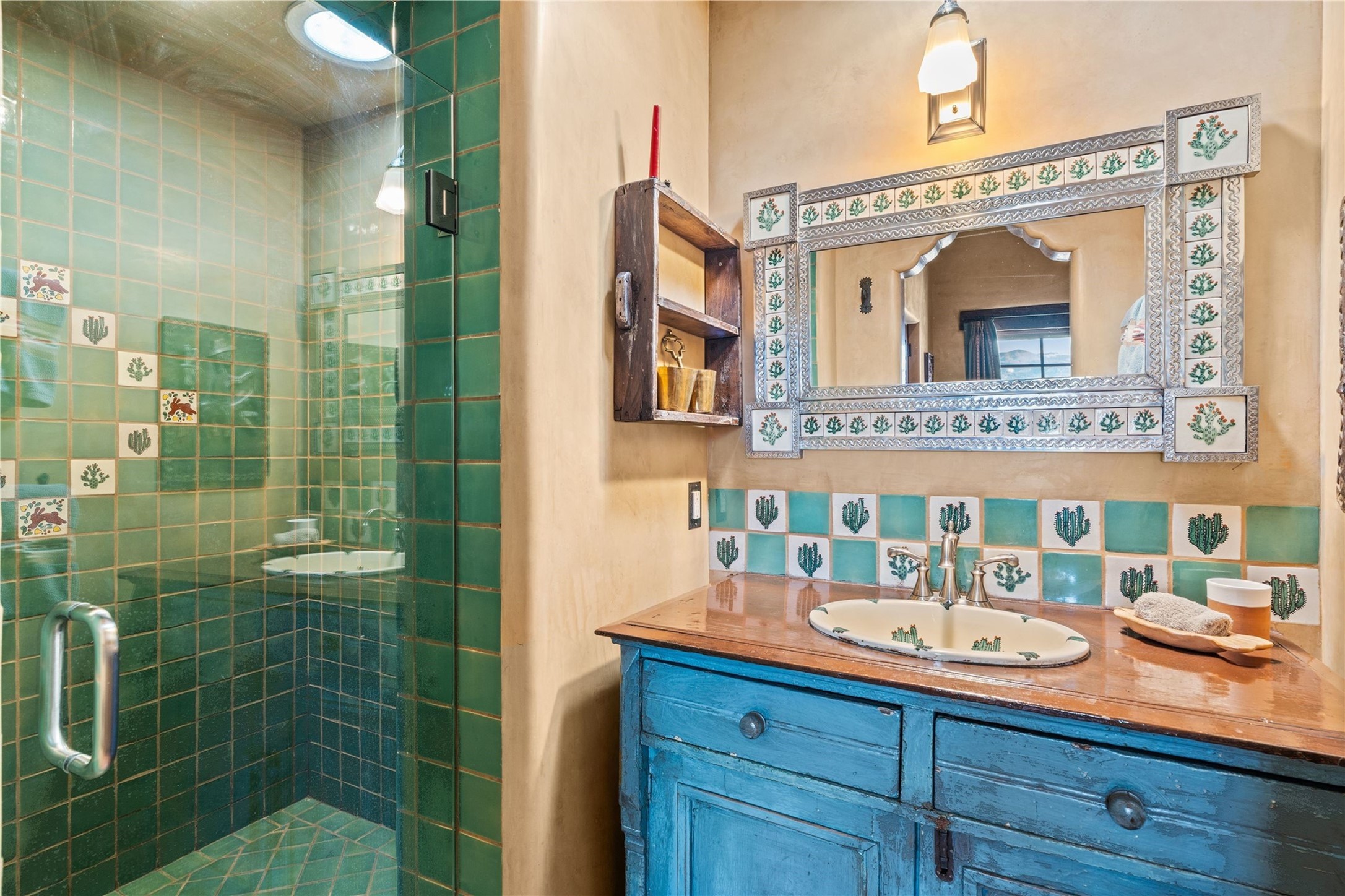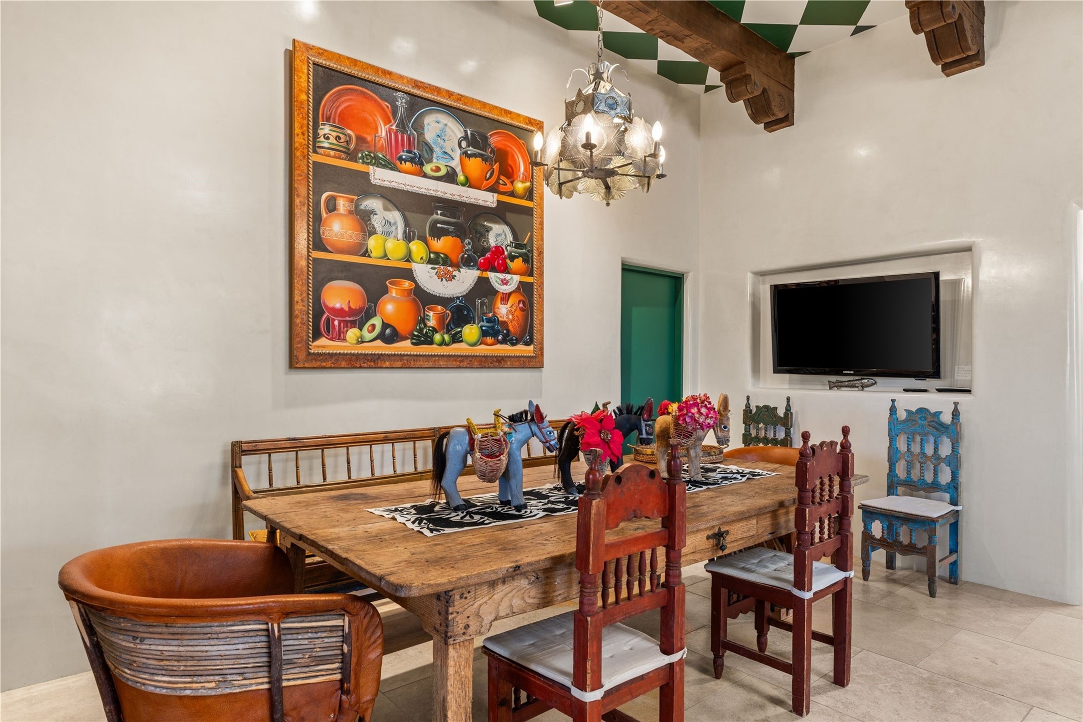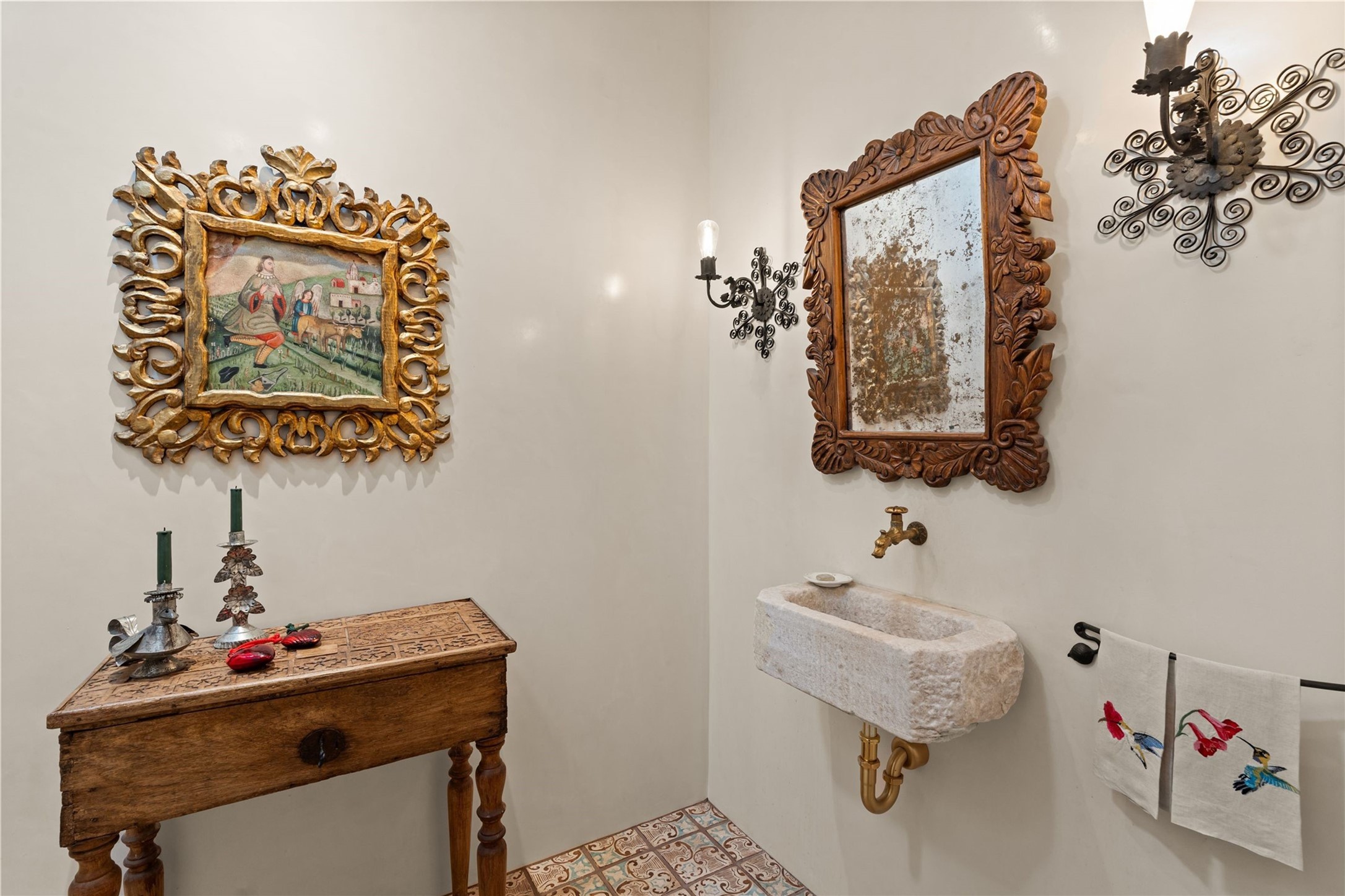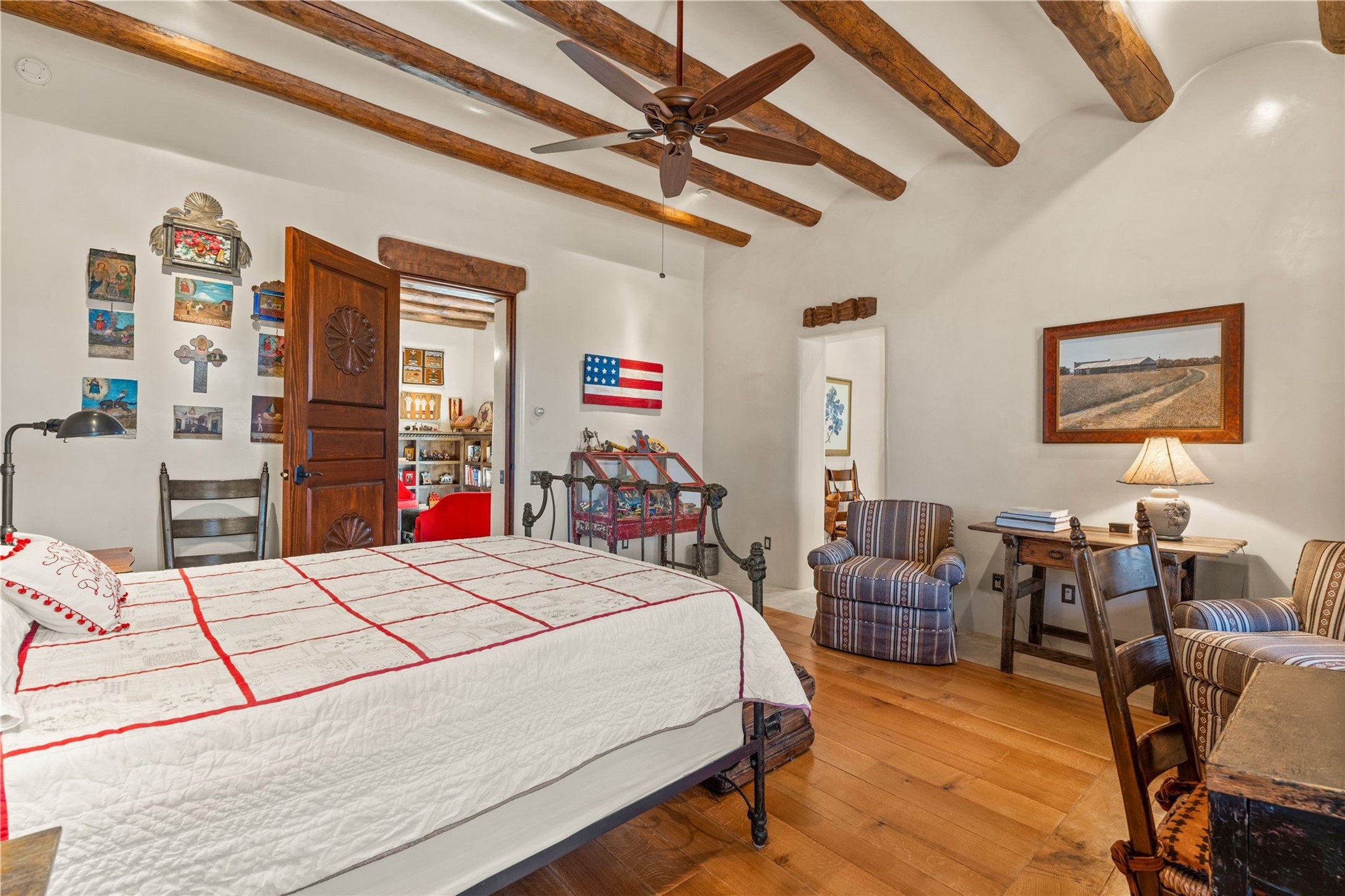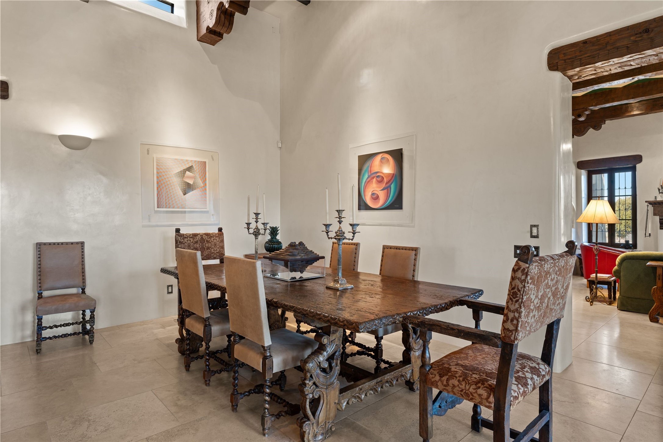 Reminiscent of a colonial hacienda, this impressive estate offers privacy, views, an adobe walled-in main residence and casita, plus a studio/guest house. Beautifully sited on nearly 10 acres (comprised of 2 separately deeded lots), and featuring the highest quality construction (double adobe in the main house). The Main house consists of 2 bedroom suites plus 2 half baths; the Casita consists of 2 bedrooms and 2 baths, and the Studio/Hogan has 1 bedroom,1 bath. There is an expansive portal and a roof top deck, 7 Fireplaces, private well and 12' and 15' Ceilings in public areas. This property is one of Santa Fe's finest.