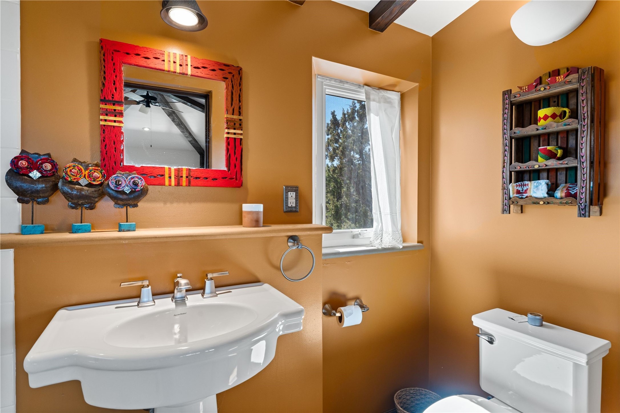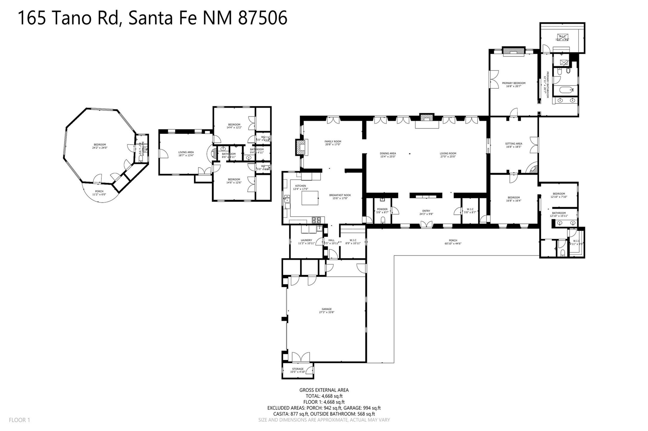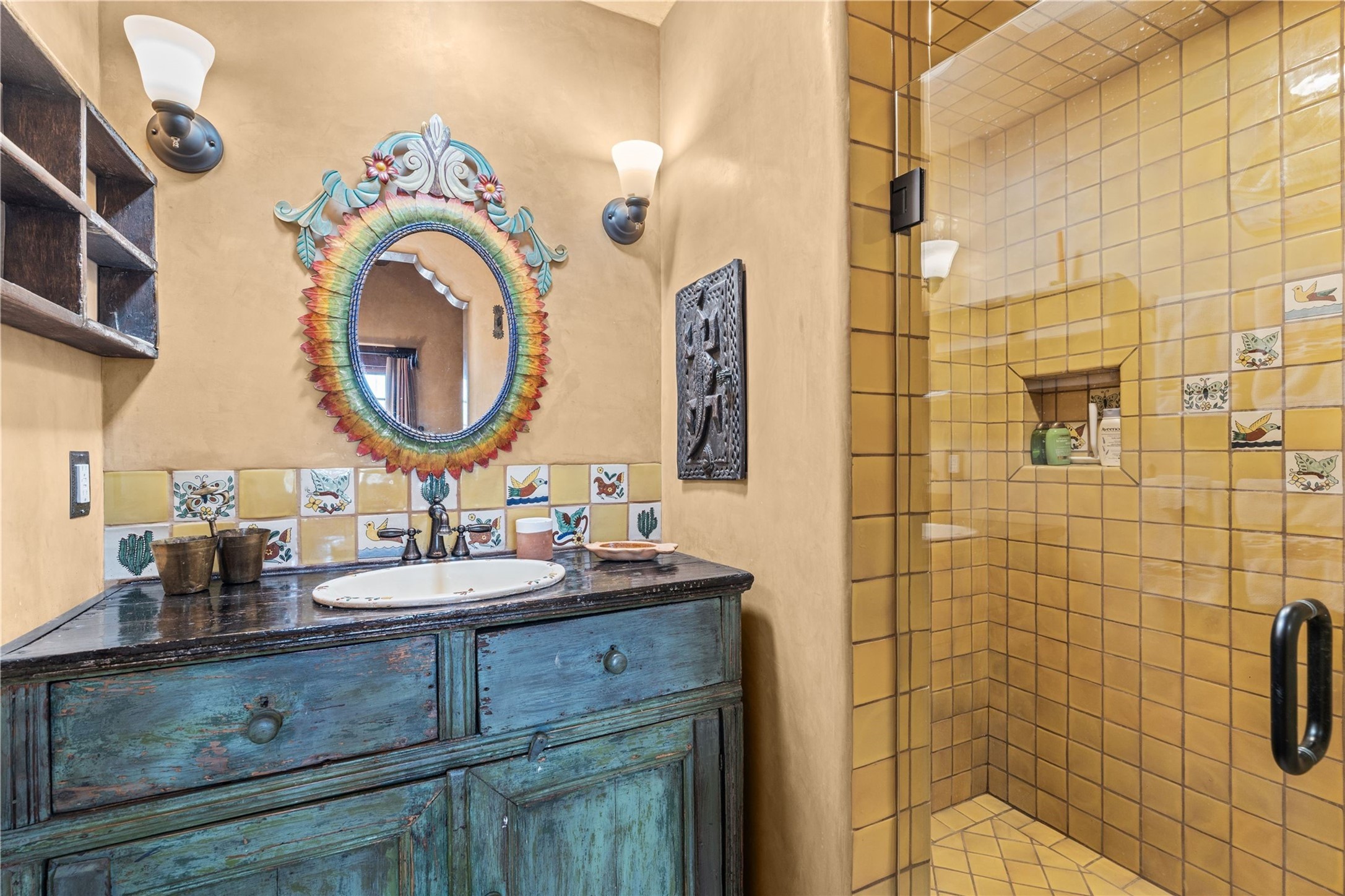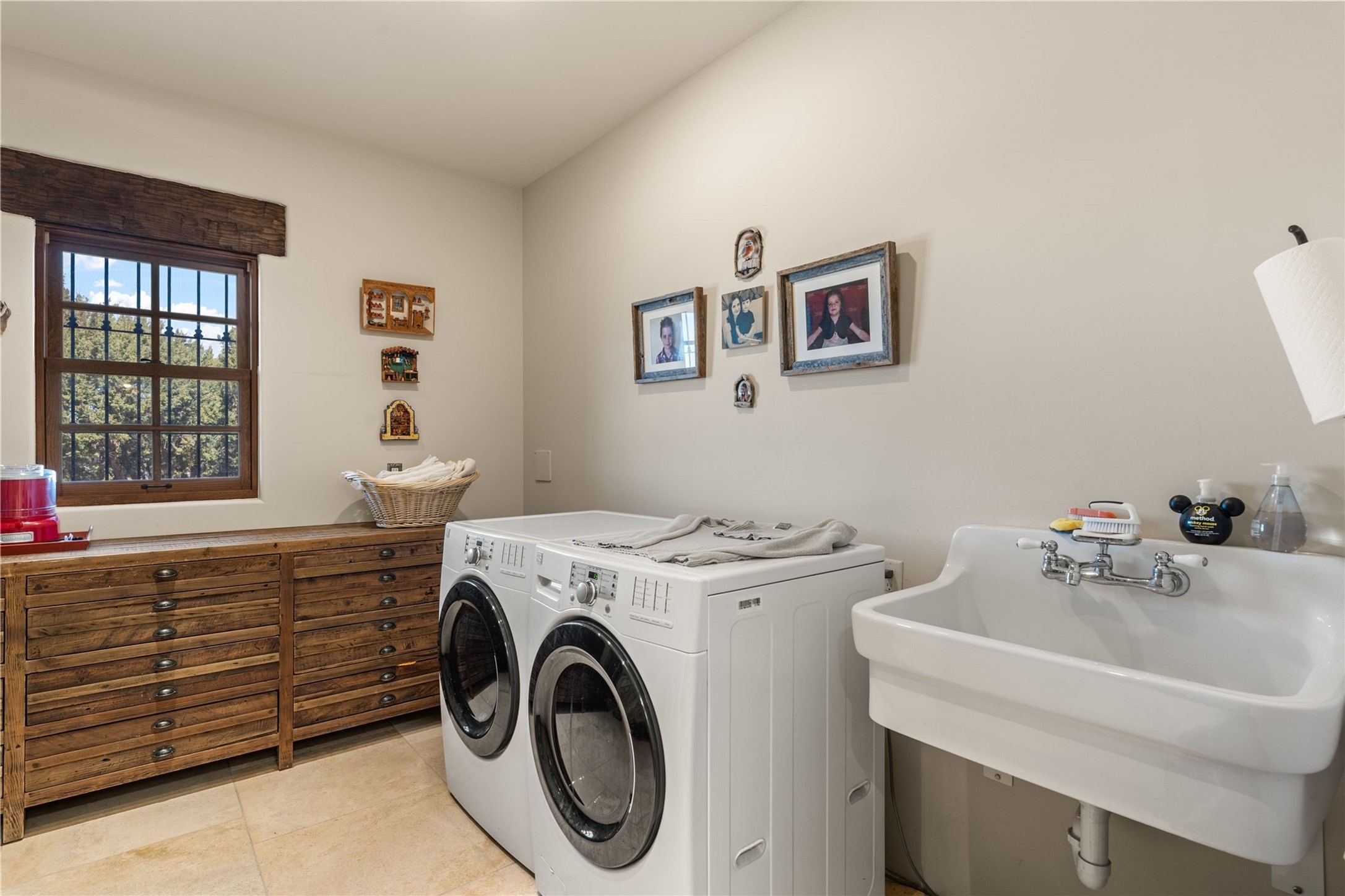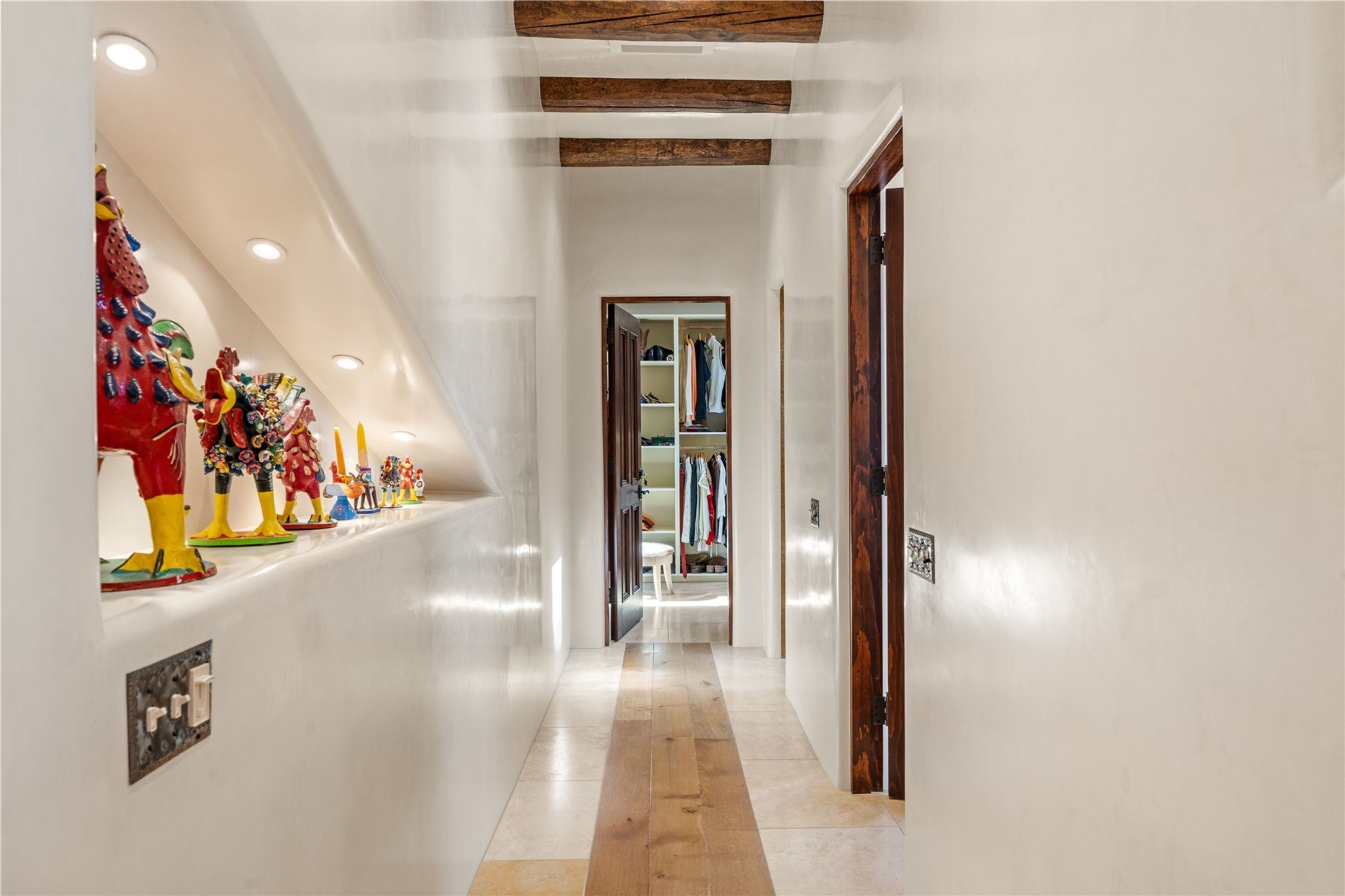 Reminiscent of a colonial hacienda, this impressive estate offers privacy, views, an adobe walled-in main residence and casita, plus a studio/guest house. Beautifully sited on nearly 10 acres (comprised of 2 separately deeded lots), and featuring the highest quality construction (double adobe in the main house). The Main house consists of 2 bedroom suites plus 2 half baths; the Casita consists of 2 bedrooms and 2 baths, and the Studio/Hogan has 1 bedroom,1 bath. There is an expansive portal and a roof top deck, 7 Fireplaces, private well and 12' and 15' Ceilings in public areas. This property is one of Santa Fe's finest.