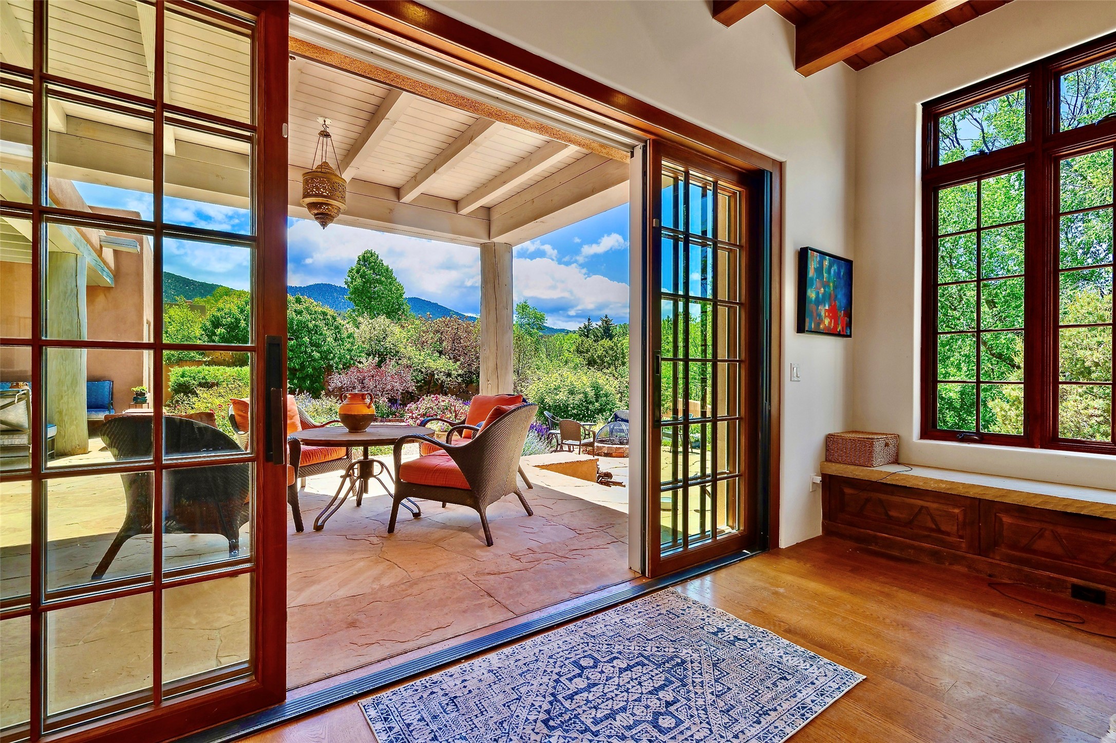 Within the city limits, the Santa Fe City Northeast neighborhood combines the convenience of location with the pleasures of quiet living. On every tree-lined street are examples of newer, award-winning architecture and well-established, older adobes. In addition to the famous Plaza, this area includes all the land reaching up to the Jemez and the Sandias. Newer developments appear on your left and right as you climb in altitude into the tree-studded Sangre de Christos. Historically this area was for many years the center of life in Santa Fe. On one side of the Plaza stretches the Palace of the Governors. Constructed in the early 17th century as Spain’s seat of government, the Palace of the Governors in Santa Fe chronicles and documents the history of the city, as well as New Mexico and the region. Stroll down East Palace Avenue past galleries, shops and lovely hotels.