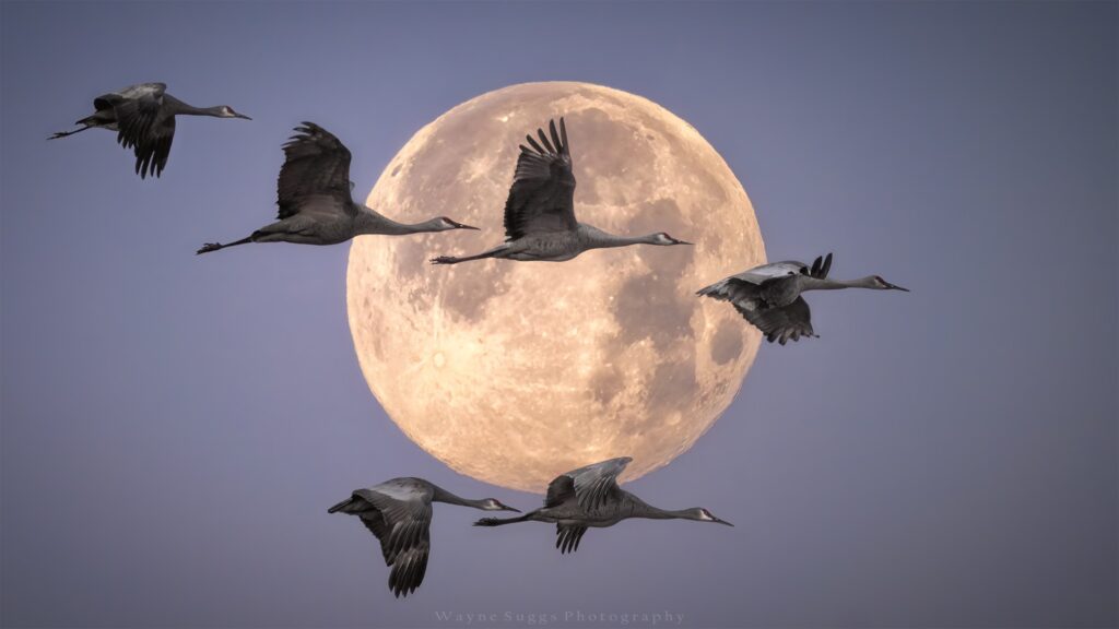 PHOTO: To Fly Across the Mountains of the Moon by Wayne Suggs Here’s an amazing capture of Sandhill cranes flying across a full moon. Wow! Image by Wayne Suggs. https://www.waynesuggsphotography.com/?fbclid=IwY2xjawJQAIJleHRuA2FlbQIxMAABHa5cgX3YKwTbxVr1w_zQkJjoZcguzaTd7tUx3I5WuJkT5FokQewwNfBgBg_aem_ifr7so0VlytF-g4bNyoR9g